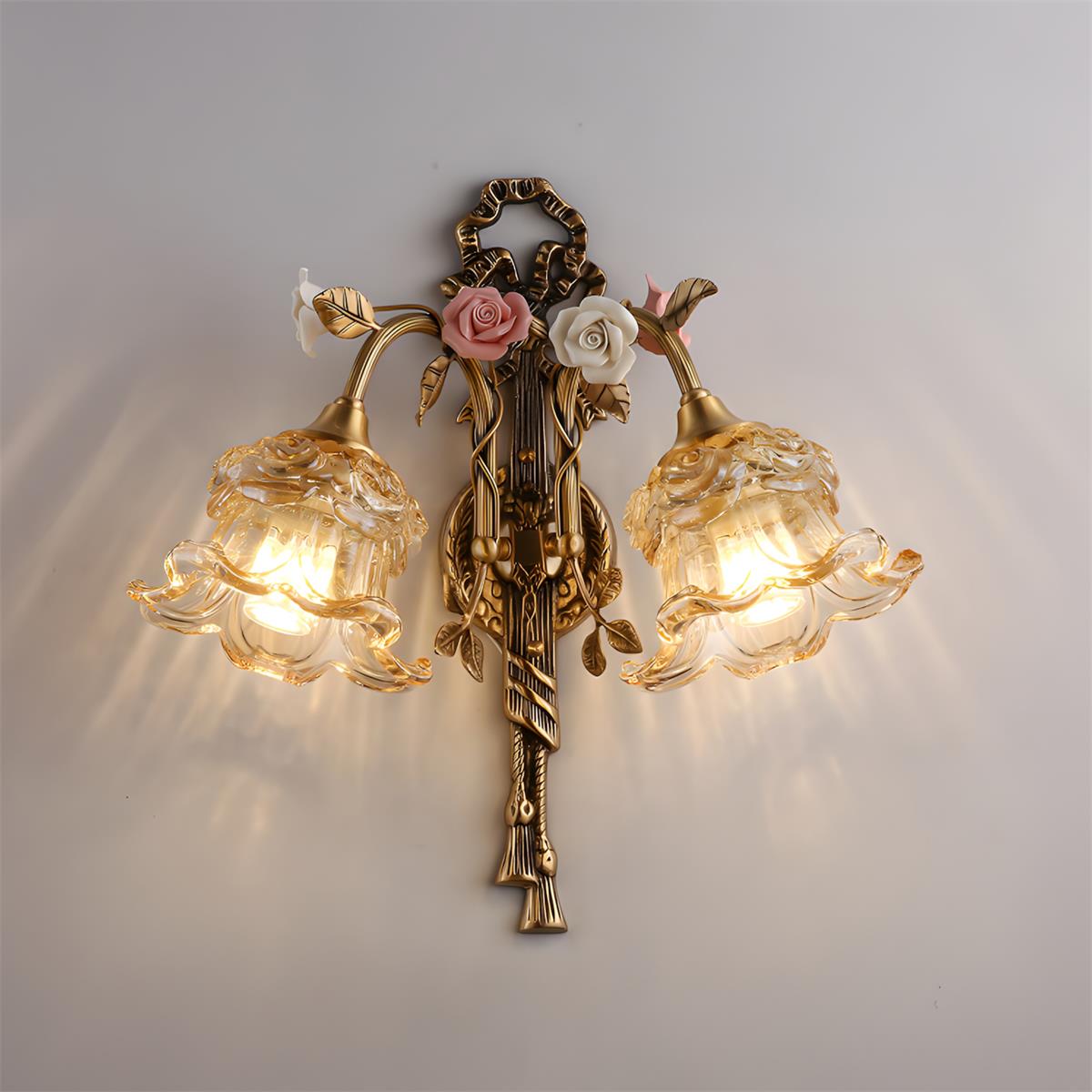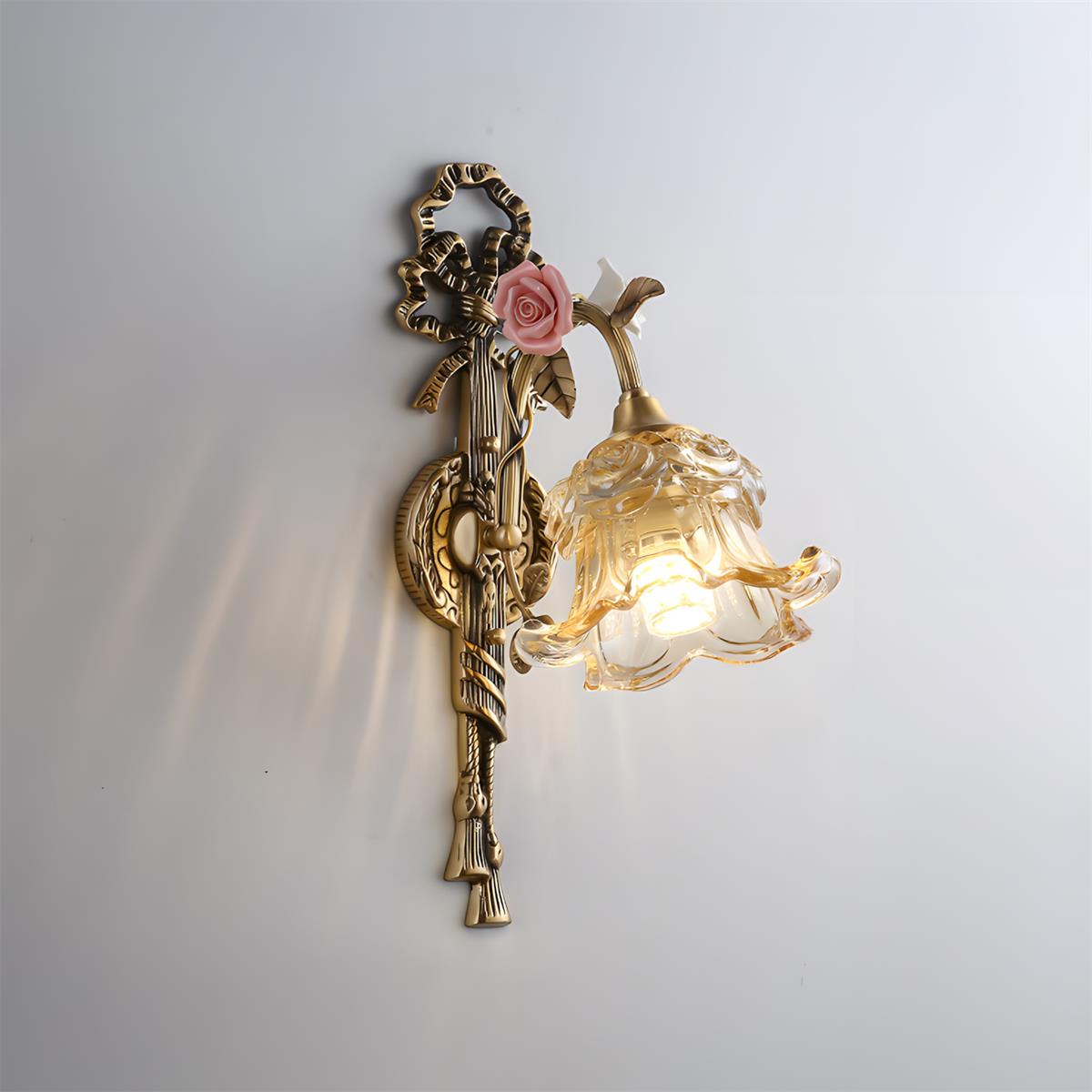Margaux Fleur Wall Lamp is a romantic ode to classic European ornamentation, where sculptural brass lines intertwine with delicate floral accents. Inspired by vintage garden motifs, its gracefully curved arm supports a hand-formed glass shade that blooms softly when illuminated, casting warm, layered light across the wall. Subtle rose details add a poetic focal point, balancing refinement with charm.