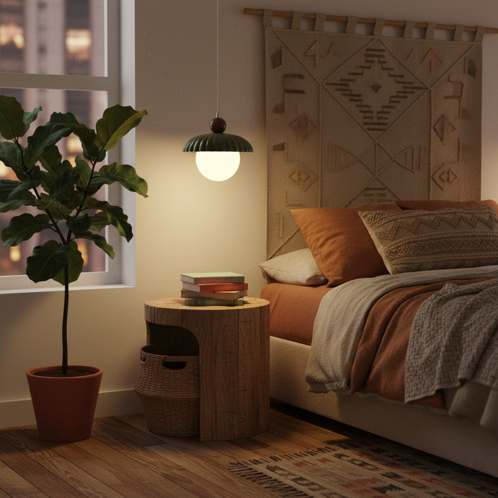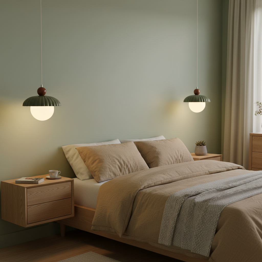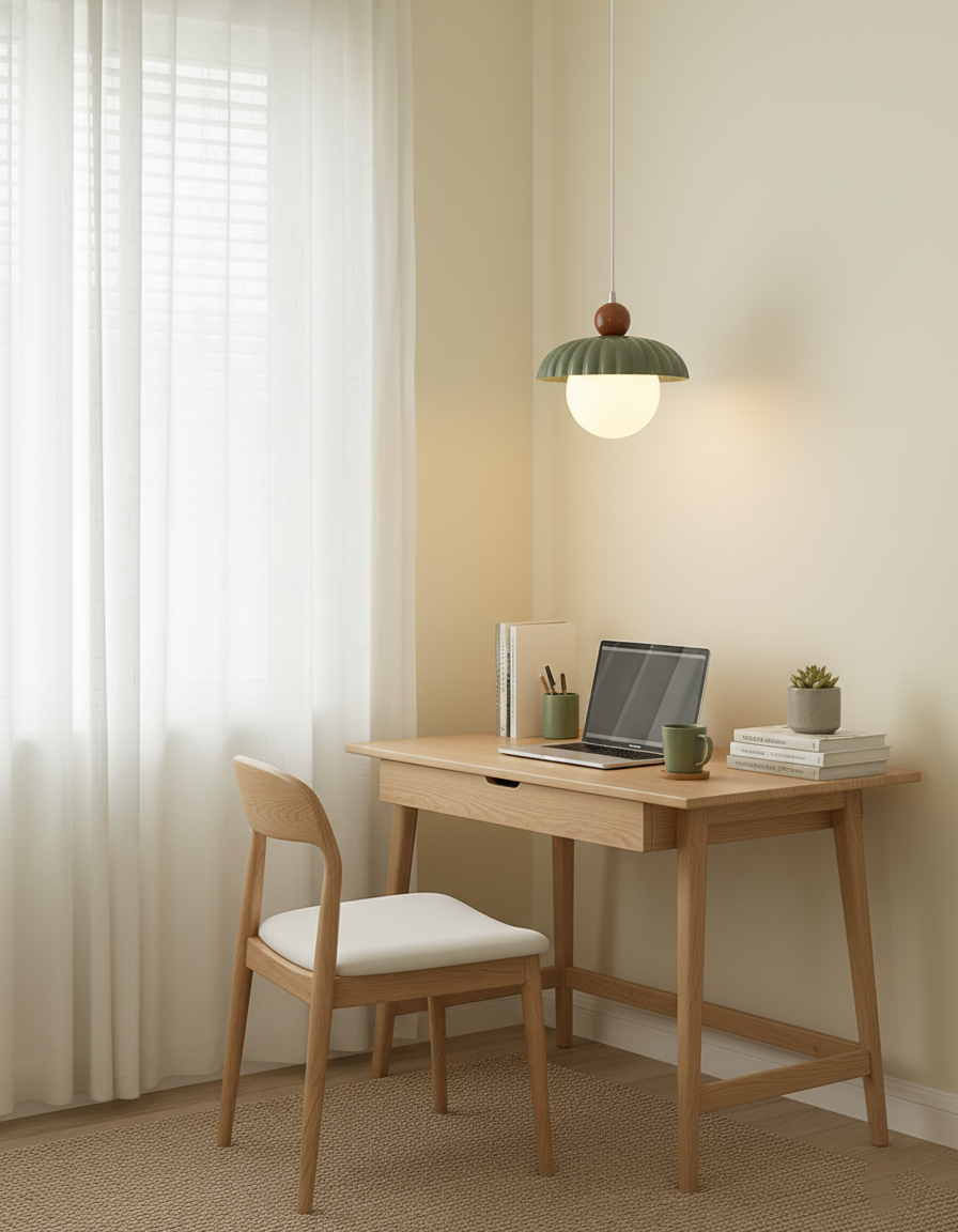 Illuminate your space with a touch of retro charm! This stunning Docos pendant light features a sleek, modern design with a green pleated shade and a warm, glowing orb at its center. The rich brown accent at the top adds a vintage flair, making it a perfect statement piece for both contemporary and traditional interiors.