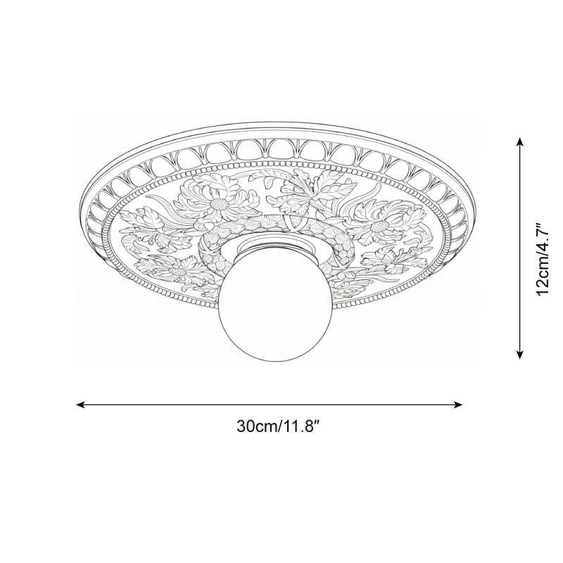 The Rochelle Relief Ceiling Lamp reinterprets classical grandeur with a touch of minimalist elegance. Its sculpted ceiling plate, adorned with intricate floral reliefs, evokes the artistry of European plasterwork, while the central exposed bulb introduces a modern simplicity that balances the ornate detailing. The result is a piece that bridges past and present—opulent yet understated, decorative yet functional.