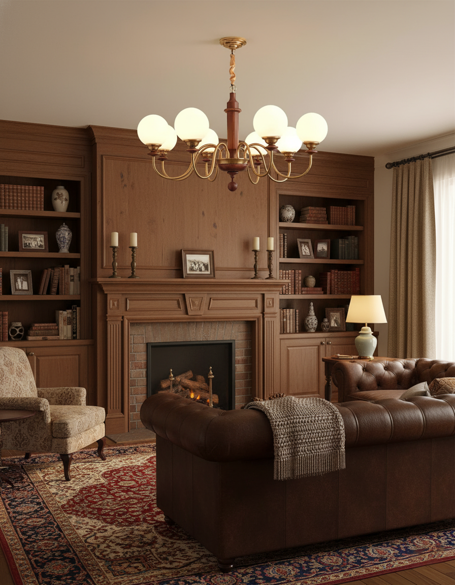 Introducing the Midas Chandelier, a stunning fusion of classic elegance and modern sophistication. This chandelier features gracefully curved arms adorned with sleek golden accents, complemented by globe-shaped opal glass shades that provide a soft, ambient glow. The combination of warm wood and refined metal elements creates a timeless piece that enhances any room with its luxurious design and captivating presence.