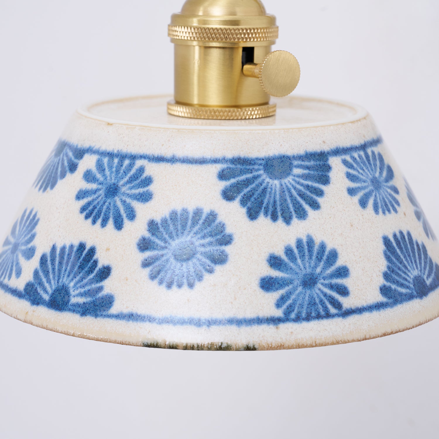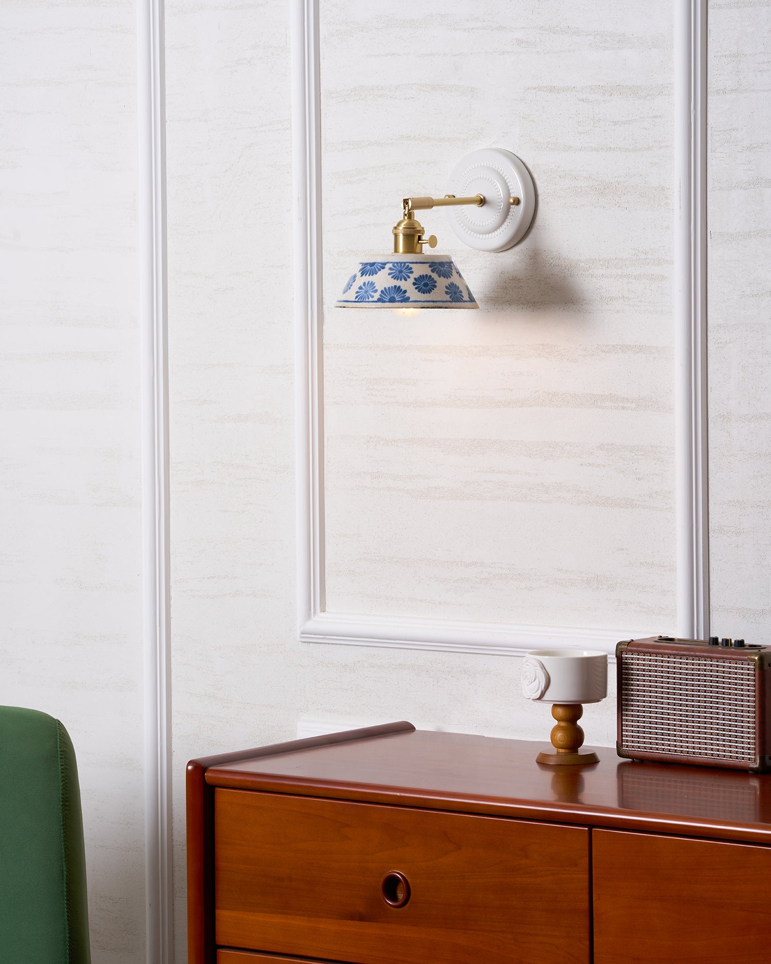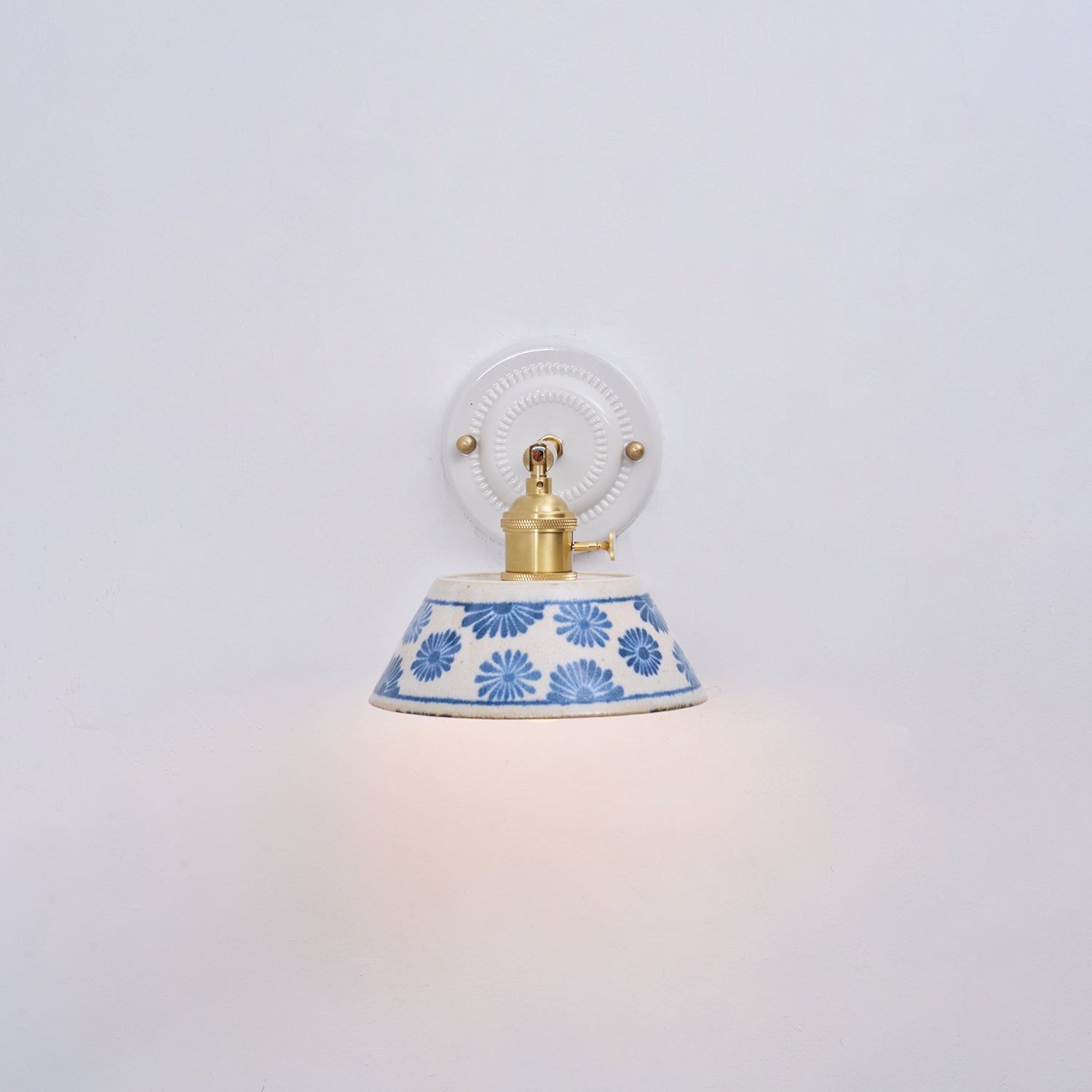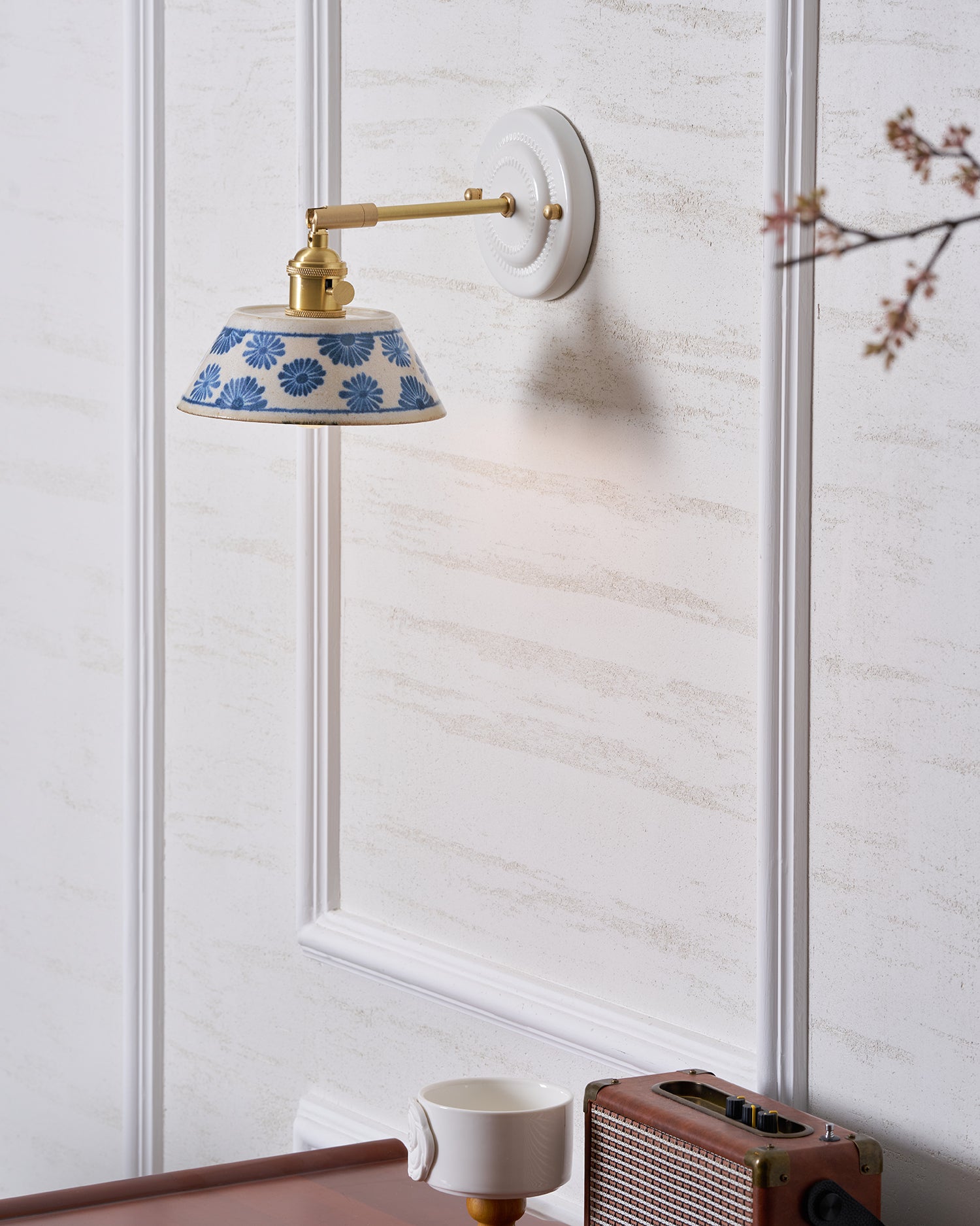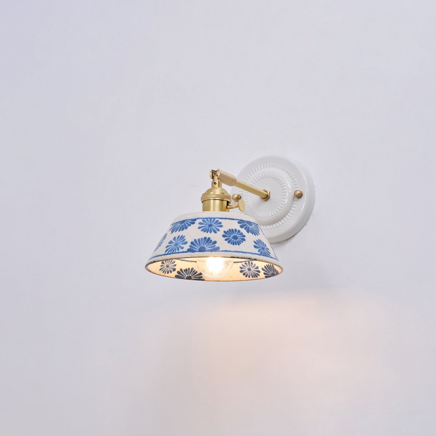 The Porcelain Indigo Wall Lamp blends timeless craftsmanship with quiet artistry. Its hand-glazed ceramic shade, adorned with delicate indigo floral motifs, evokes the charm of traditional pottery while casting a soft, inviting glow. Accented with brass hardware and a sculpted white base, the design feels both classic and refreshingly modern.