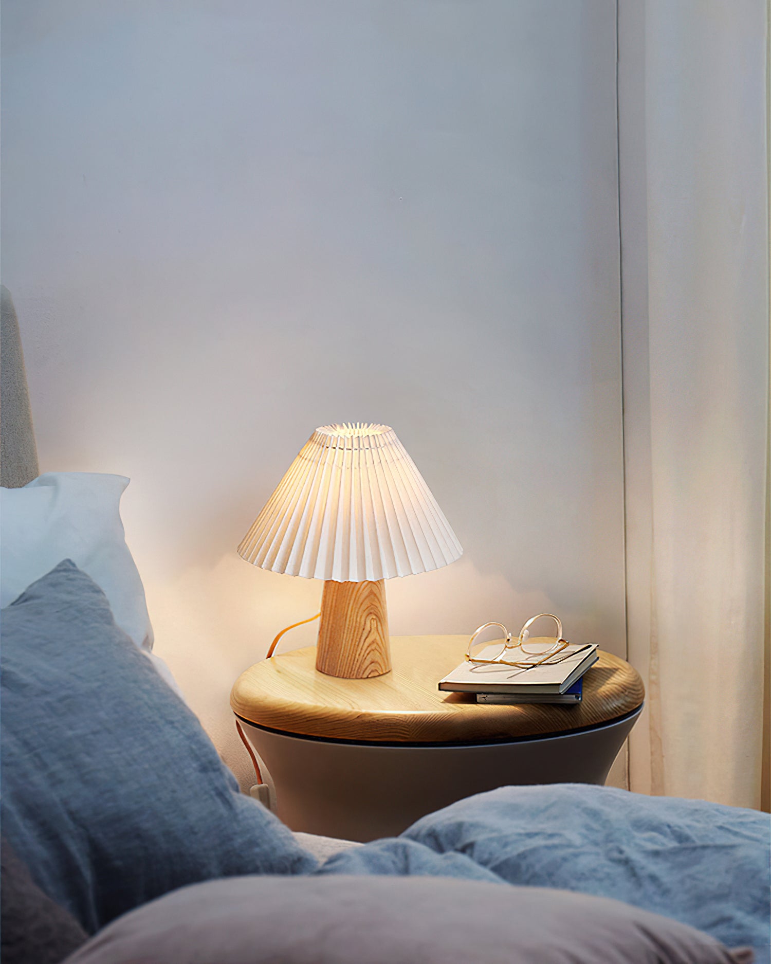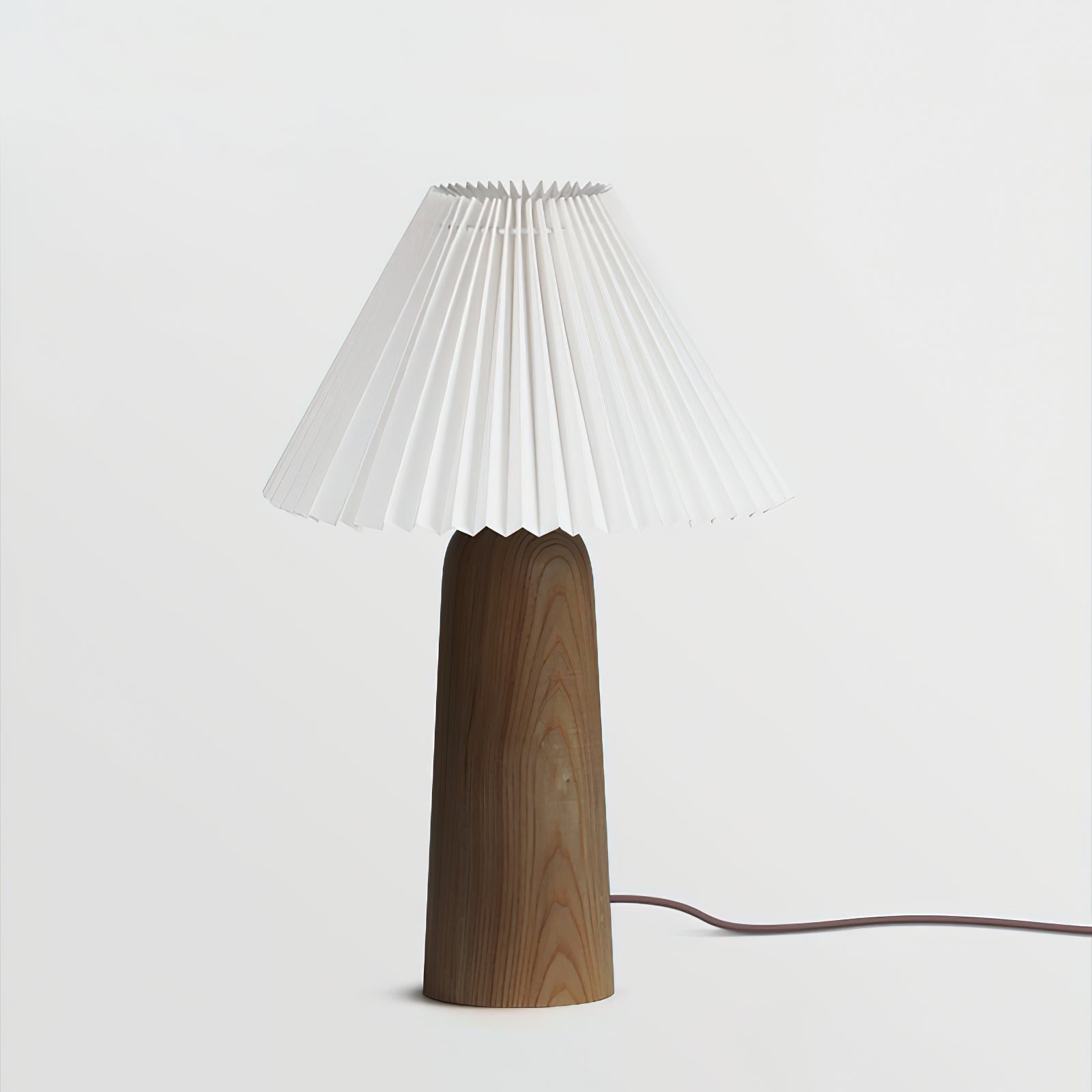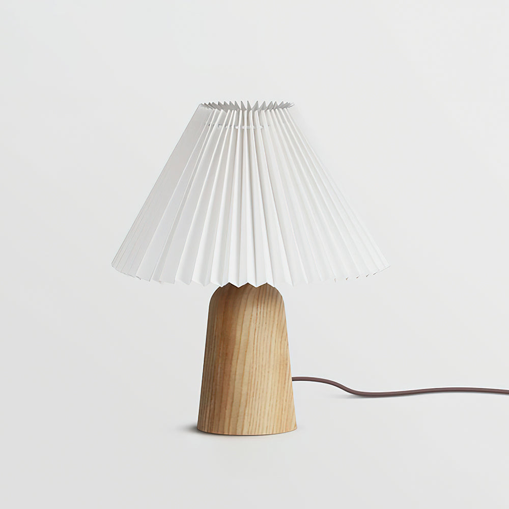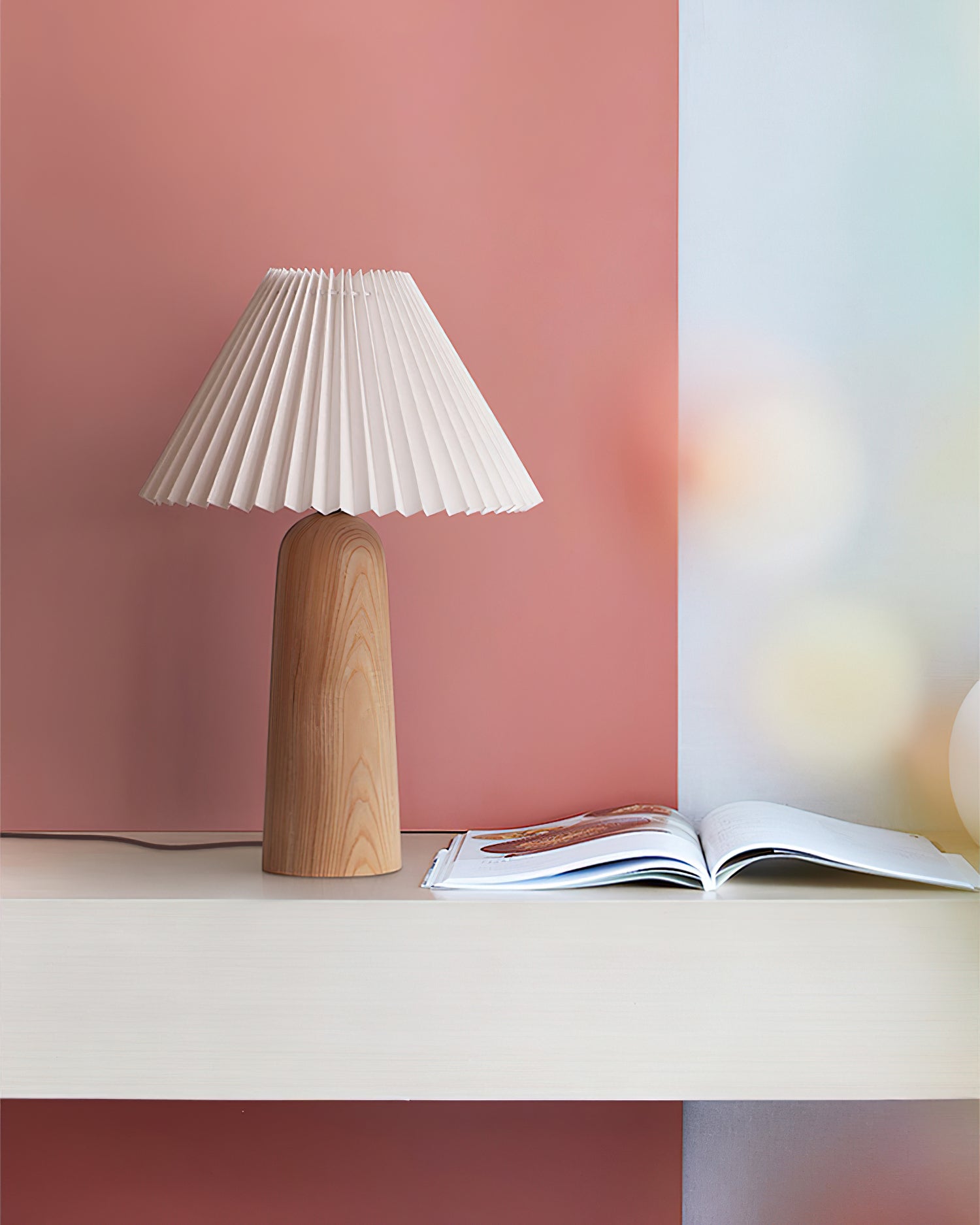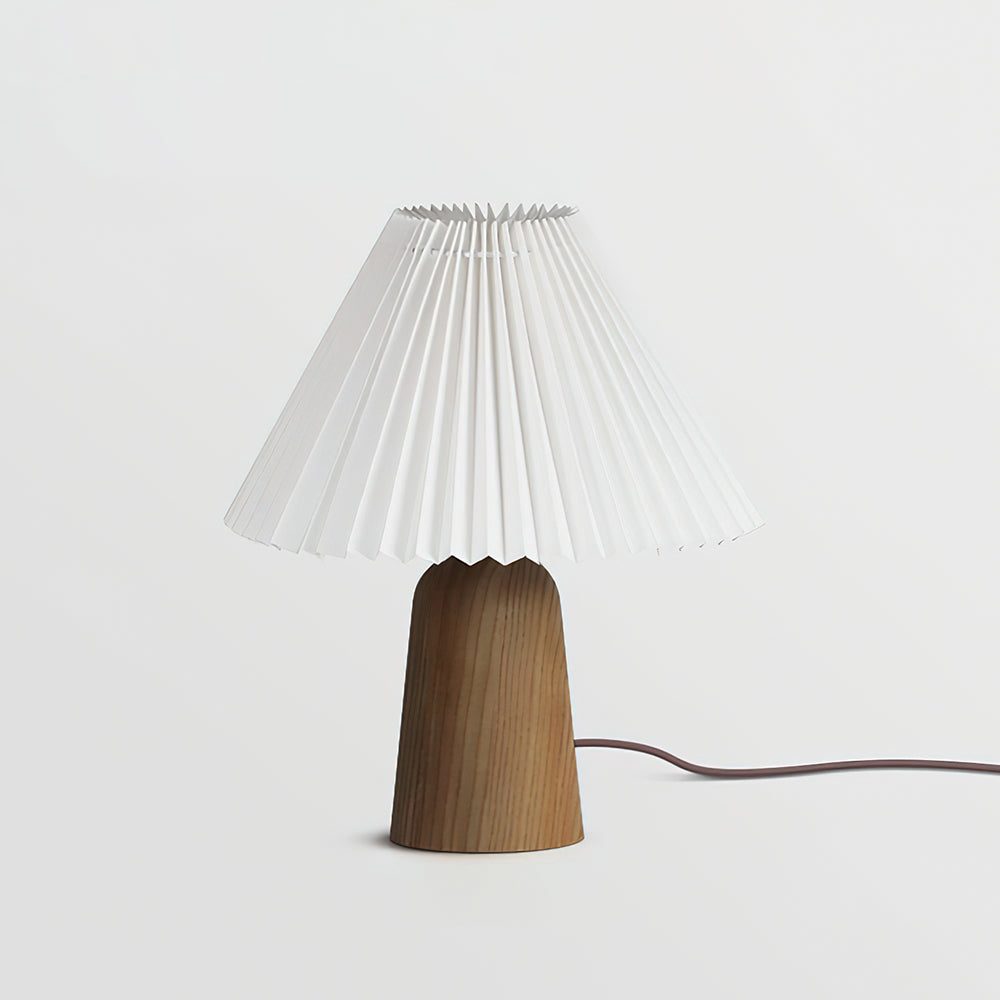 The Sylvan Pleat Table Lamp combines natural elegance with contemporary design. The lamp's pleated white shade, crafted from crisp, textured paper, creates a soft and inviting glow. Paired with a sleek, wooden base, its minimalistic design makes it a perfect addition to any modern or rustic-inspired space. The cylindrical wooden base, with its warm, organic tones, contrasts beautifully with the bright shade, offering a balance of light and structure.