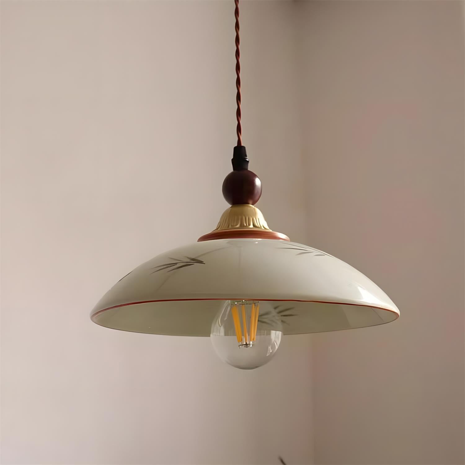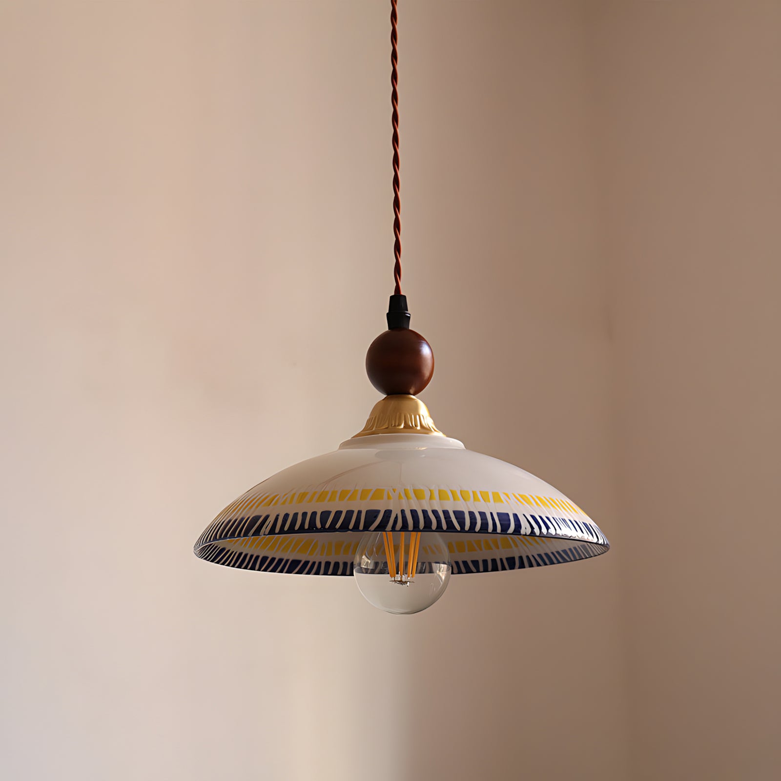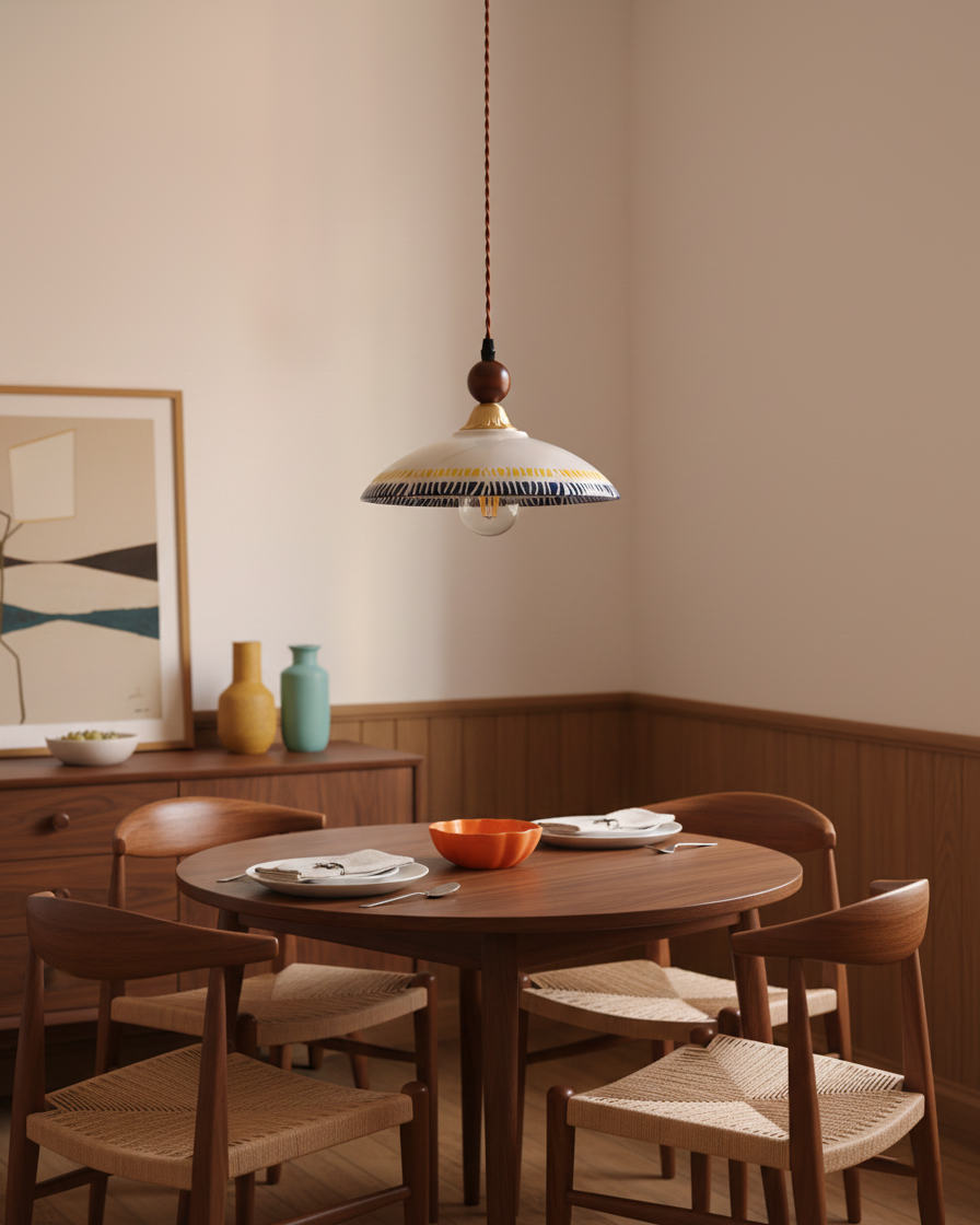 Avelin Pendant Lamp balances softness and structure through a gently domed silhouette accented with hand-applied graphic details. The smooth ceramic shade is paired with warm brass and a turned wooden element, creating a layered composition that feels both artisanal and timeless. Subtle patterns wrap the surface like quiet brushstrokes, adding visual interest without overpowering the form.