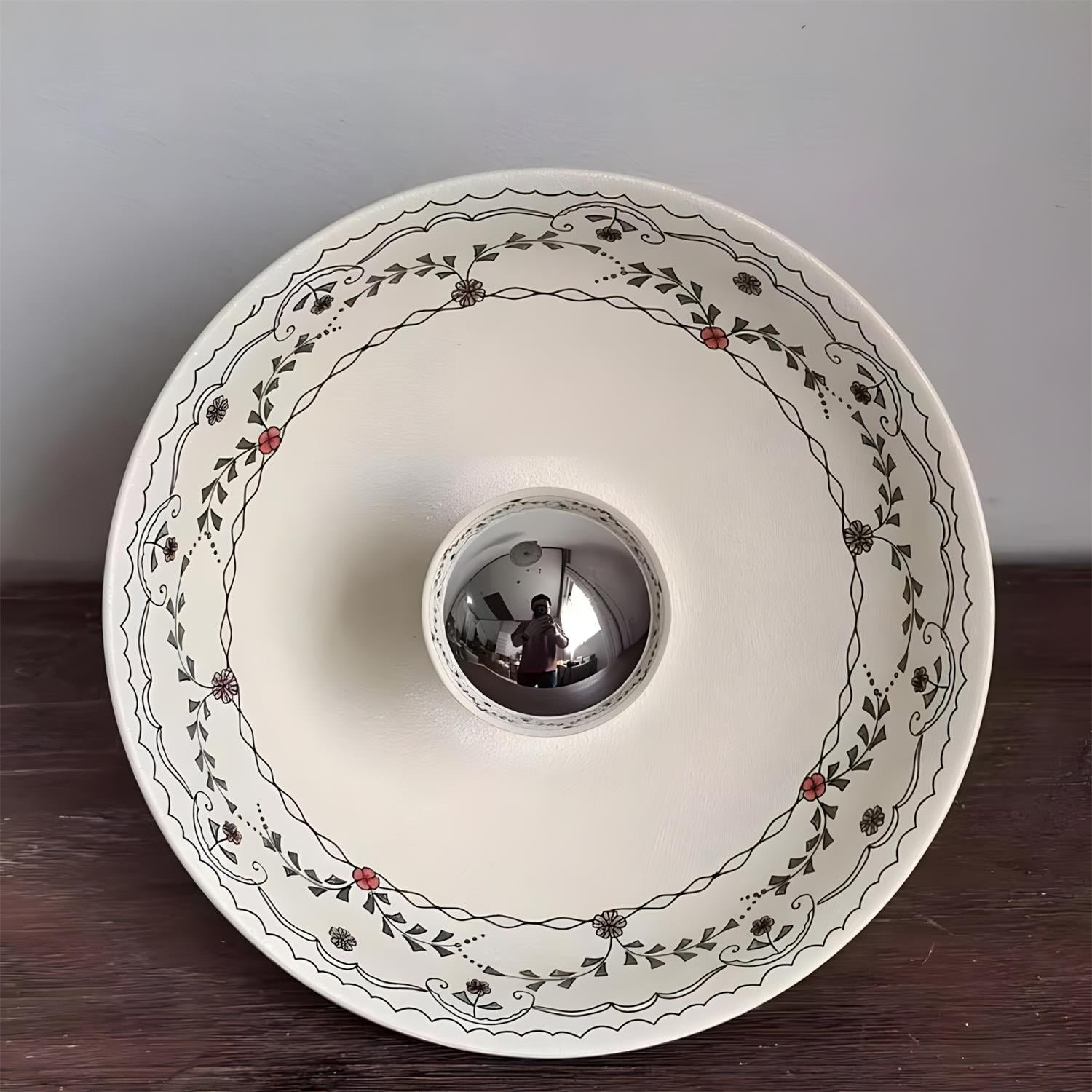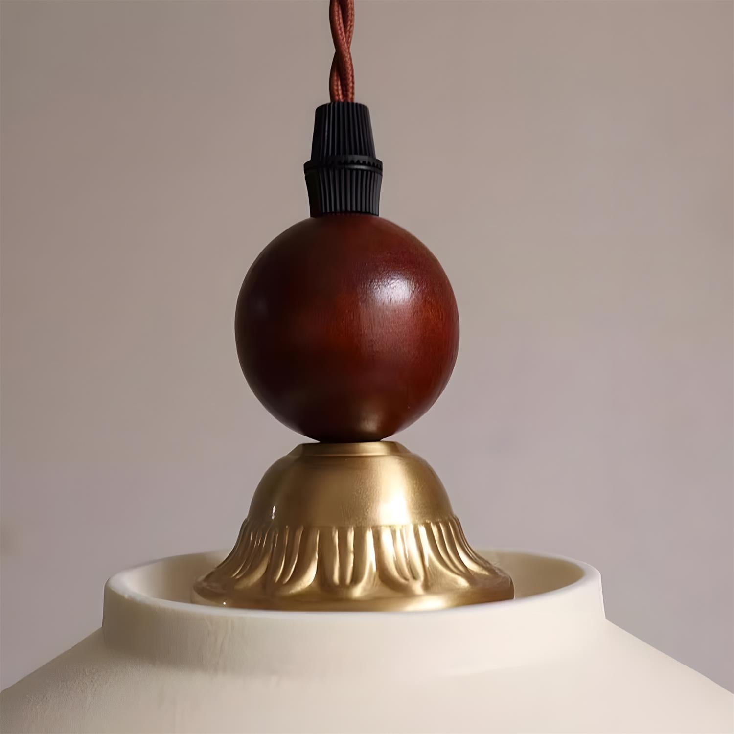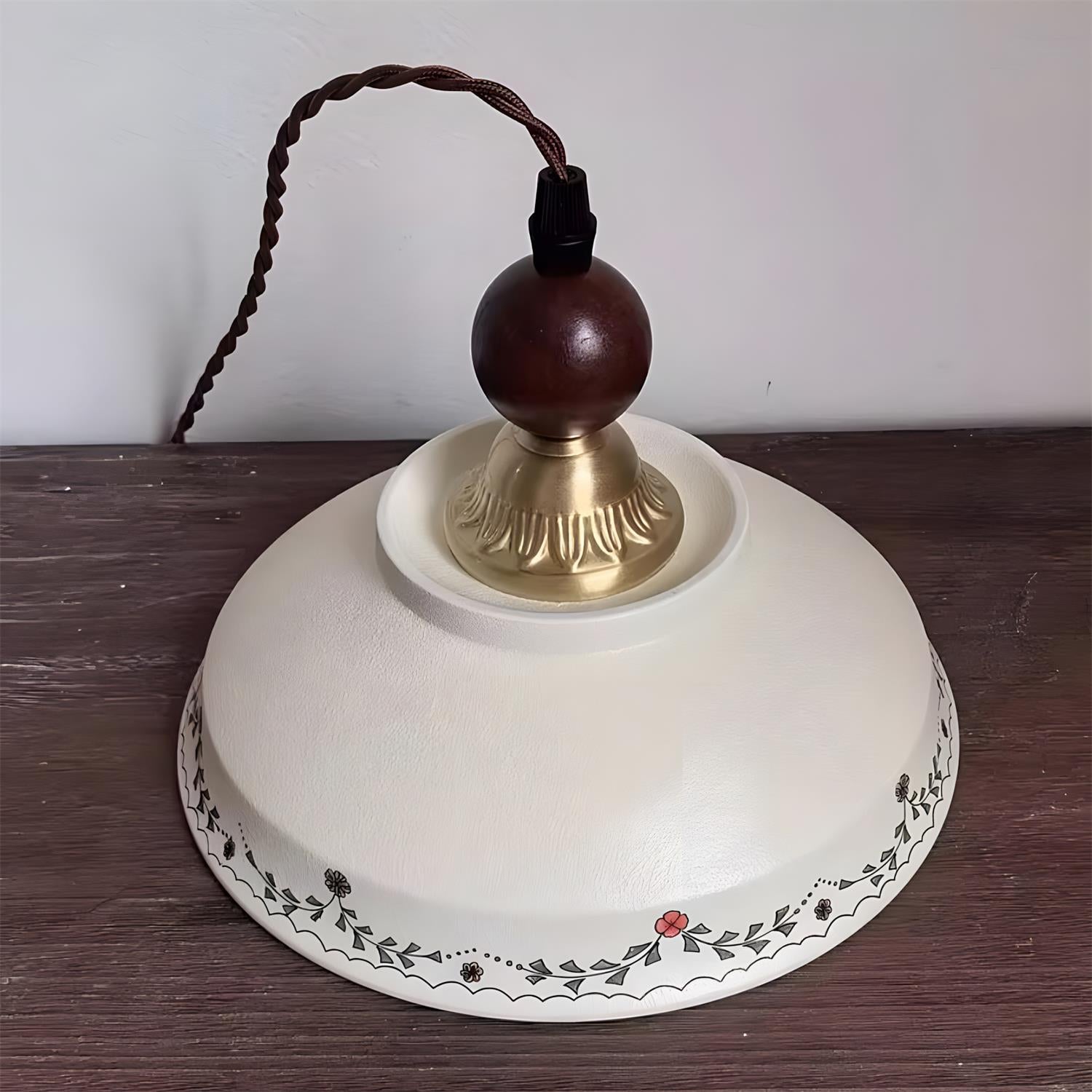 Virella Pendant Lamp blends artisanal detail with a softly nostalgic silhouette, creating a pendant that feels both intimate and refined. The gently flared ceramic shade is adorned with delicate botanical patterns along its edge, adding a subtle layer of craftsmanship without overwhelming the form. Warm brass accents and a polished wooden sphere introduce natural contrast, while the twisted fabric cord enhances its handcrafted character.