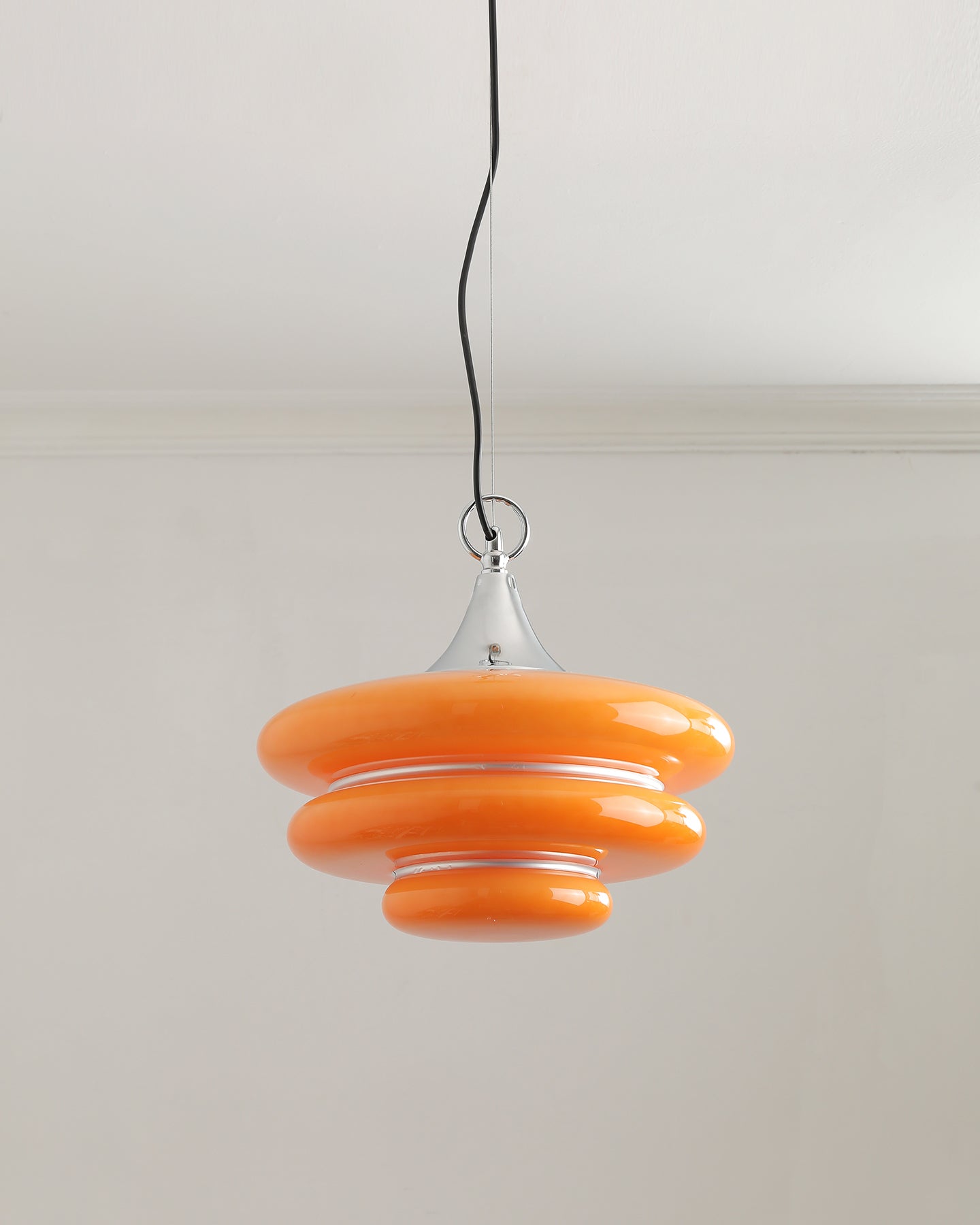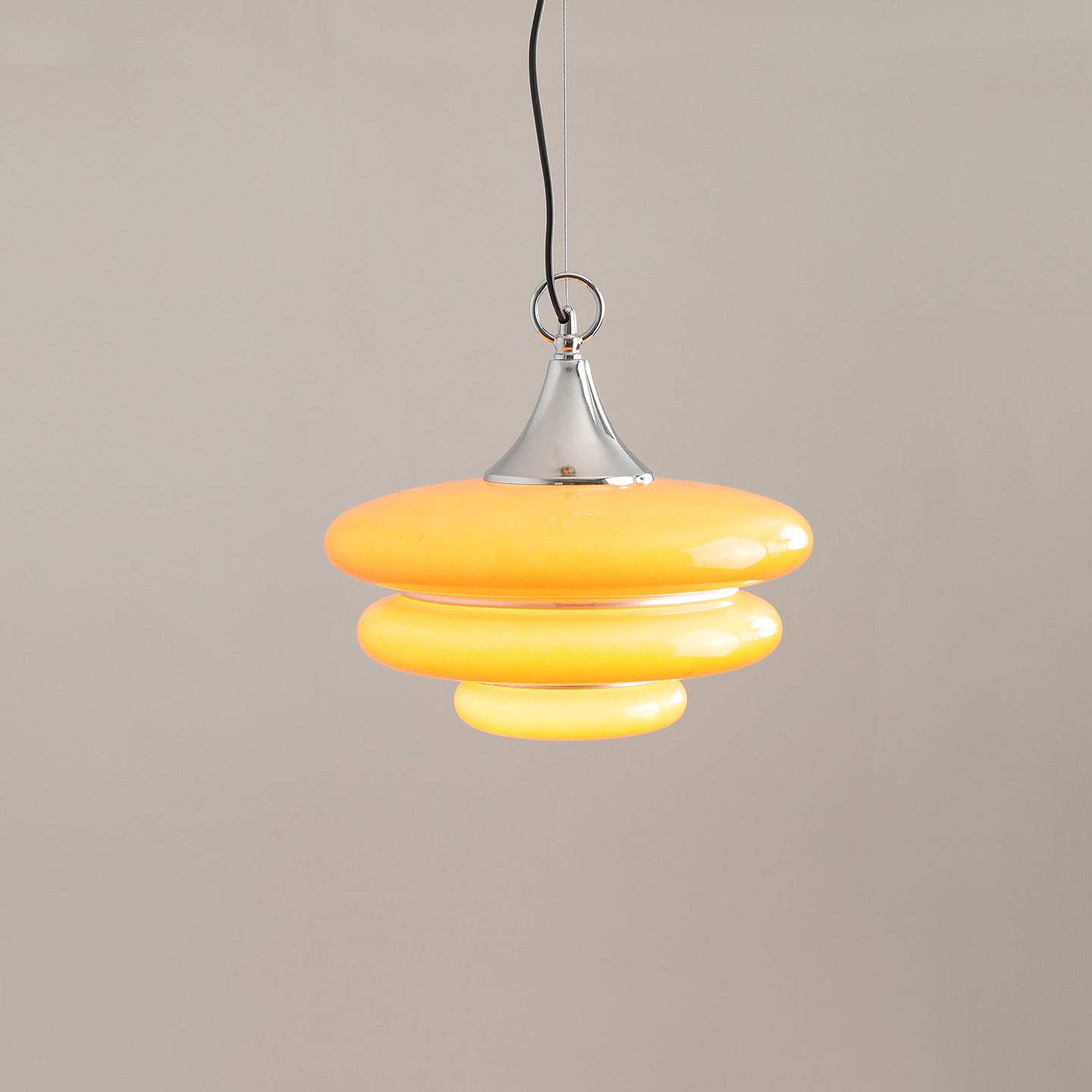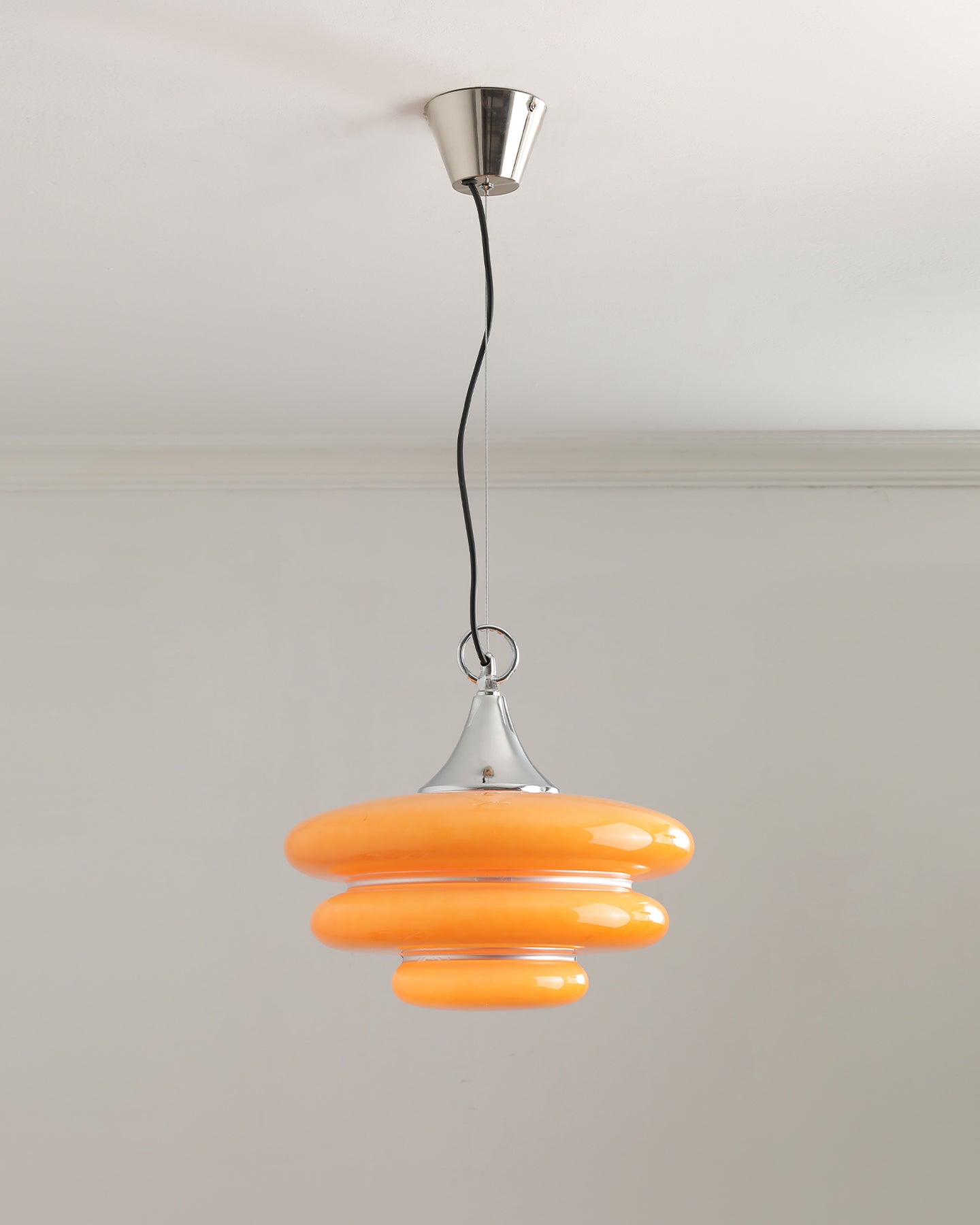 The Honeylite Pendant Lamp showcases a striking design with its stacked, smooth glass shades in a warm, honeyed hue. The combination of the soft, glossy curves and polished chrome accent creates a bold yet inviting aesthetic, ideal for enhancing modern dining rooms, kitchens, or living spaces. Its sculptural form and elegant silhouette not only provide functional lighting but also serve as a statement piece that adds both charm and character to any interior.
