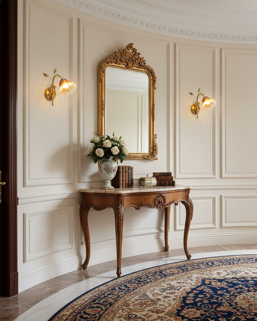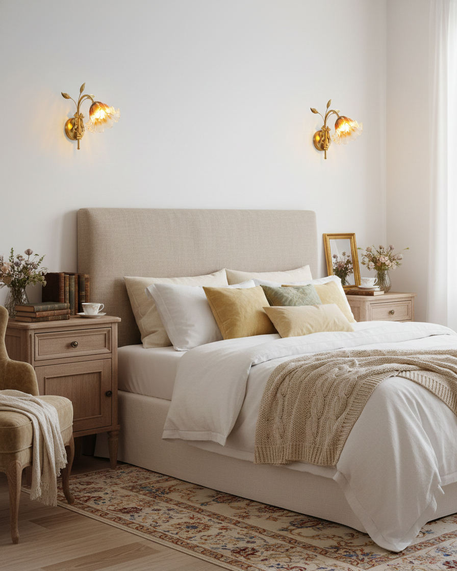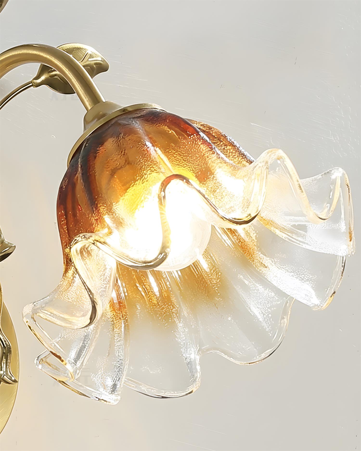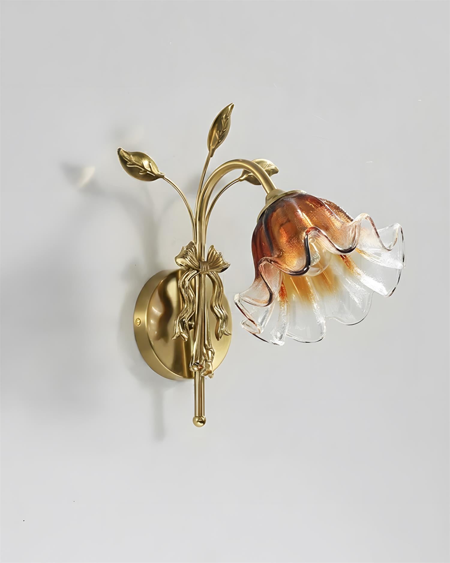 The Tender Glimmer Wall Lamp feels like a quiet moment captured in brass and glass. A slender, vine-inspired arm rises from the wall, finished in warm metal and detailed with delicate leaf motifs, as if gently growing outward. The hand-shaped glass shade opens like a soft blossom, blending clear and amber tones that diffuse light into a warm, intimate glow.