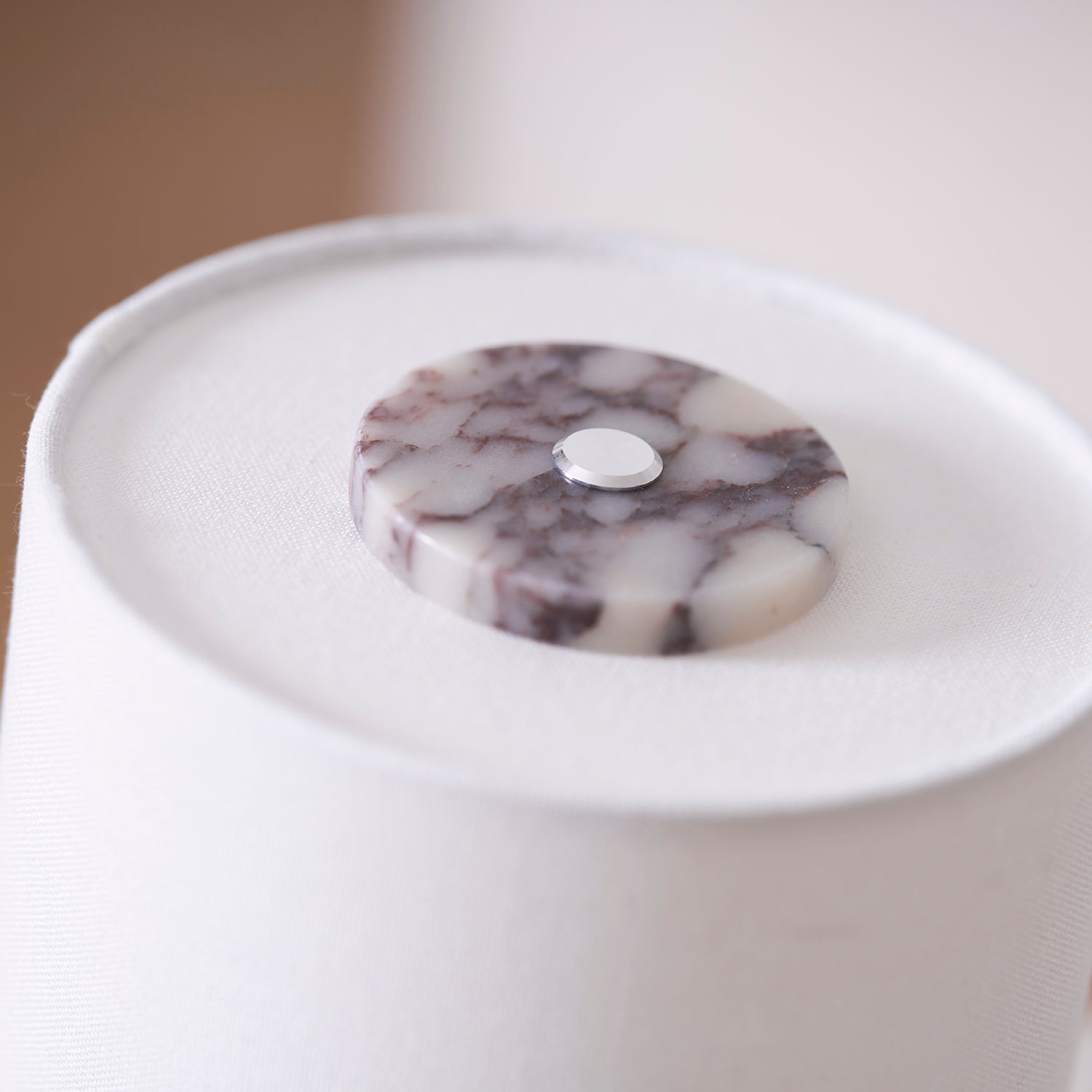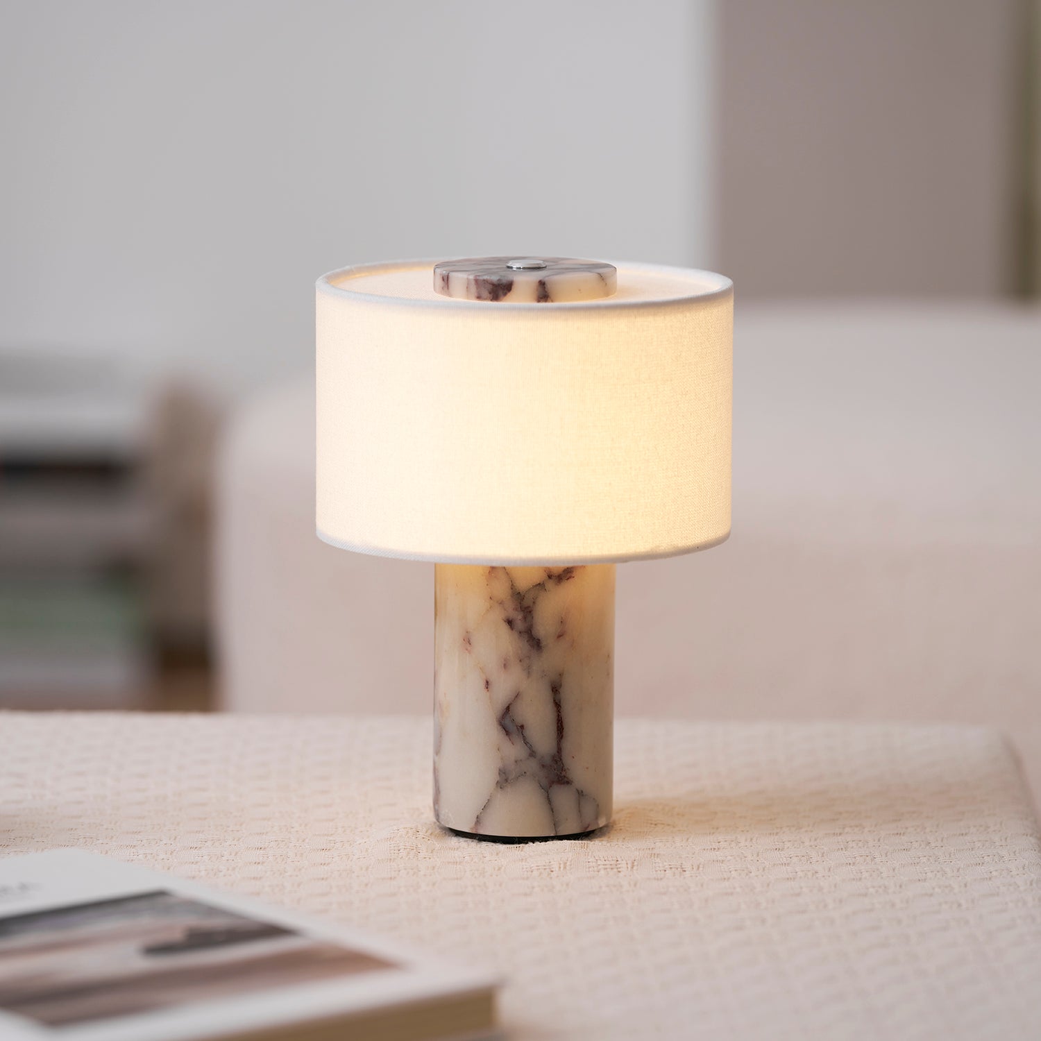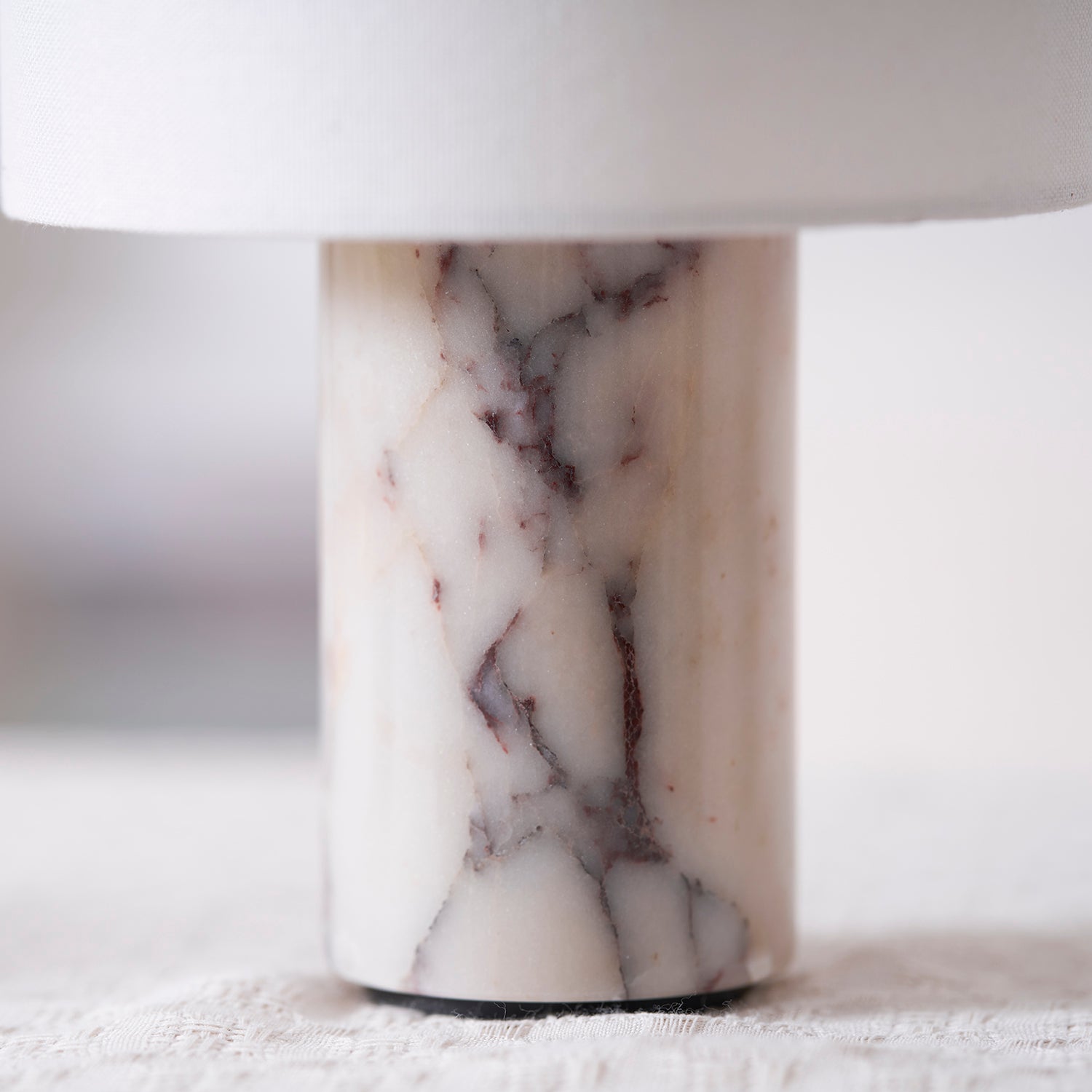 The Sediment Table Lamp draws inspiration from the quiet beauty of geological layers, translating natural stone textures into a refined, architectural form. Its cylindrical base—crafted from richly veined marble or travertine—anchors the design with a sense of weight and permanence, while the softly glowing fabric shade introduces warmth and balance. Clean lines and restrained proportions allow the materials to speak for themselves, creating a calm visual rhythm that feels both modern and timeless.