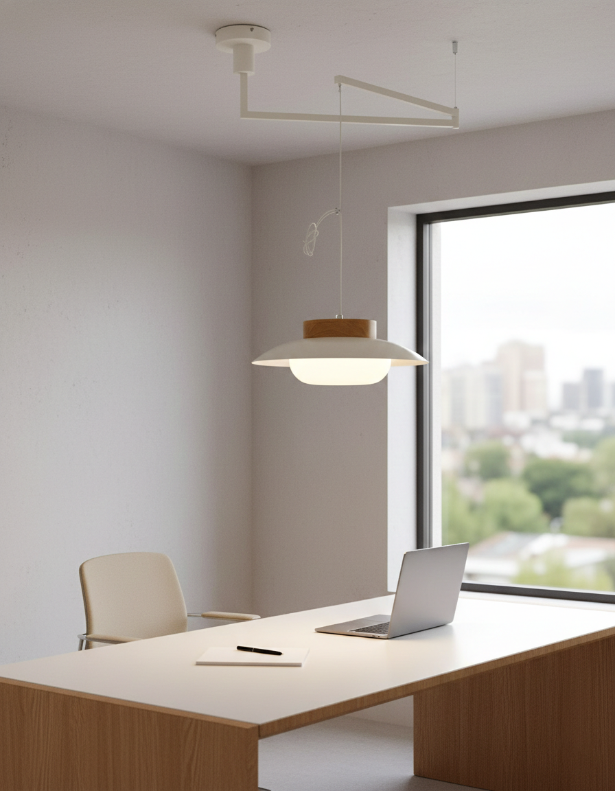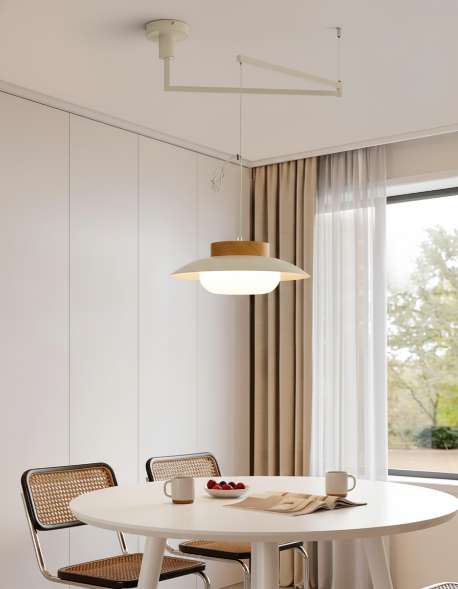 The Sima Swing Arm Pendant Lamp blends natural warmth with modern versatility, featuring a smooth wooden accent paired with a soft green shade and a glowing opal diffuser. Suspended from an adjustable swing arm, its design offers both function and artistry, creating a balanced interplay of light, texture, and form that enhances dining spaces, work corners, or cozy reading nooks with effortless elegance.