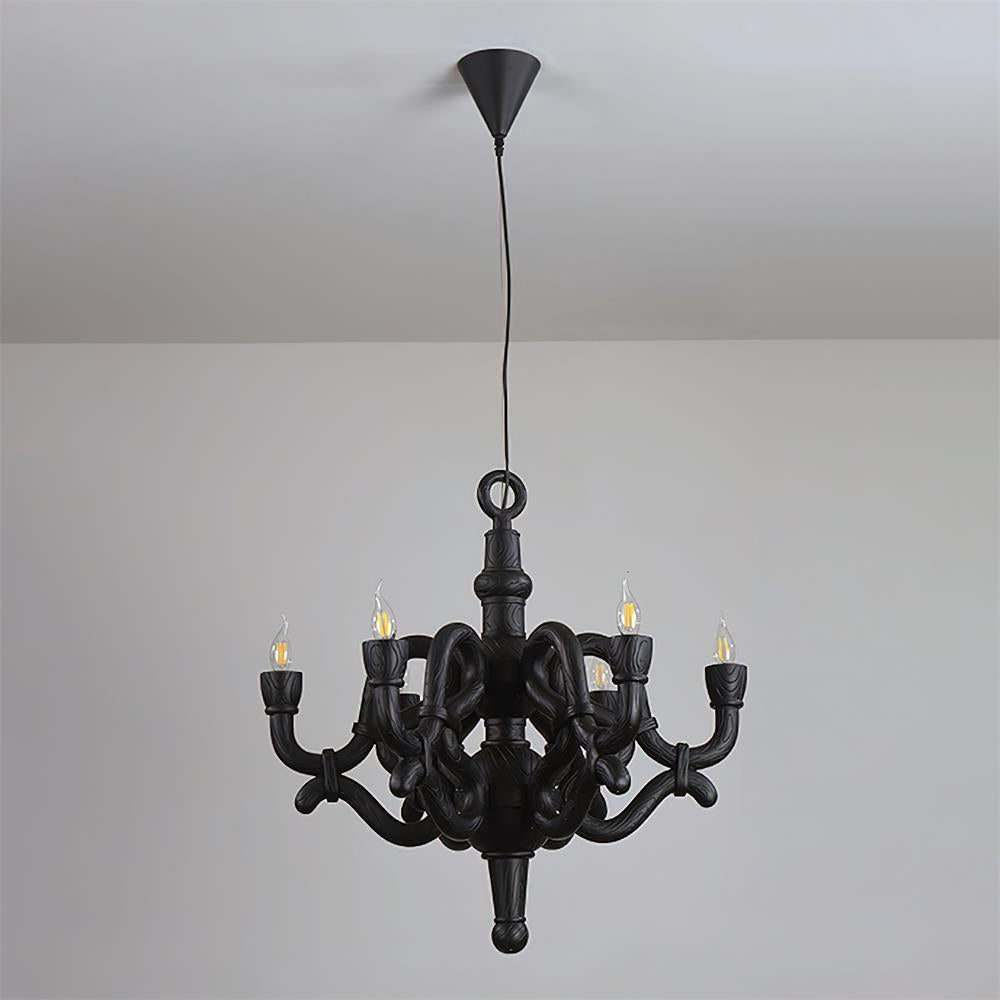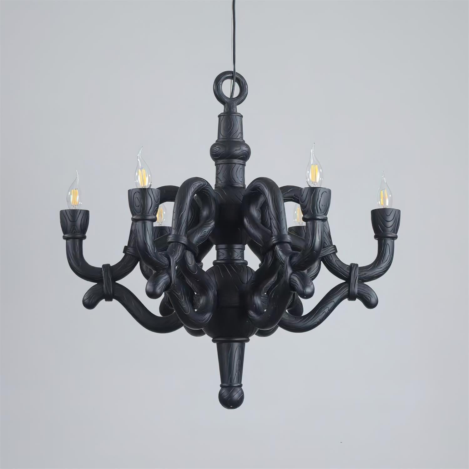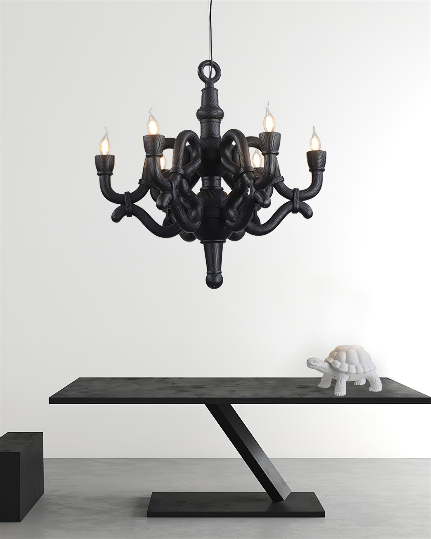 Boldly sculptural and playfully baroque, the Nocturne Chandelier reimagines the classic candelabra with a surreal, modern twist. Its flowing arms, carved with a faux bois texture and knotted like velvet ribbons, evoke both whimsy and strength—an expressive dance between structure and spontaneity. Available in striking matte black or luminous white, it transforms any space into a statement of artistic intent.