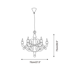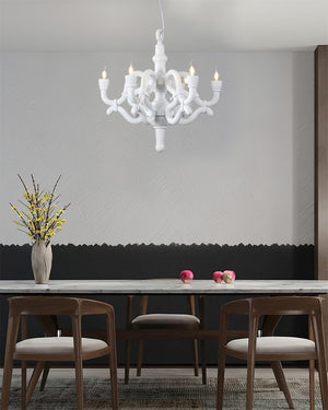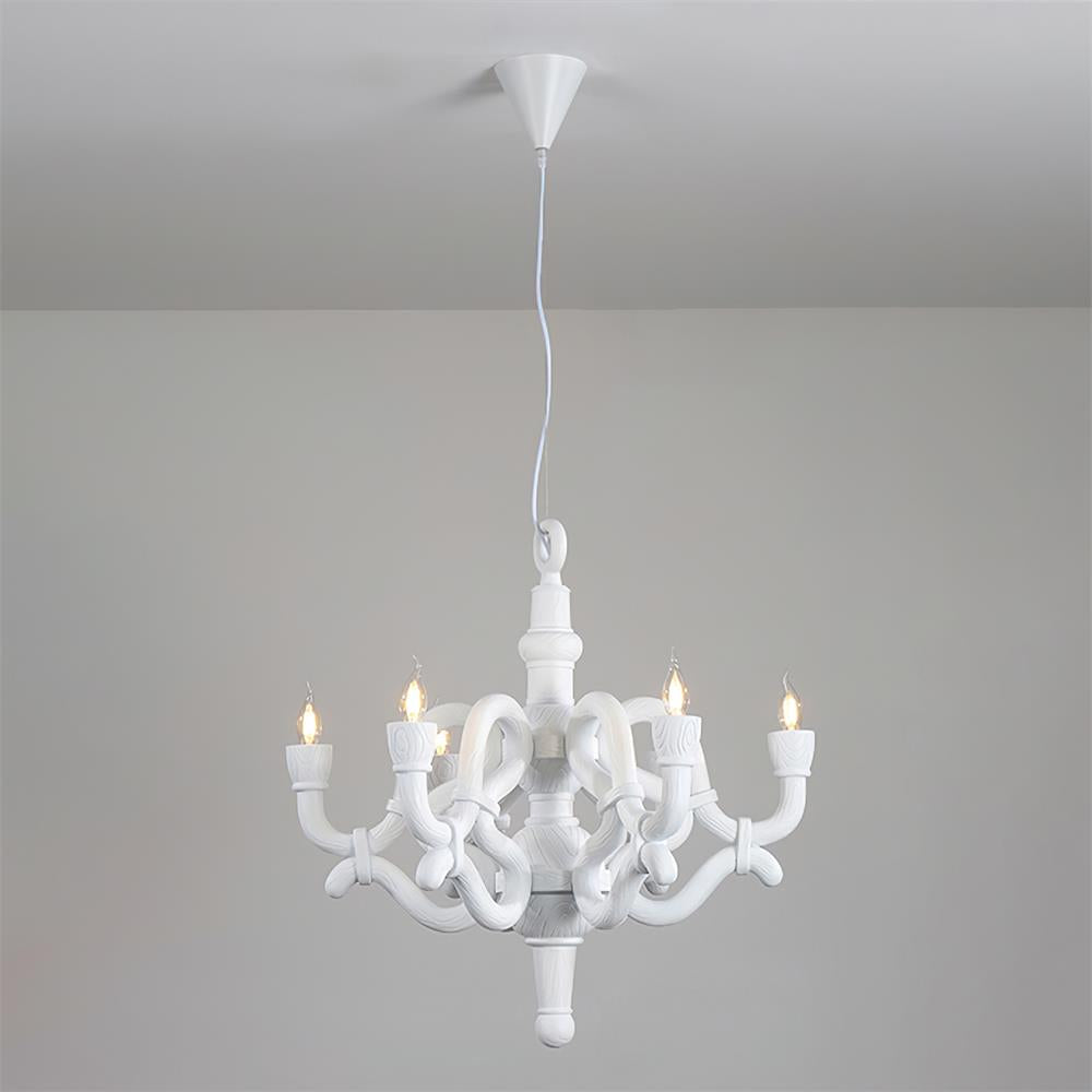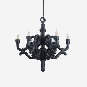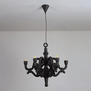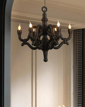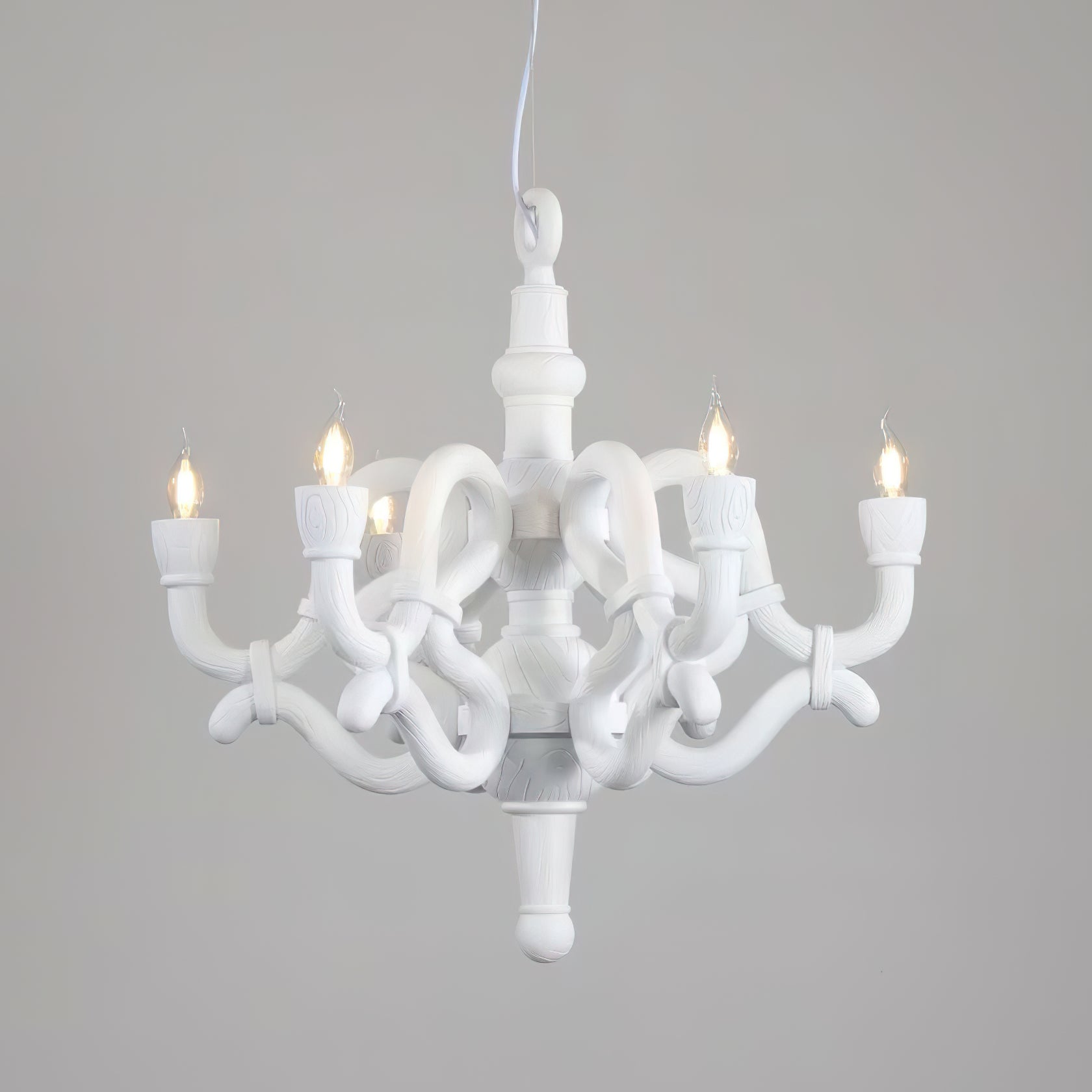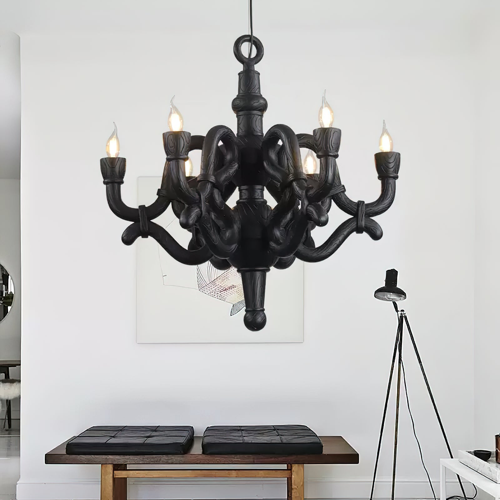 Boldly sculptural and playfully baroque, the Nocturne Chandelier reimagines the classic candelabra with a surreal, modern twist. Its flowing arms, carved with a faux bois texture and knotted like velvet ribbons, evoke both whimsy and strength—an expressive dance between structure and spontaneity. Available in striking matte black or luminous white, it transforms any space into a statement of artistic intent.