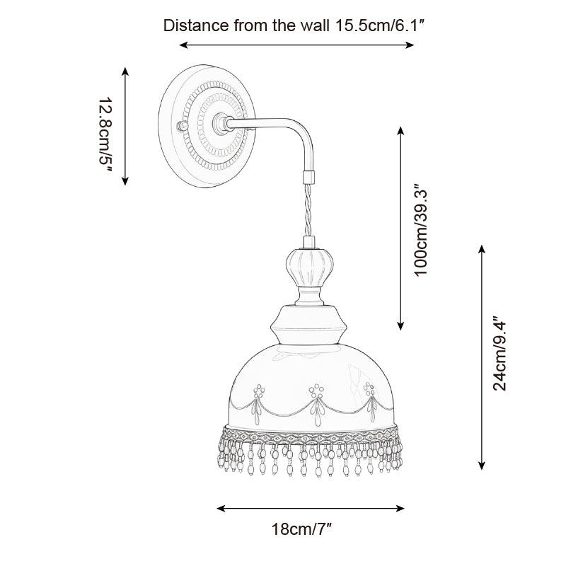 The Celine Wall Lamp blends vintage charm with refined craftsmanship, offering a timeless accent for intimate interiors. Its scalloped ceramic shade, adorned with delicate brown edging, evokes the elegance of classic European design, while brass detailing and a twisted fabric cord add a warm, nostalgic touch. The soft, downward glow creates a cozy and romantic ambiance—perfect for bedside walls, hallways, or reading nooks.