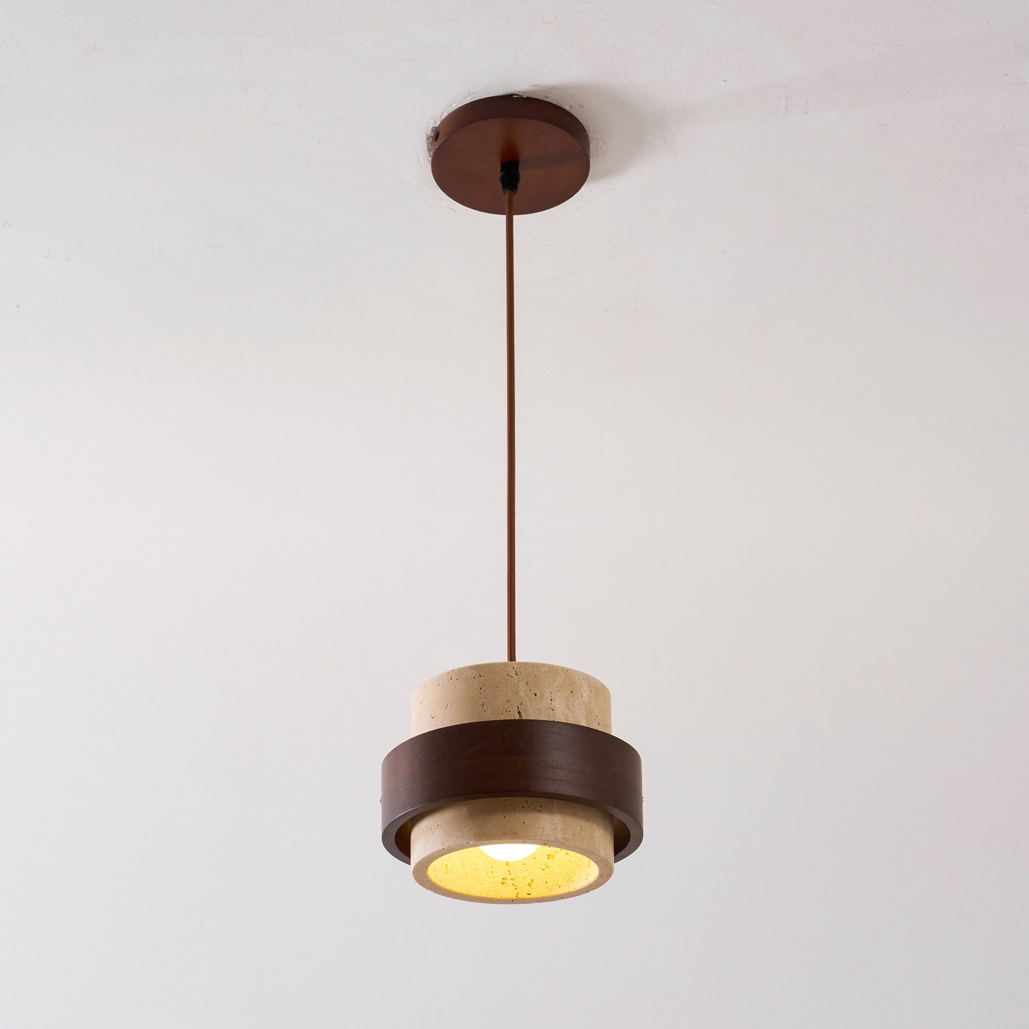 The Cole Travertine Pendant Lamp, a stunning combination of natural elegance and industrial design. This unique lamp features a cylindrical shade made from genuine travertine stone, showcasing its intrinsic patterns and warm, earthy tones. Encircled by a Walnut Wood band that adds a contemporary edge, the lamp is designed to cast a soft, ambient glow, enhancing the visual texture of the stone. This lamp not only lights up a space but also serves as a centerpiece that effortlessly blends rustic materials with modern architecture.