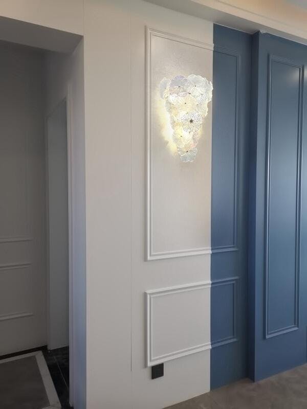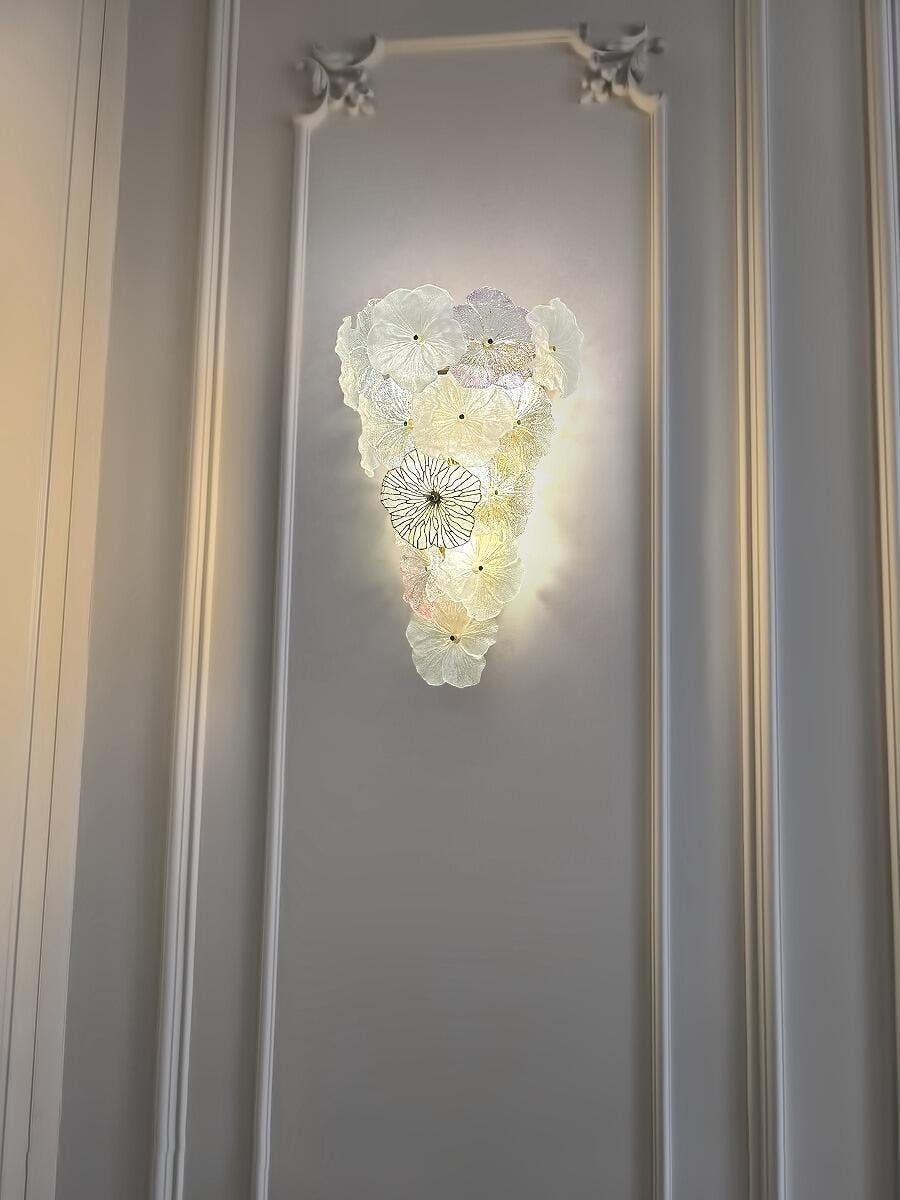 A poetic blend of art and illumination, the Elaria Wall Lamp captures the delicate beauty of blooming florals in sculpted glass. Each petal-like disc is crafted with subtle textures and soft gradients—ranging from crystalline transparency to misty pastels and shimmering gold—evoking the ephemeral charm of spring blossoms caught in golden light.