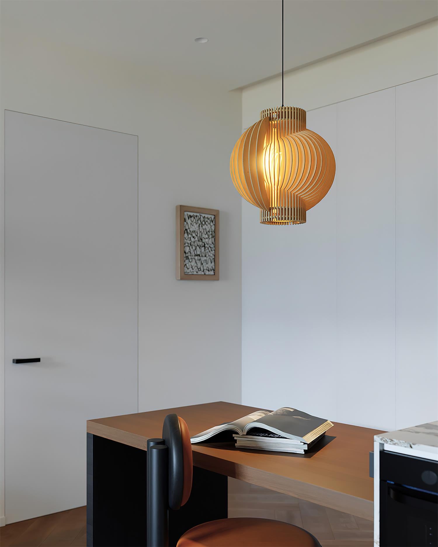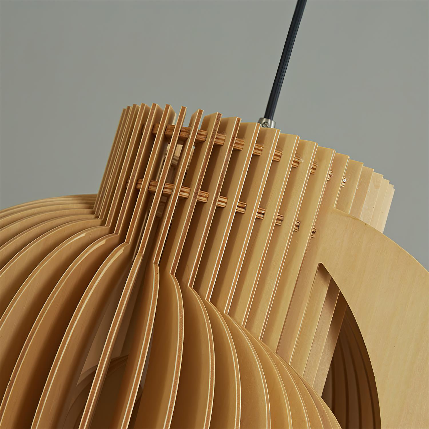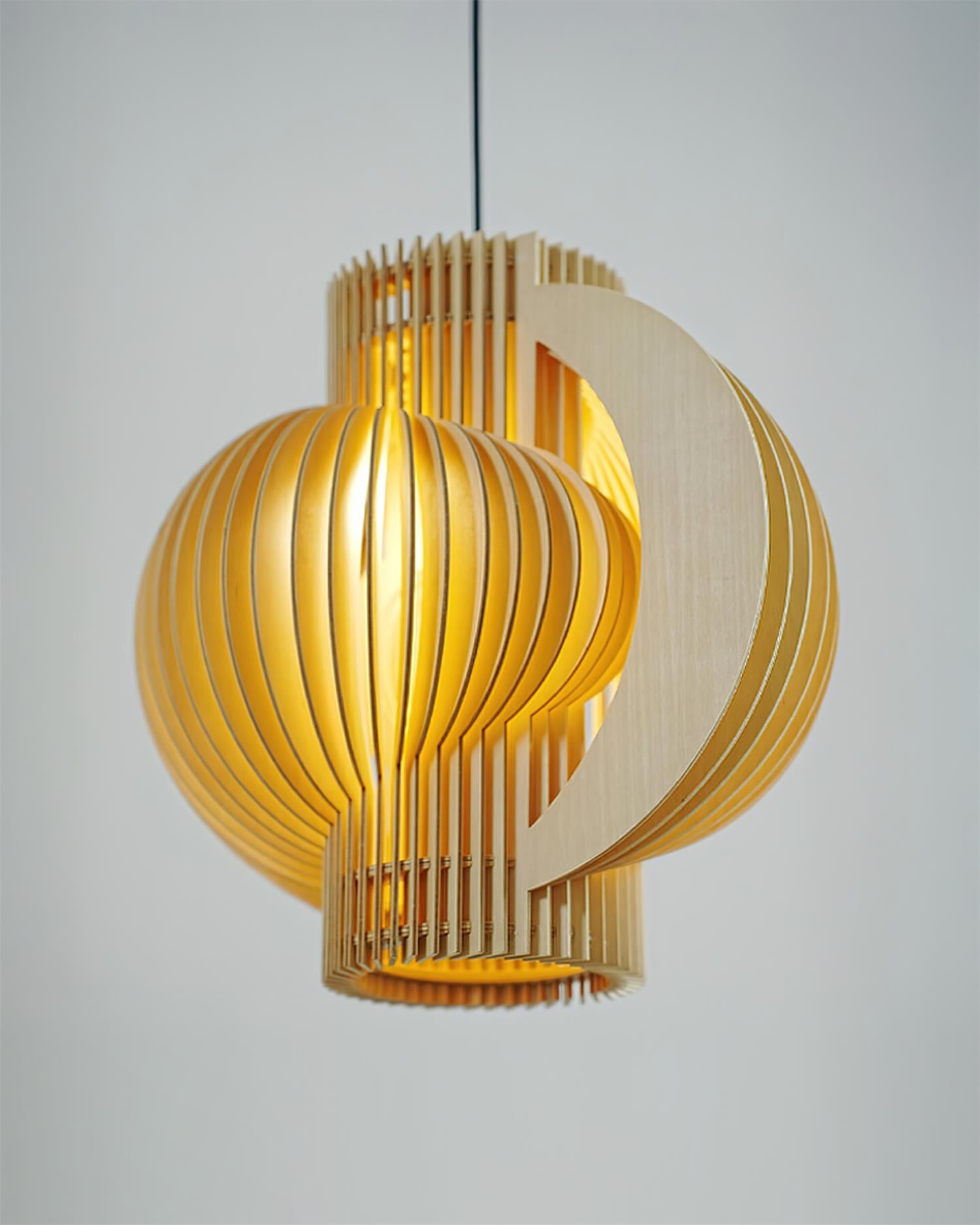 The Luminous Wood Pendant Lamp embodies a sculptural elegance, crafted from interlocking wooden slats that form a harmonious interplay of light and shadow. Its layered, spherical structure radiates warmth, allowing light to gently filter through the natural grain of the wood, creating an inviting and atmospheric glow. A fusion of organic material and architectural design.