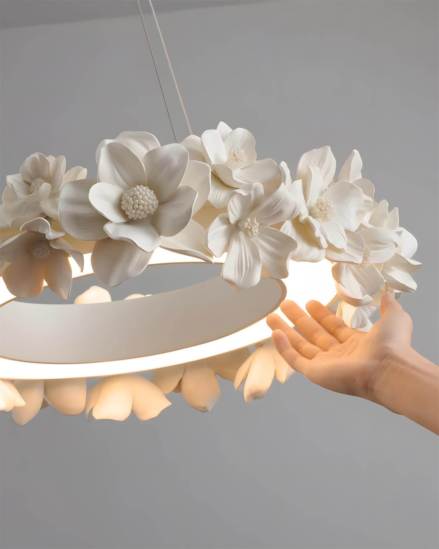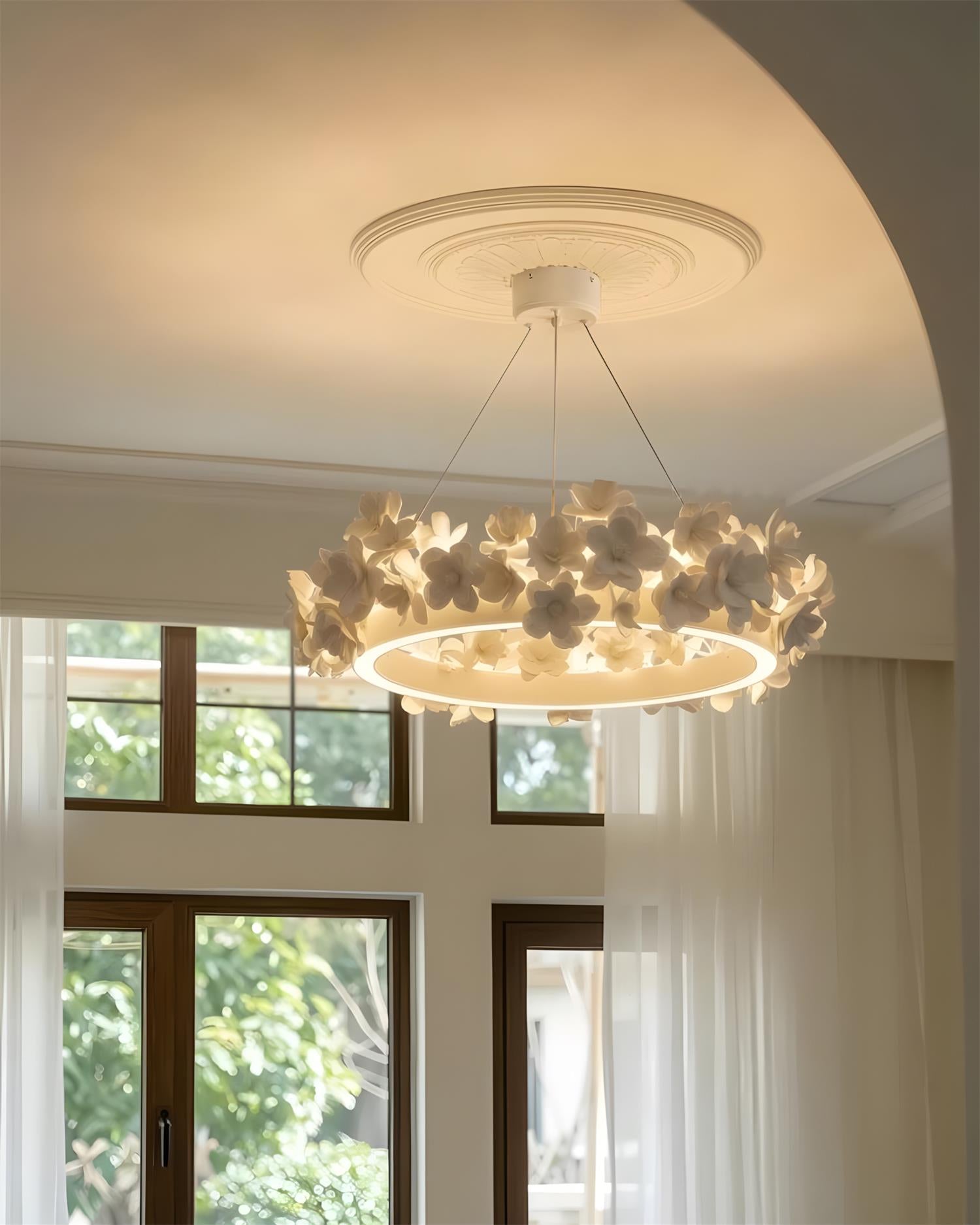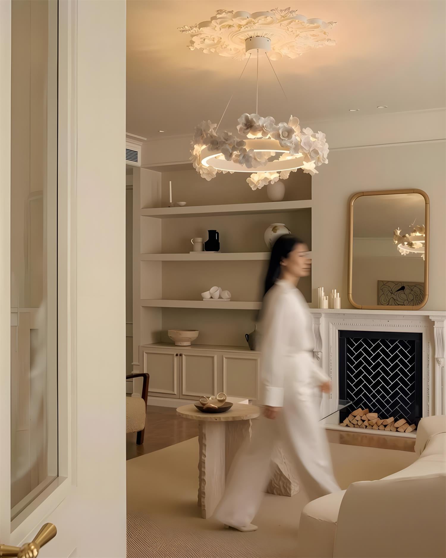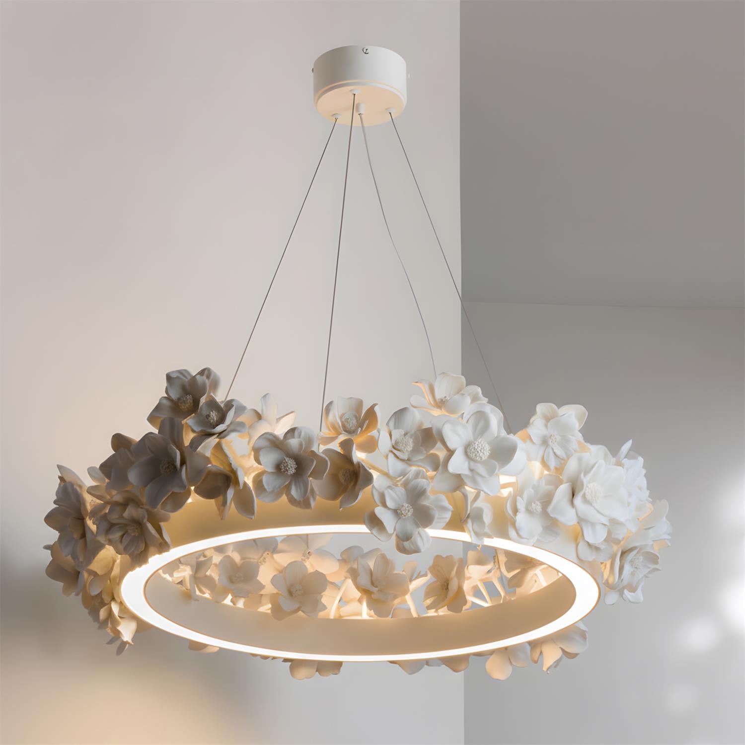 The Gardenia Loop Chandelier is an exquisite fusion of nature and modern design, where delicate, handcrafted floral petals encircle a glowing ring of light. Inspired by the timeless beauty of gardenias, each petal is meticulously sculpted, creating a soft, organic aesthetic. The warm, ambient glow emanates from the ring, softly illuminating the room while accentuating the elegance of the flowers. Suspended gracefully from thin wires, the chandelier offers a light and airy feel, making it a stunning focal point in any contemporary space.