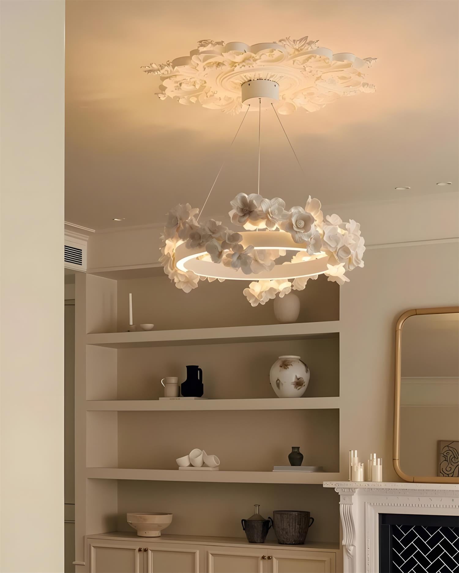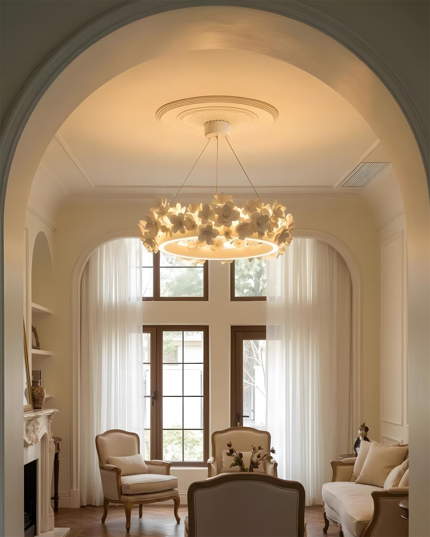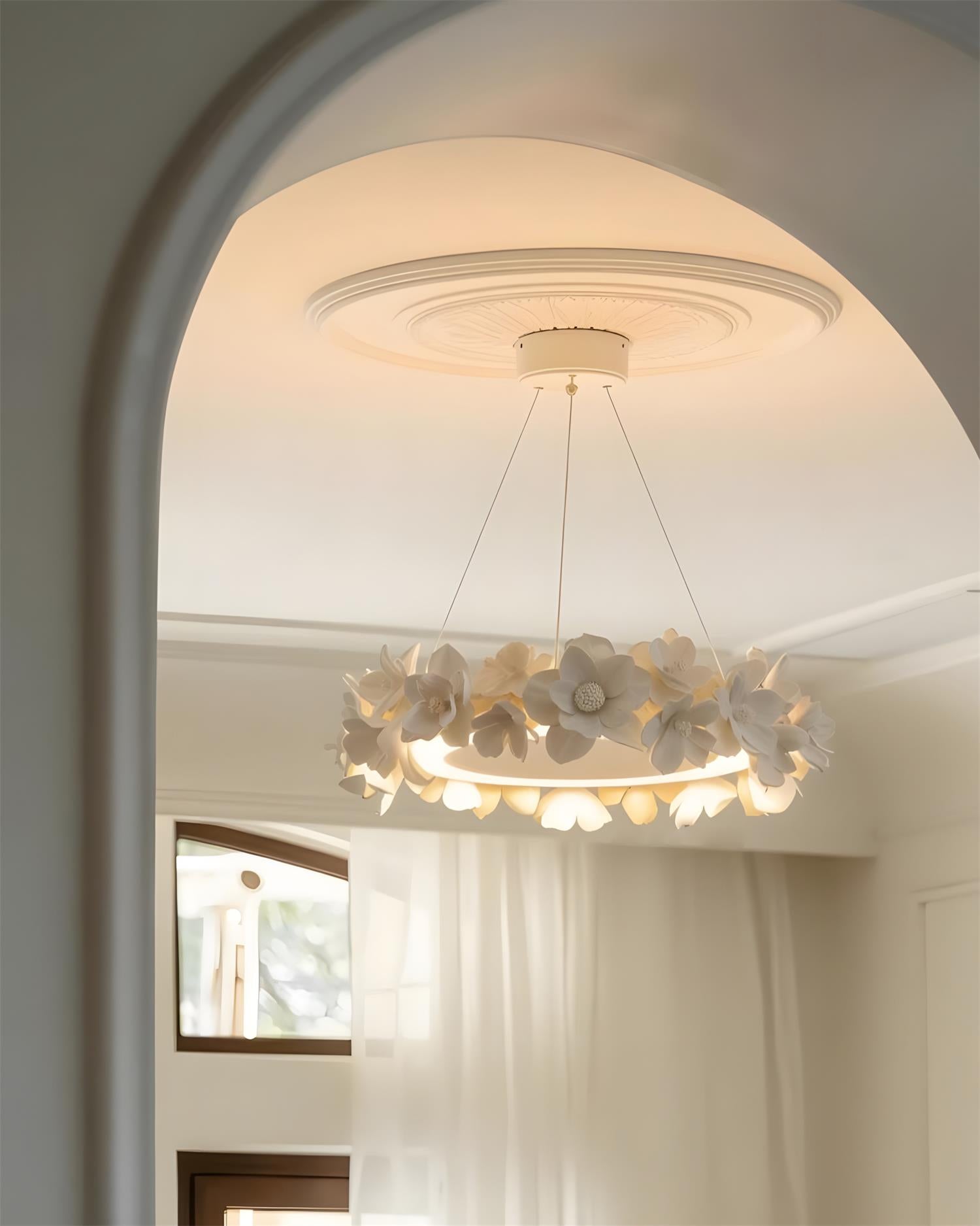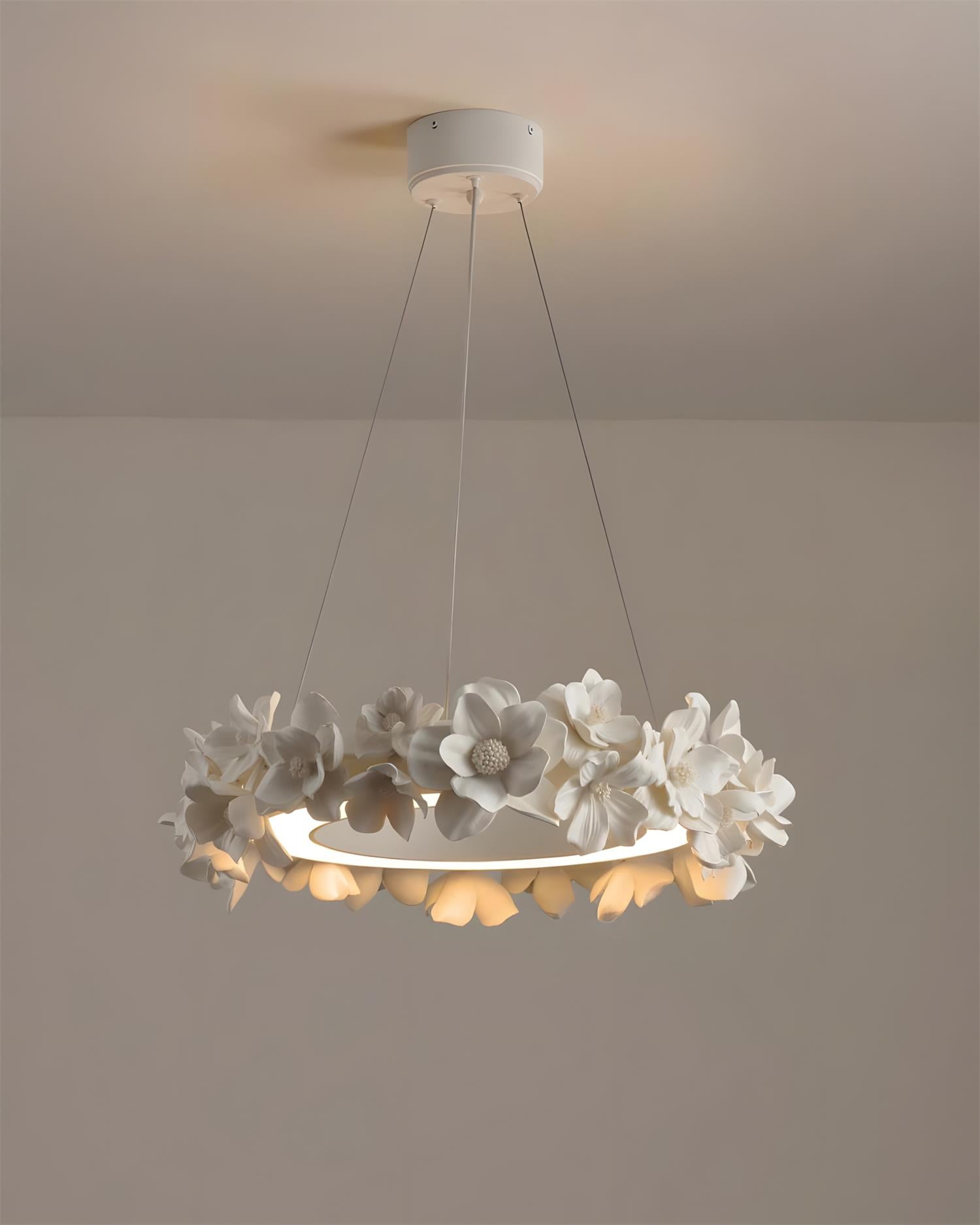 The Gardenia Loop Chandelier is an exquisite fusion of nature and modern design, where delicate, handcrafted floral petals encircle a glowing ring of light. Inspired by the timeless beauty of gardenias, each petal is meticulously sculpted, creating a soft, organic aesthetic. The warm, ambient glow emanates from the ring, softly illuminating the room while accentuating the elegance of the flowers. Suspended gracefully from thin wires, the chandelier offers a light and airy feel, making it a stunning focal point in any contemporary space.