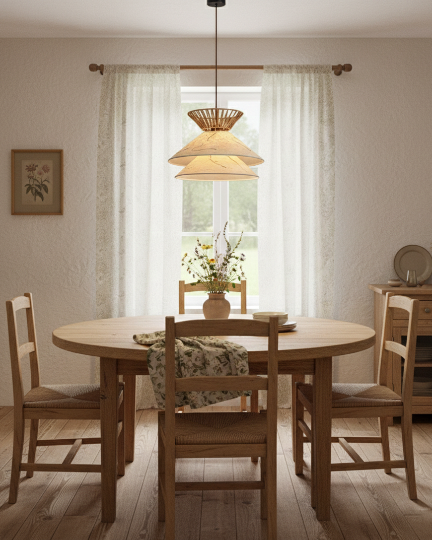 The Lattice Glow Pendant Lamp combines natural textures and minimalist design to create a piece that is both sculptural and functional. The intricately woven lattice structure, crafted from natural materials, crowns the gently tapered shade, casting a soft, diffused glow that highlights the craftsmanship. The design evokes the elegance of traditional weaving, while the modern silhouette brings a sense of lightness and sophistication to any space.