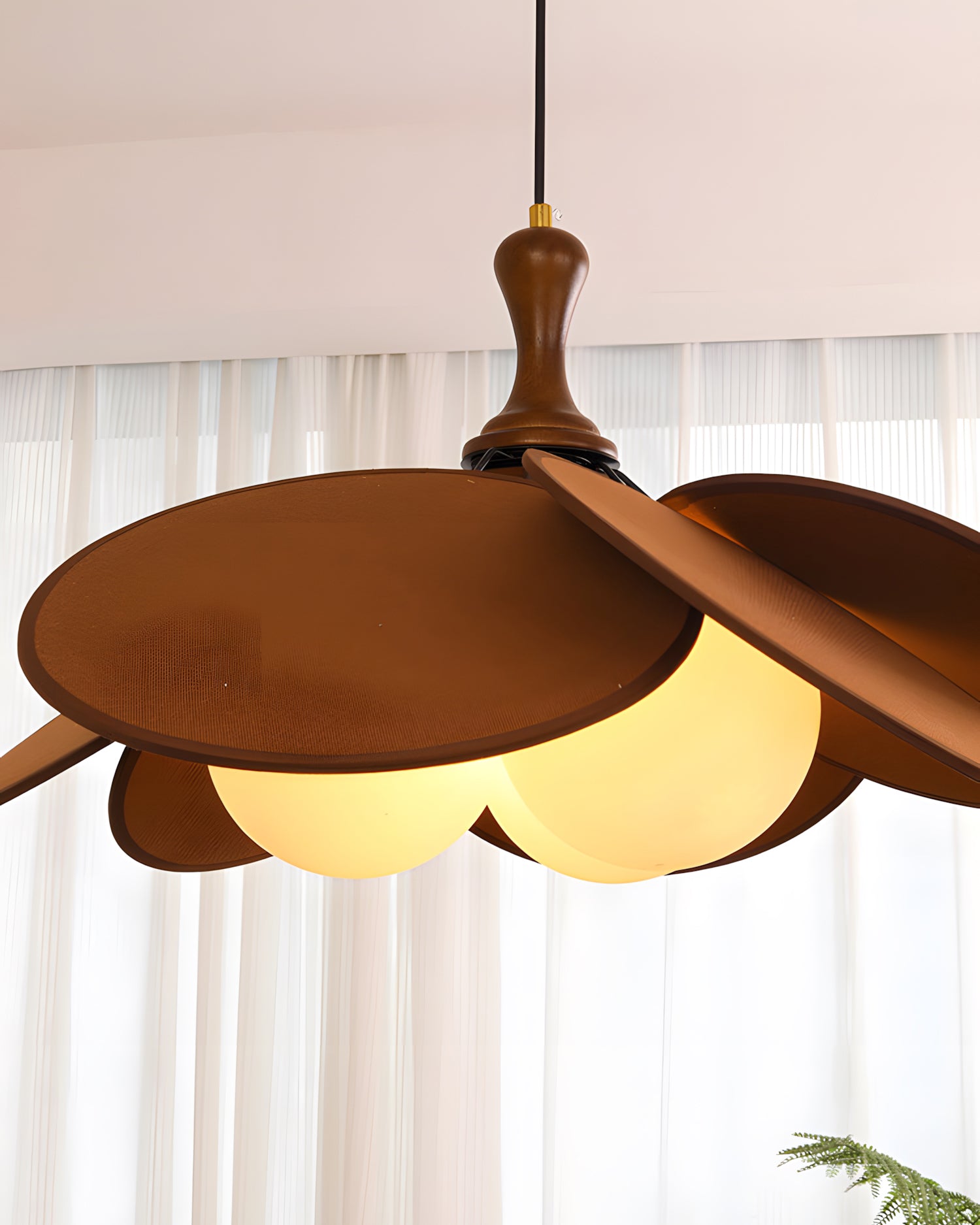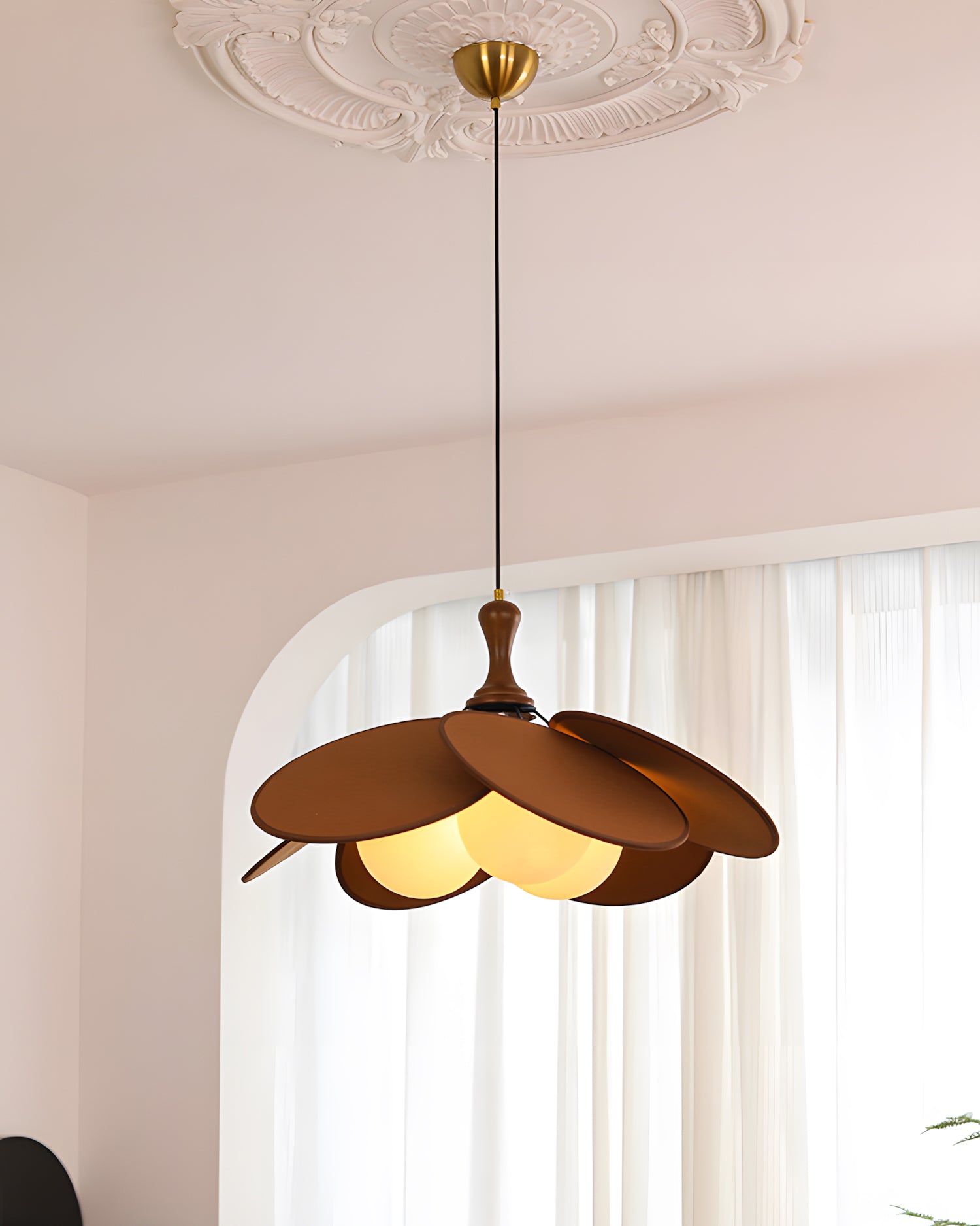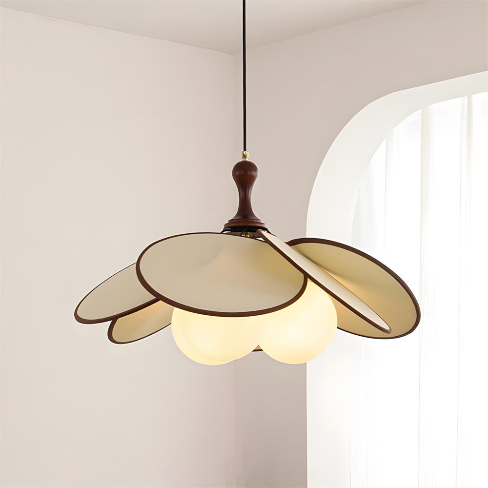 The Lily Petal Pendant Lamp draws inspiration from nature with its elegant, flower-like form. Its gently curved petals, crafted from sleek wood or soft beige, fold around the central spherical bulbs, creating a delicate and sophisticated structure. The light itself is warm and inviting, radiating softly through the petals and casting a serene glow. The sculptural design of the lamp adds both artistic and functional charm to any room, making it perfect for dining areas, living rooms, or bedrooms where a touch of organic beauty and modern elegance is desired.