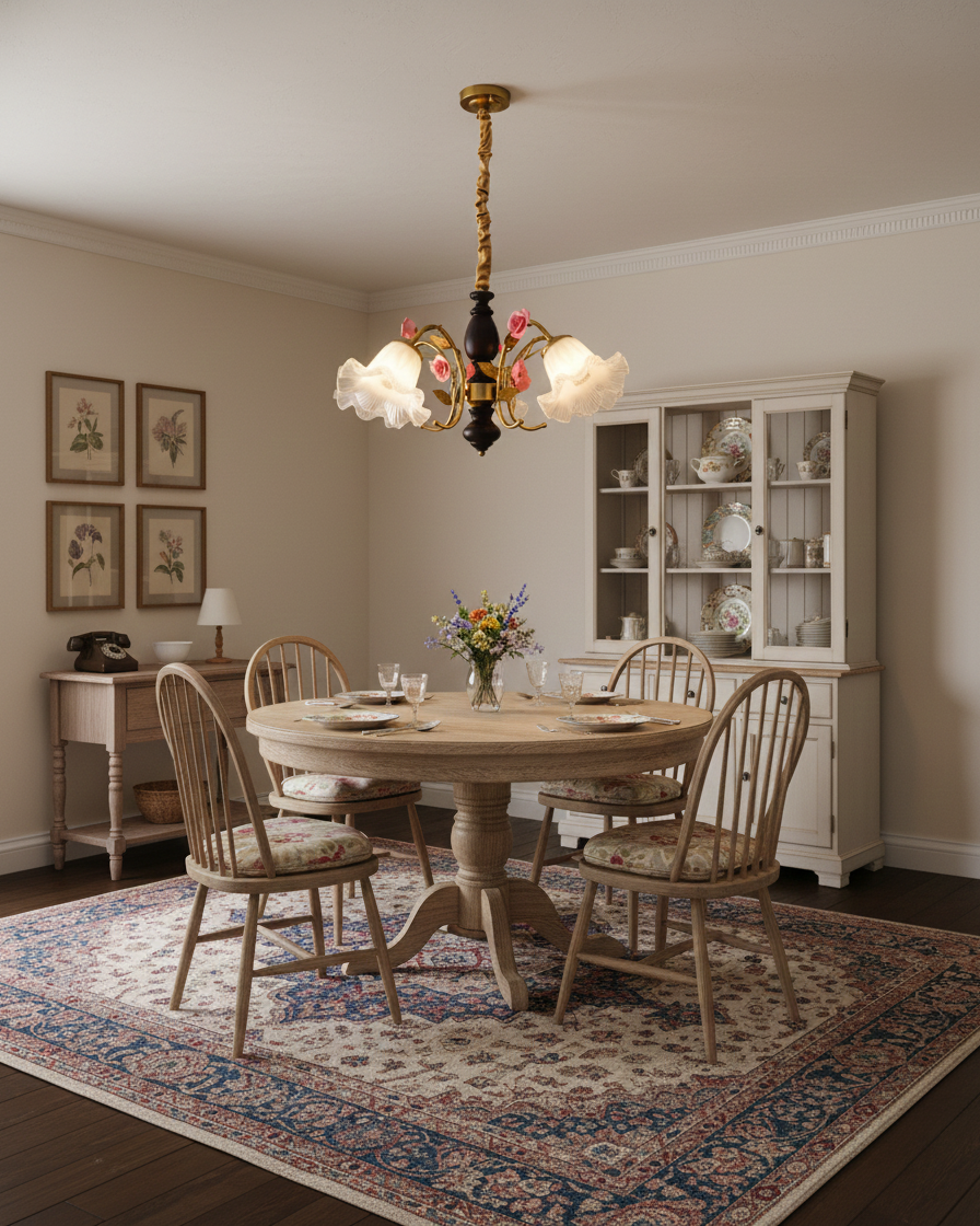 The Provencal Chandelier captures that effortless French-countryside romance in a sculptural, collectible form. A turned dark-wood centerpiece is paired with warm metal detailing and curling vine-like arms, finished with delicate rose accents that feel hand-placed rather than overly ornate. Each rippled glass shade blooms outward like a petal, softening the glow into a warm, flattering wash of light.