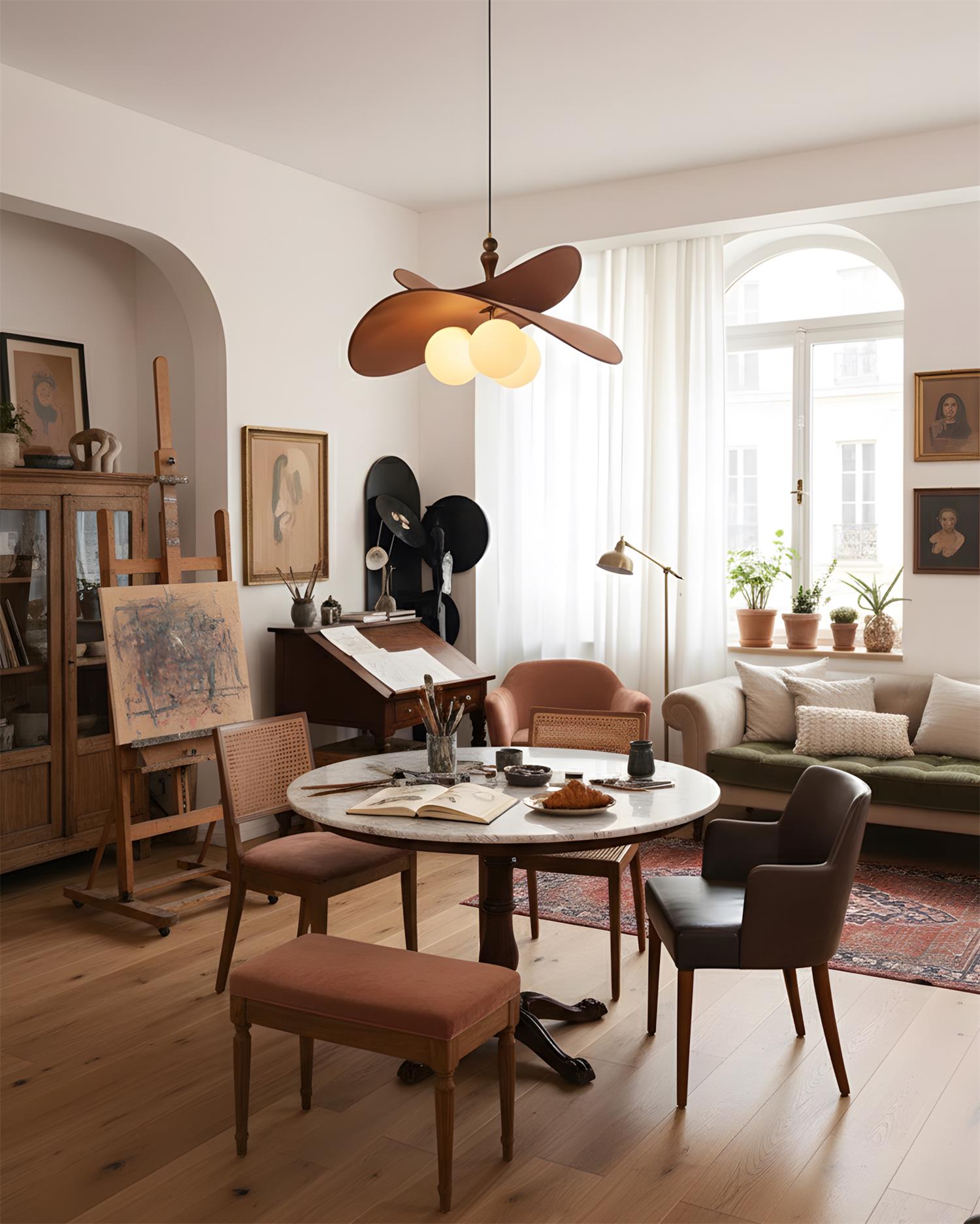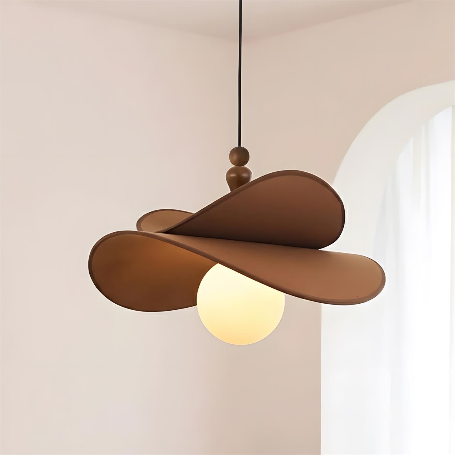 The Velvet Bloom Pendant Lamp exudes effortless elegance with its sculptural, petal-like design. The soft, curved shades, finished in a warm ivory hue with contrasting rich wooden accents, gracefully envelop the trio of glowing orbs at its center, creating a serene and inviting ambiance. The overlapping petals evoke the delicate beauty of a flower in bloom, while the smooth, rounded shapes add a modern touch.