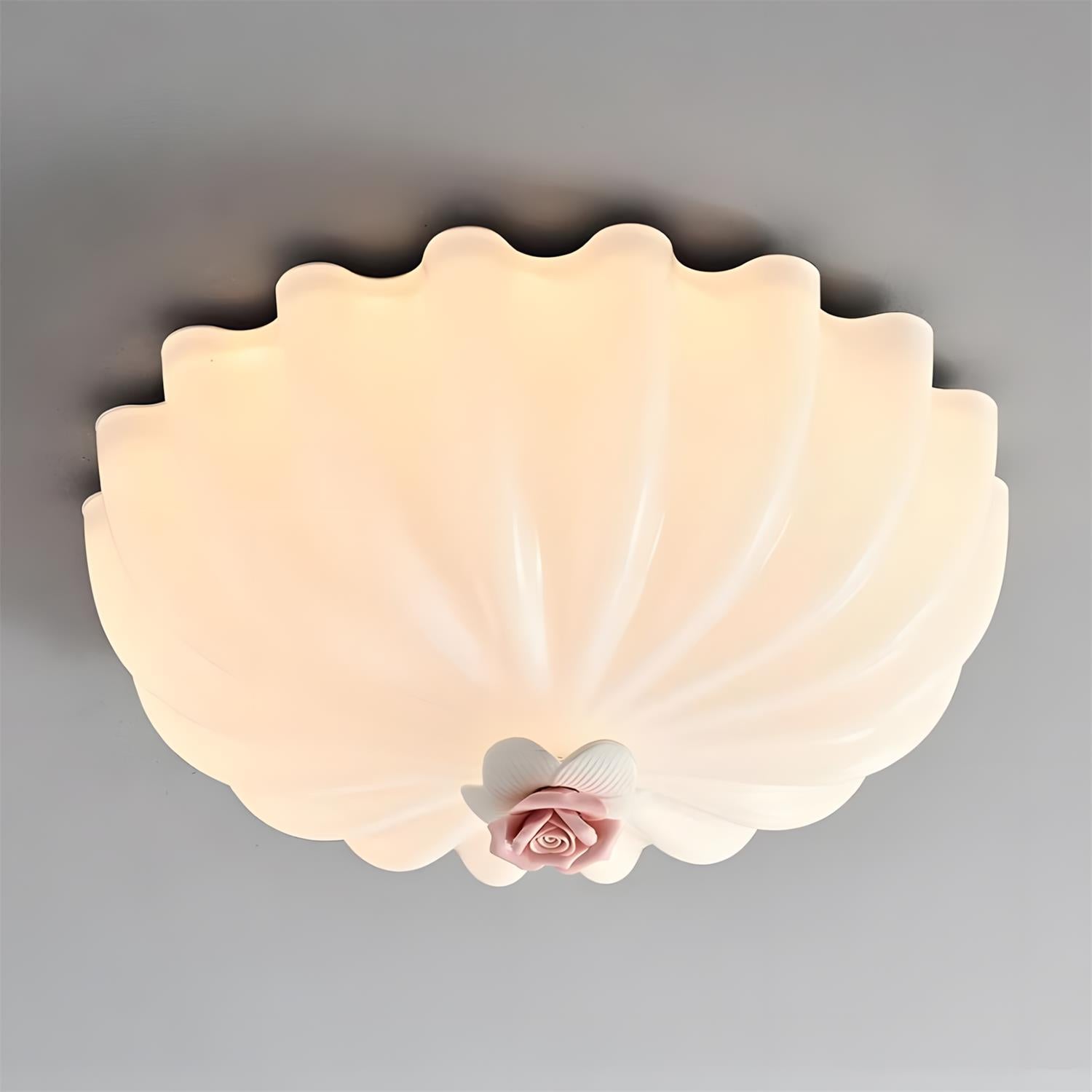 The Belle Coquille Ceiling Lamp draws inspiration from the natural elegance of a seashell, unfolding in soft, sculpted layers that radiate outward with quiet grace. Its milky white shade diffuses light gently across the ceiling, creating a calm, luminous atmosphere, while the delicate rose detail at the center adds a subtle romantic accent—like a hidden bloom within the shell. Balanced between classic ornament and modern restraint.