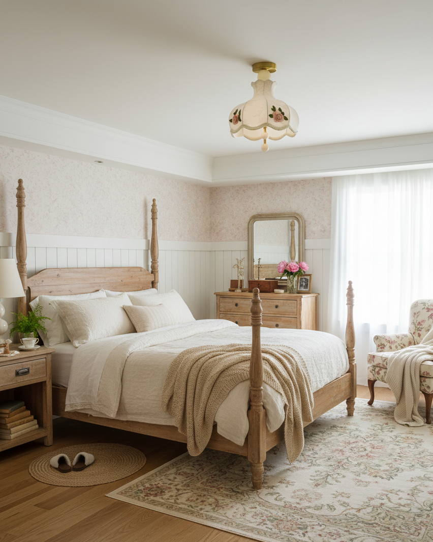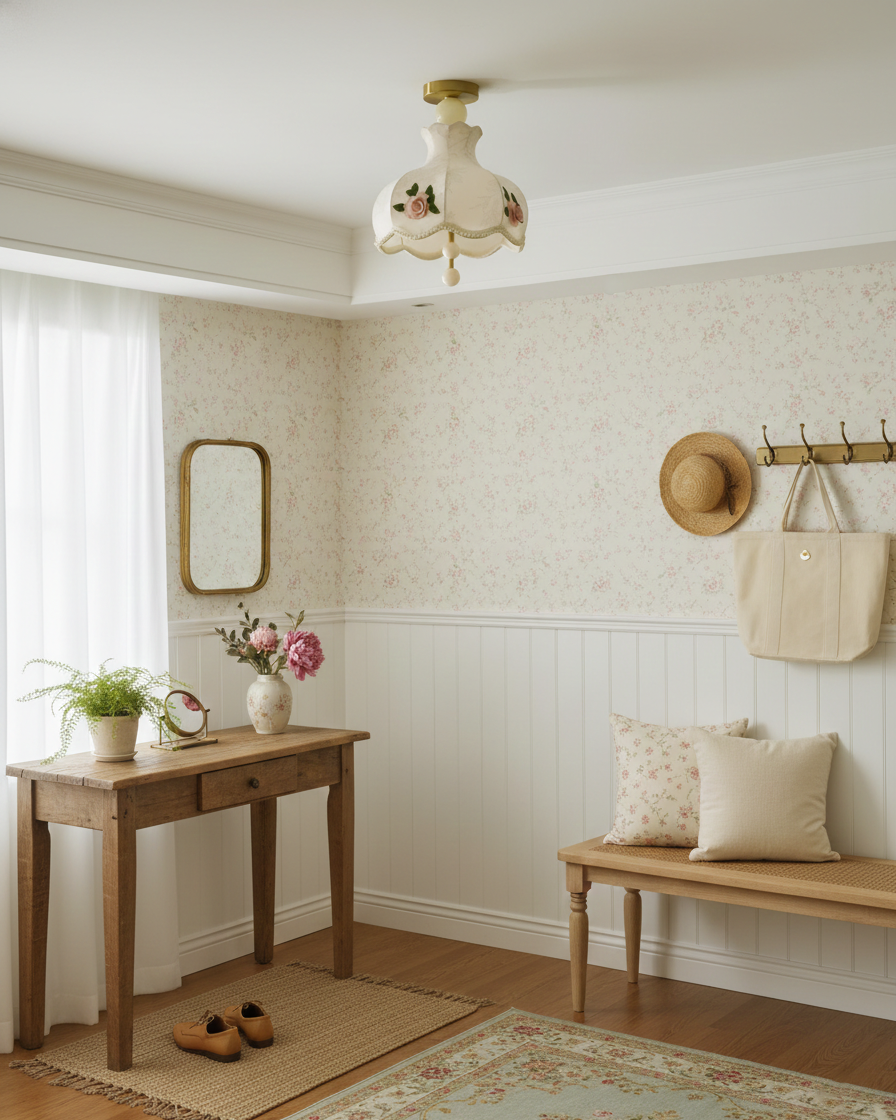 Bellevia Ceiling Lamp blends refined vintage elegance with soft romantic detail. Its sculpted fabric shade is delicately adorned with embroidered floral motifs and a gently scalloped edge, creating a graceful silhouette reminiscent of classic European interiors. Warm light diffuses through the textured surface, casting a calm, comforting glow that enhances the room’s atmosphere without feeling heavy.