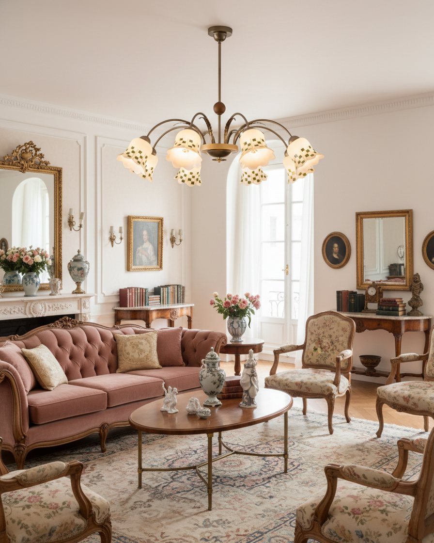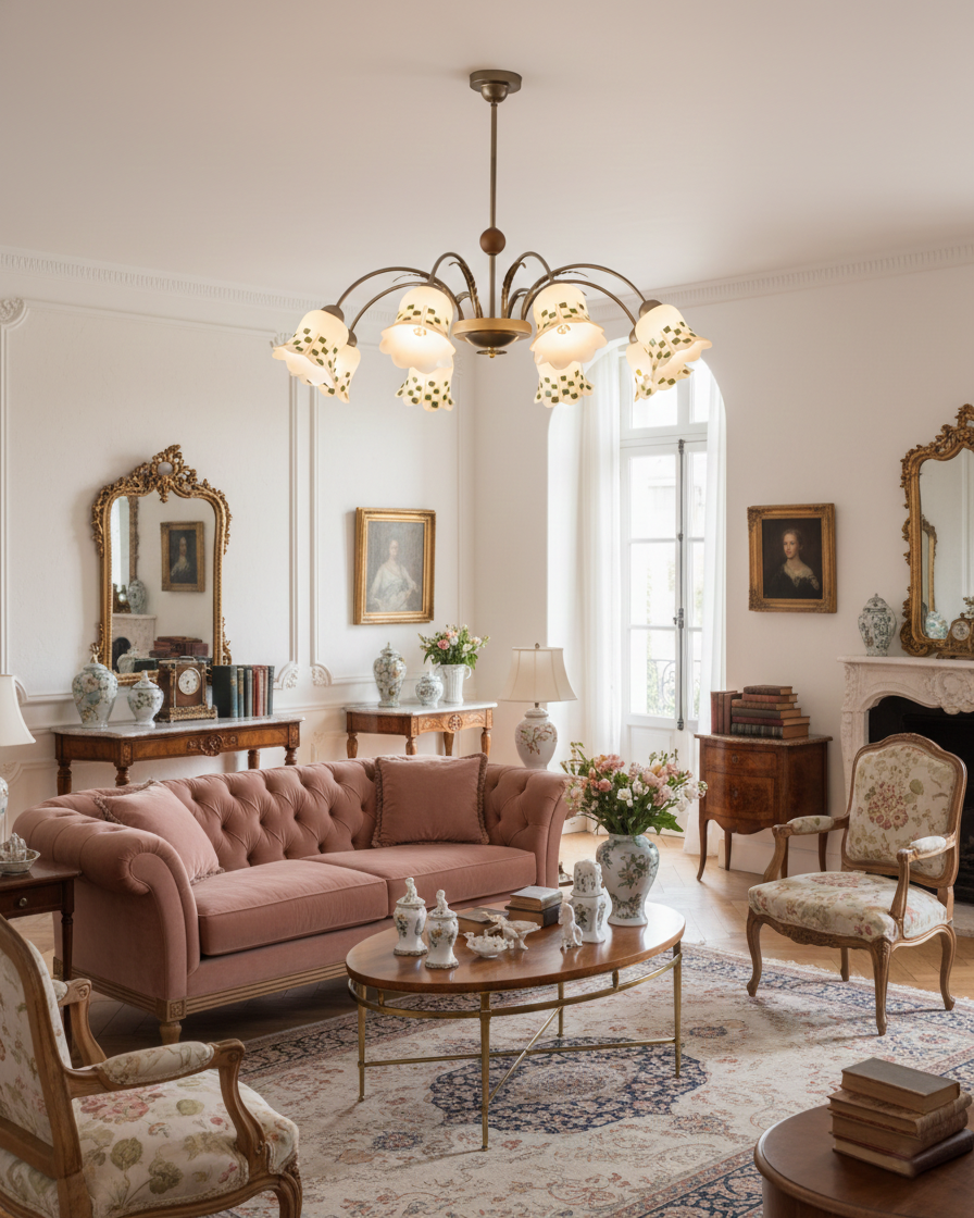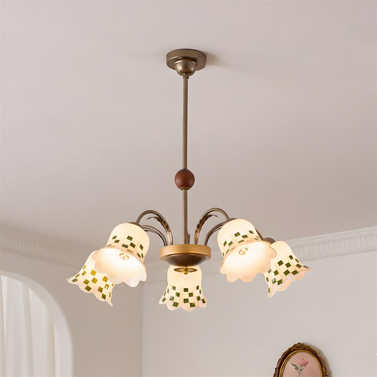 Caldria Bloom Chandelier captures the romance of a garden in full bloom, translating floral elegance into a sculptural lighting statement. Delicately curved arms extend like stems, each crowned with a softly scalloped glass shade adorned with subtle green accents that glow warmly when lit. The balanced composition and classic proportions evoke vintage European charm, while refined details lend it a timeless presence.