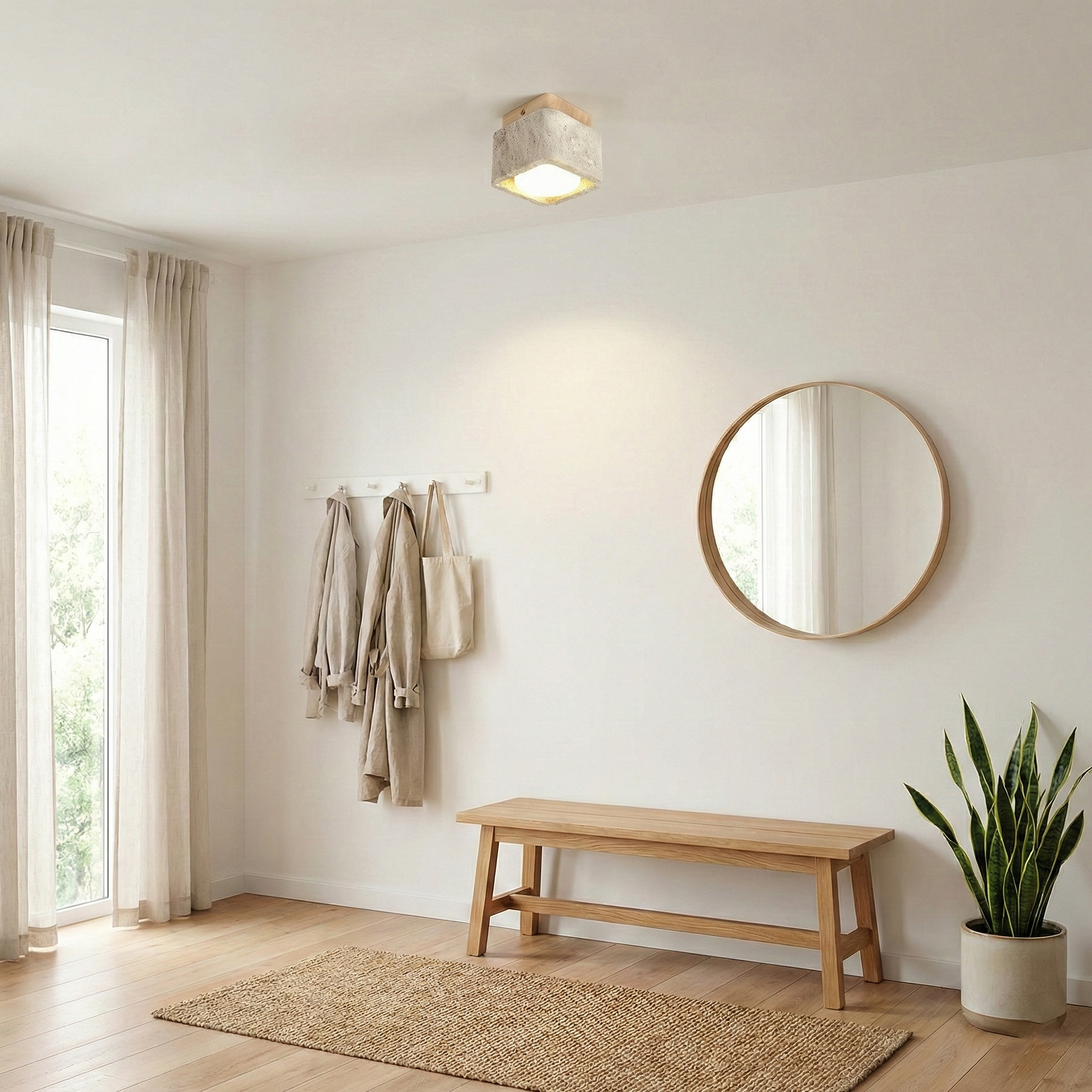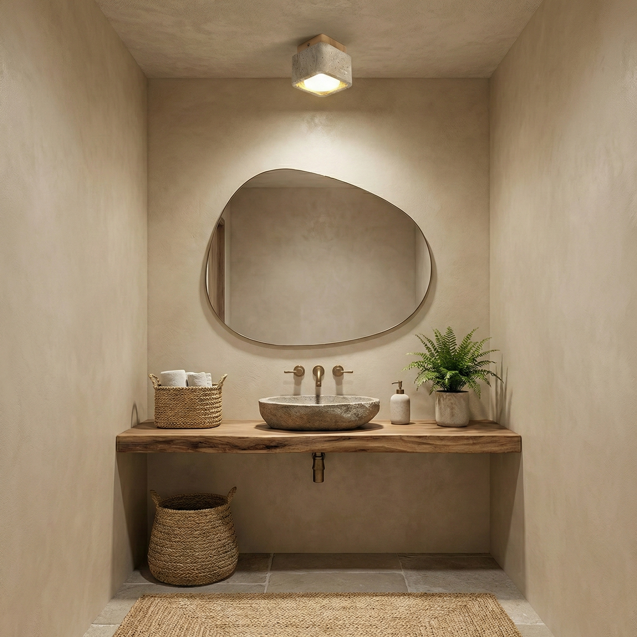 Crafted with timeless simplicity, the Drava Ceiling Lamp merges the raw elegance of travertine stone with the warmth of walnut wood. Each piece is carved into softly rounded edges, revealing natural textures that feel both grounded and refined. Whether used in a single spotlight or grouped in multiples, its integrated soft-diffused lighting casts a gentle glow—perfect for calm, contemporary interiors.