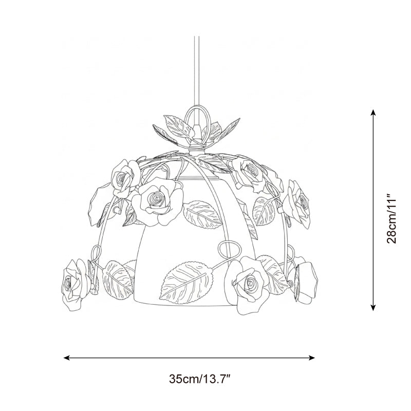 The Eirene Pendant Lamp is a soft statement piece that pairs a clean, frosted shade with a sculptural crown of gilded vines, pressed leaves, and porcelain-like white roses. Its floral frame feels airy and refined rather than overly ornate—like a small garden arch wrapped around the light—while the diffused glow keeps the mood calm and inviting.
