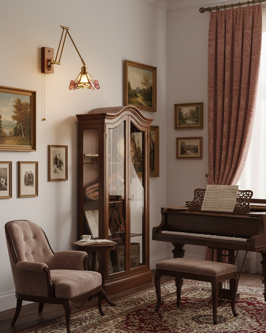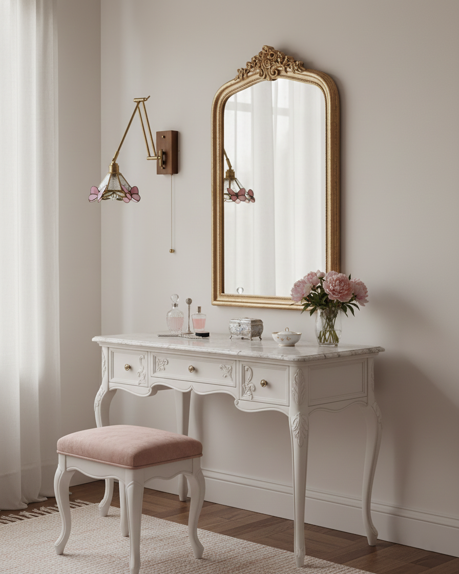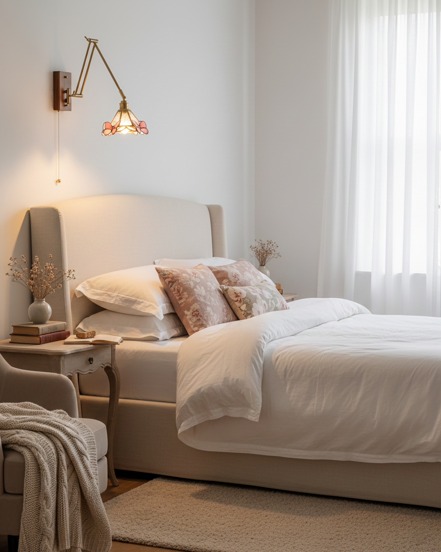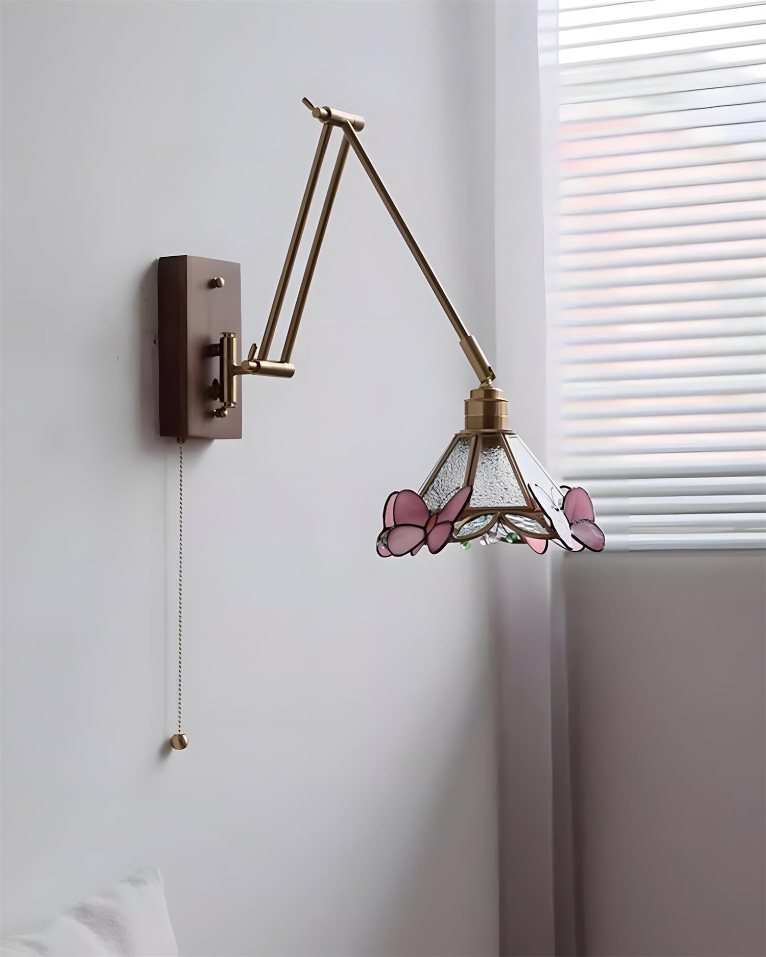 Gardenwing Wall Lamp blends graceful movement with delicate craftsmanship, designed like a small garden scene unfolding on the wall. The adjustable Metal arm extends effortlessly, allowing the light to float into position, while the stained-glass shade—accented with butterfly-like details—casts a warm, poetic glow. Subtle reflections dance across the wall, creating a soft, almost living atmosphere.