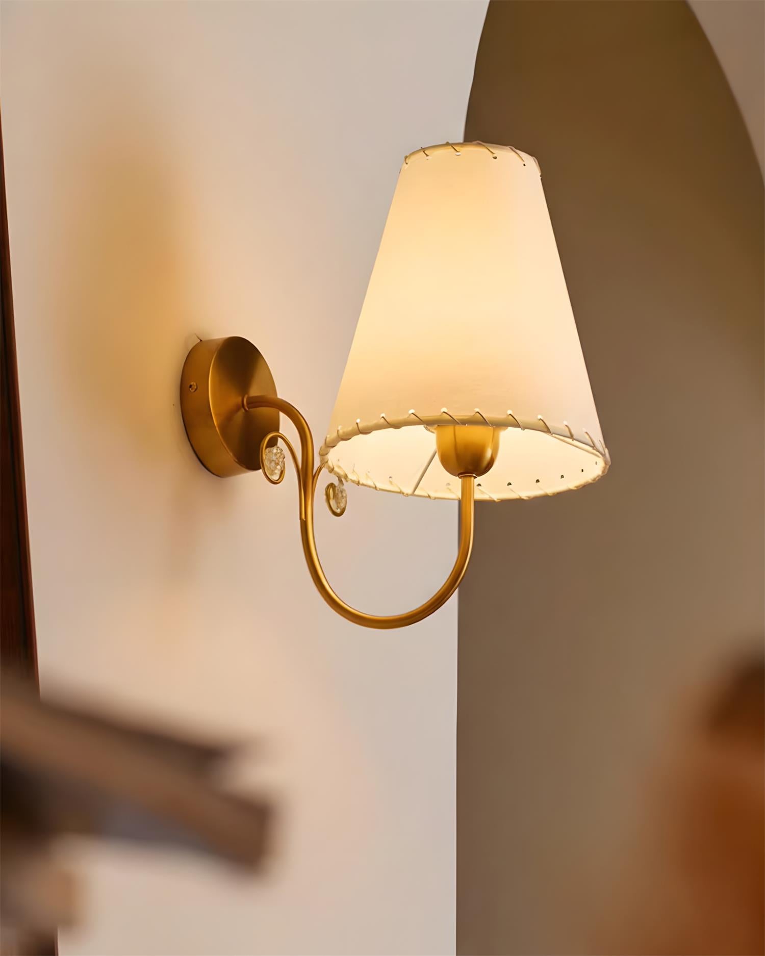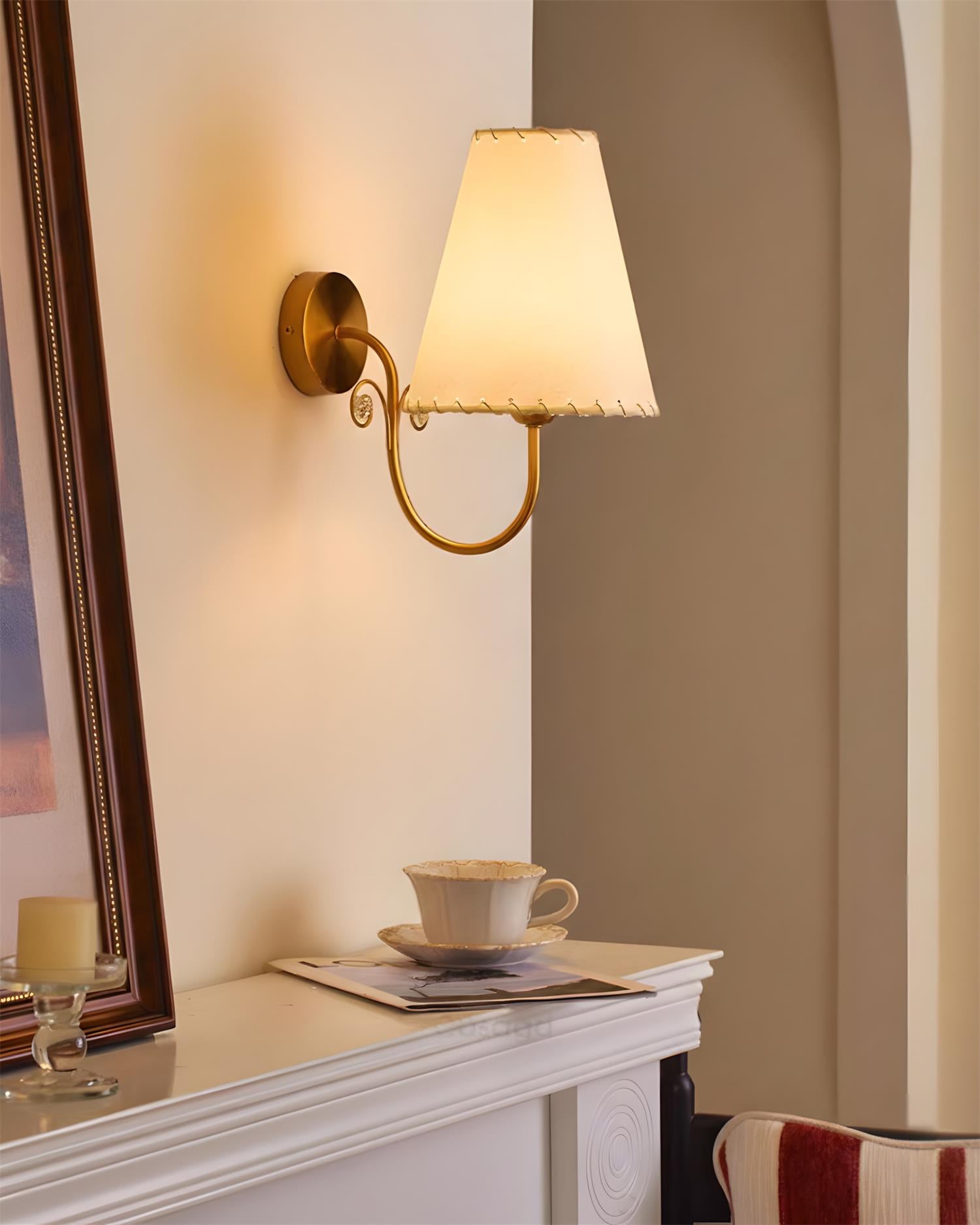 Gentle Bend Wall Lamp balances classic elegance with a soft, sculptural sensibility. Its gracefully curved arm flows outward like a quiet gesture, supporting a fabric shade finished with delicate stitched detailing that diffuses light into a warm, inviting glow. The refined metal structure adds subtle sophistication without feeling ornate, making the design feel timeless yet relaxed.