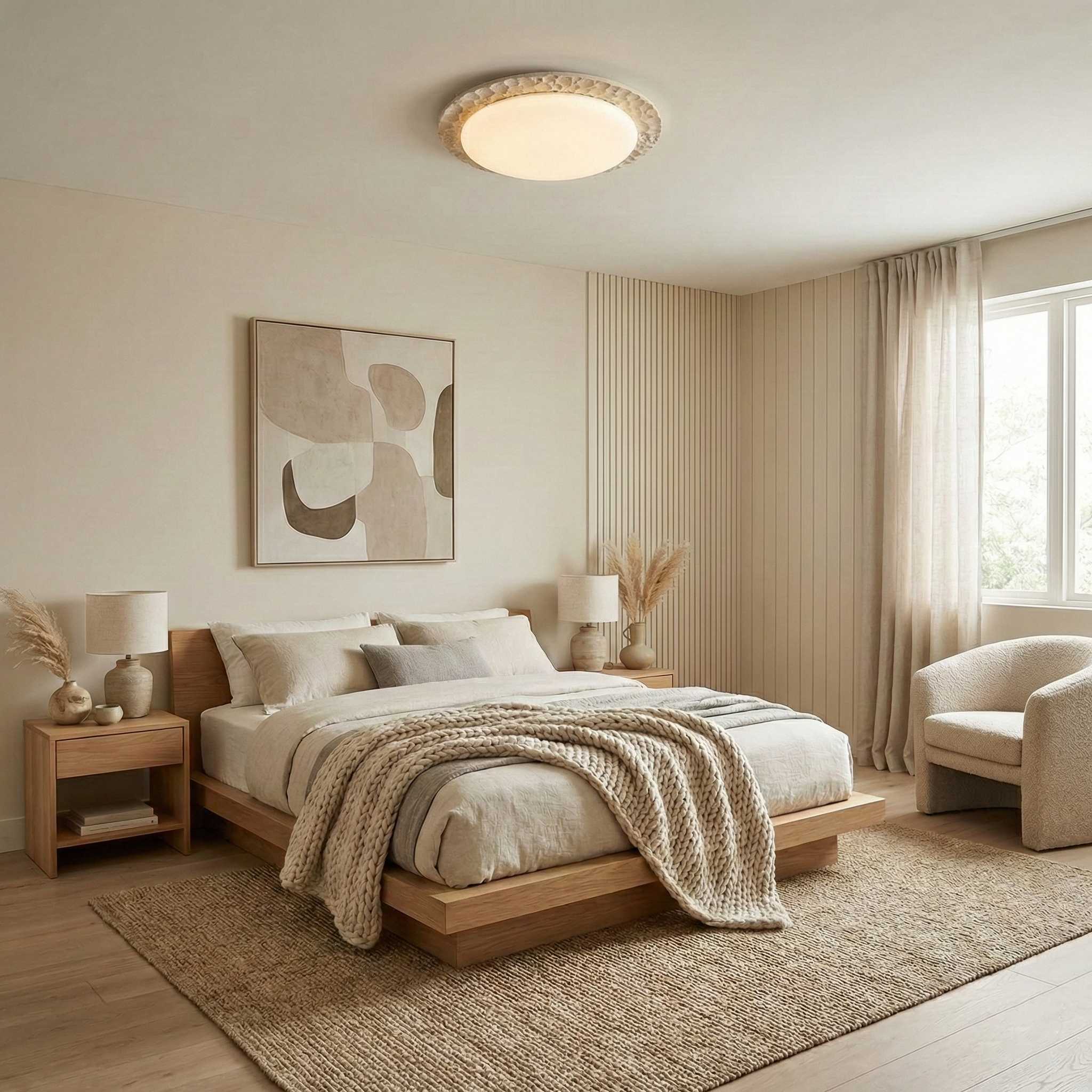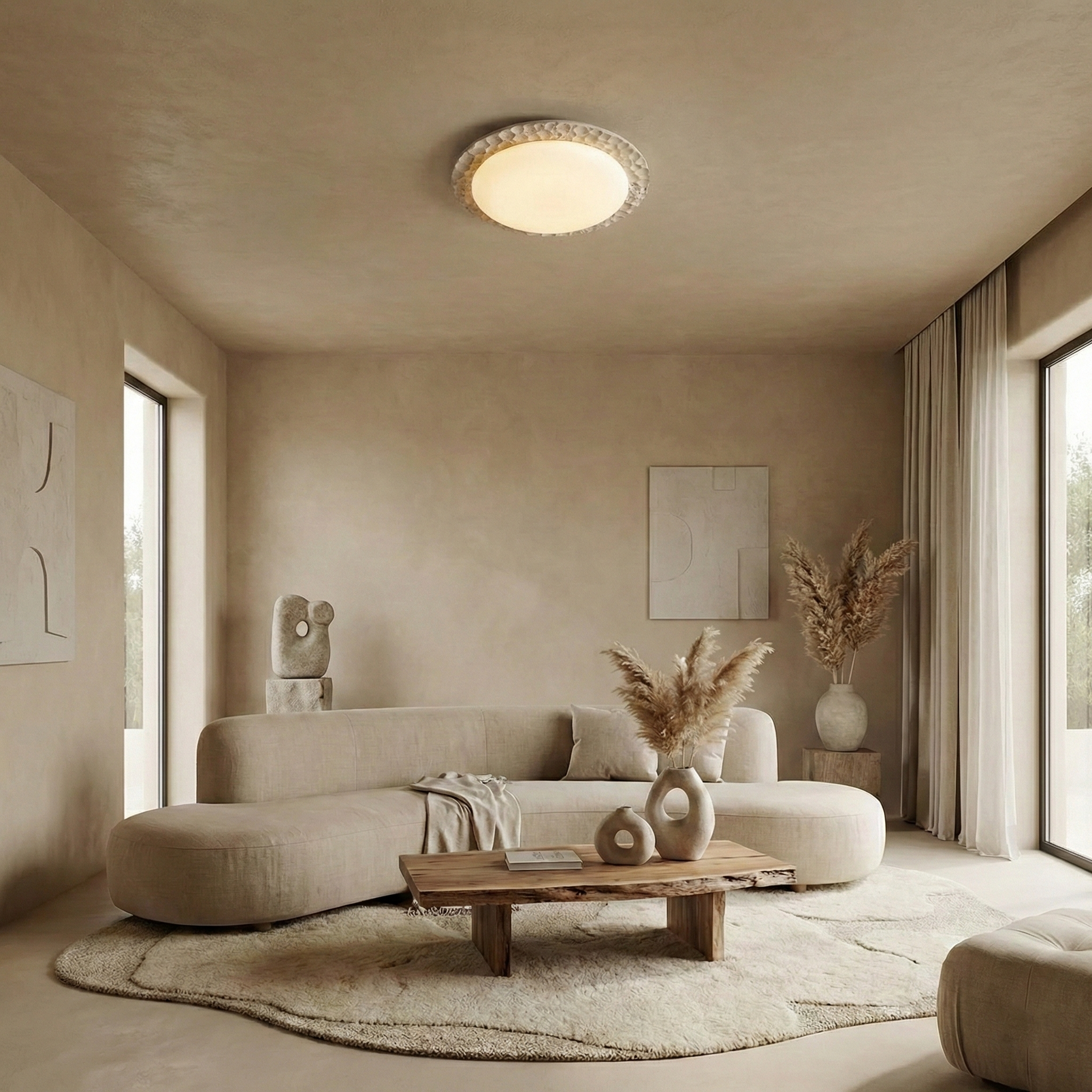 Infuse your space with the natural charm of the Kauai Ceiling Light. Crafted with a textured surface that mimics the gentle undulations of sand dunes, this fixture features a robust circular frame encasing a smooth opal diffuser. The organic, tactile design adds a layer of sophistication and warmth, making it a perfect addition to environments seeking a blend of modern design and natural elements.