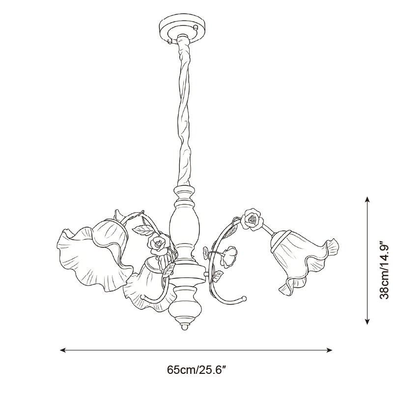 The Provencal Chandelier captures that effortless French-countryside romance in a sculptural, collectible form. A turned dark-wood centerpiece is paired with warm metal detailing and curling vine-like arms, finished with delicate rose accents that feel hand-placed rather than overly ornate. Each rippled glass shade blooms outward like a petal, softening the glow into a warm, flattering wash of light.