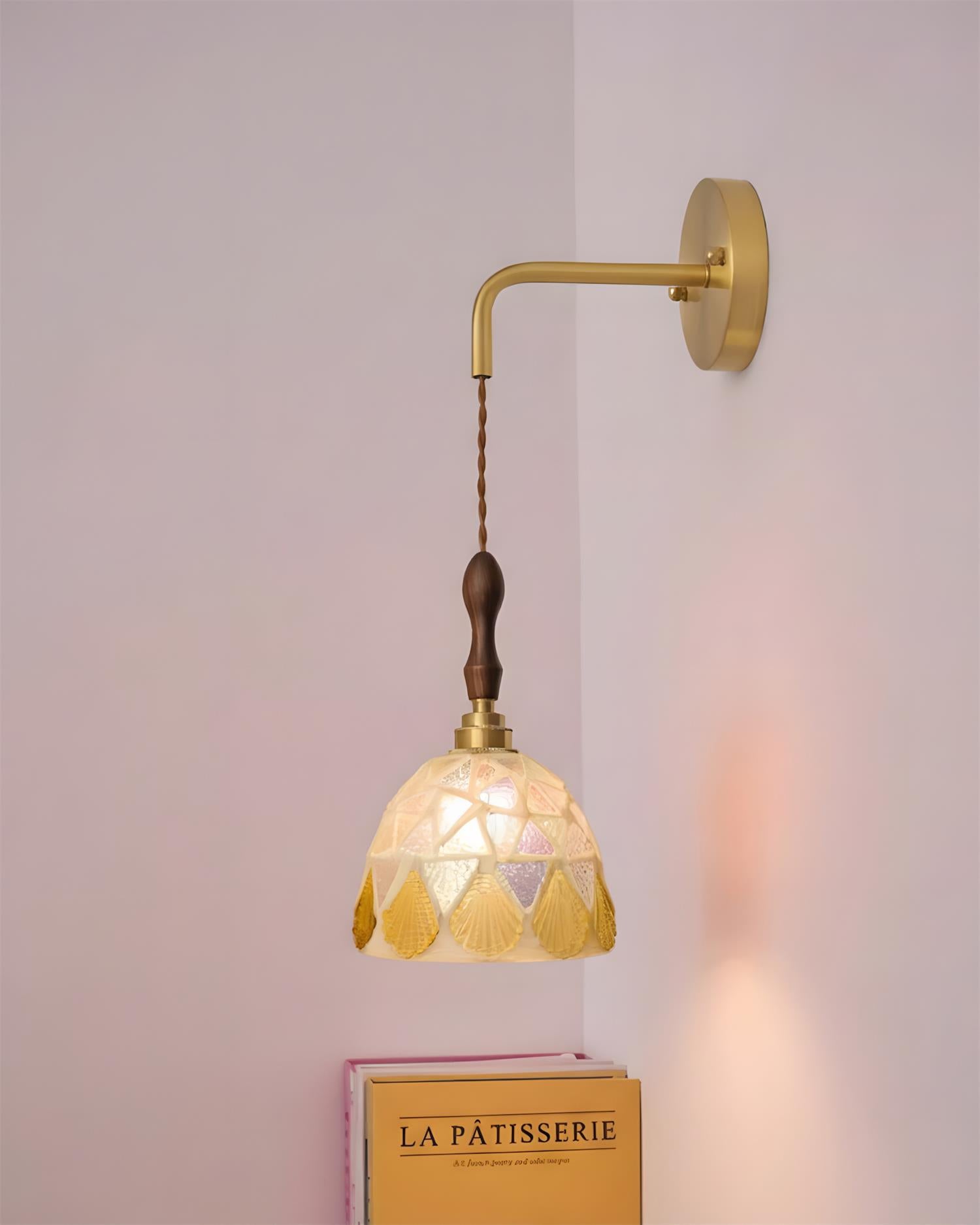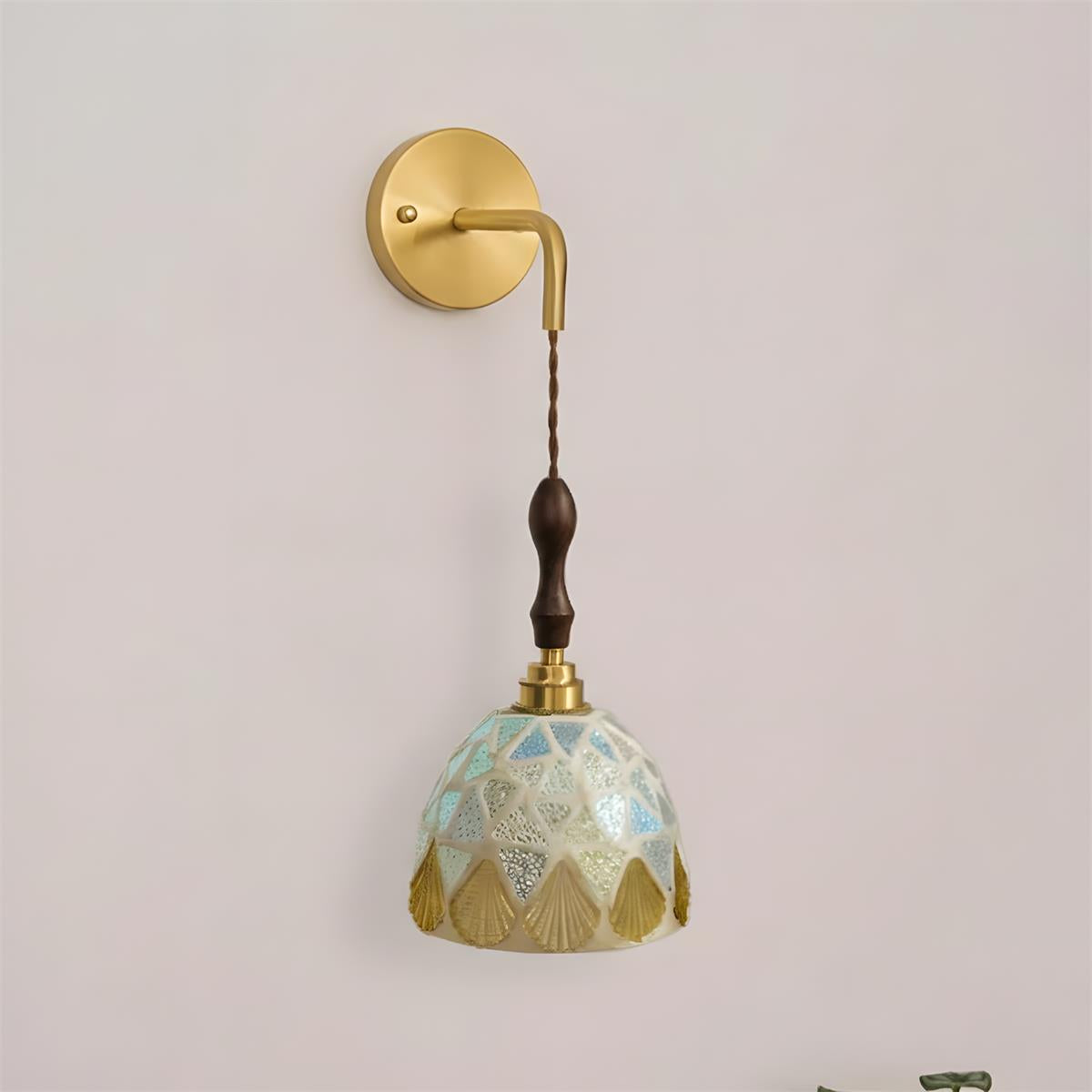 The Tessaro Wall Lamp blends artisanal charm with refined elegance, featuring a sculptural shade composed of hand-set mosaic fragments that create depth, texture, and a softly diffused glow. Each variation feels like a small piece of functional art, suspended from a slender brass arm and finished with a turned wood detail that adds warmth and balance.