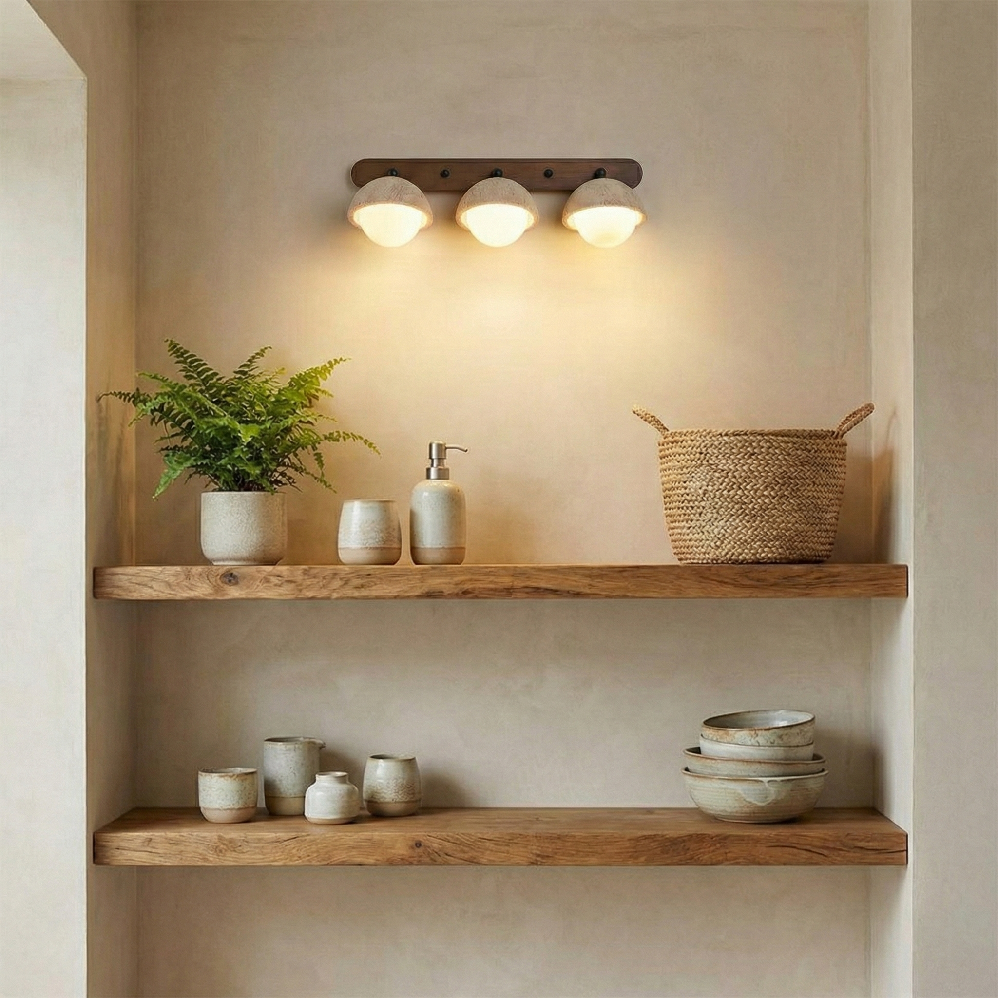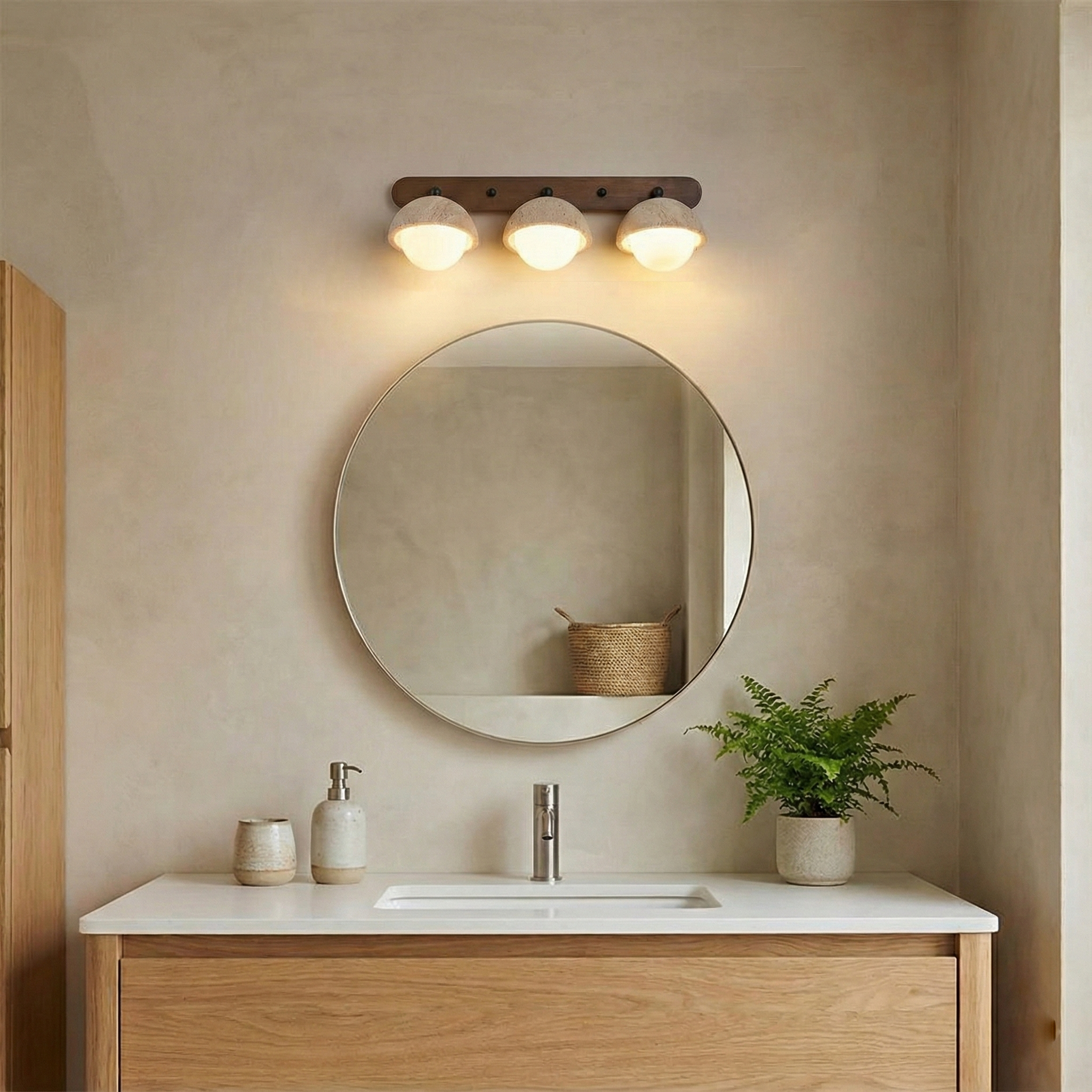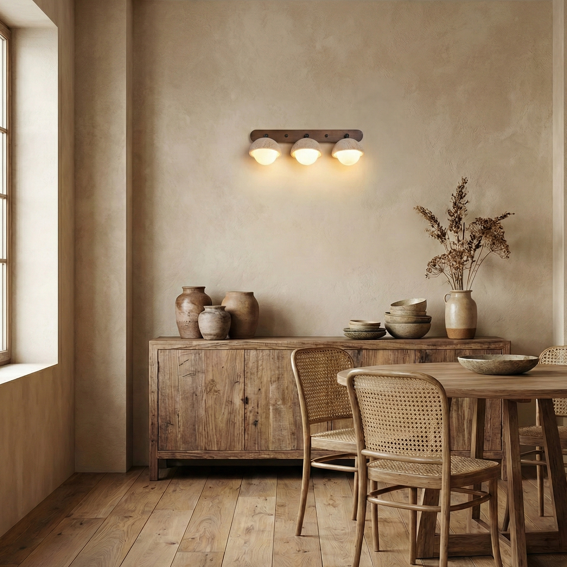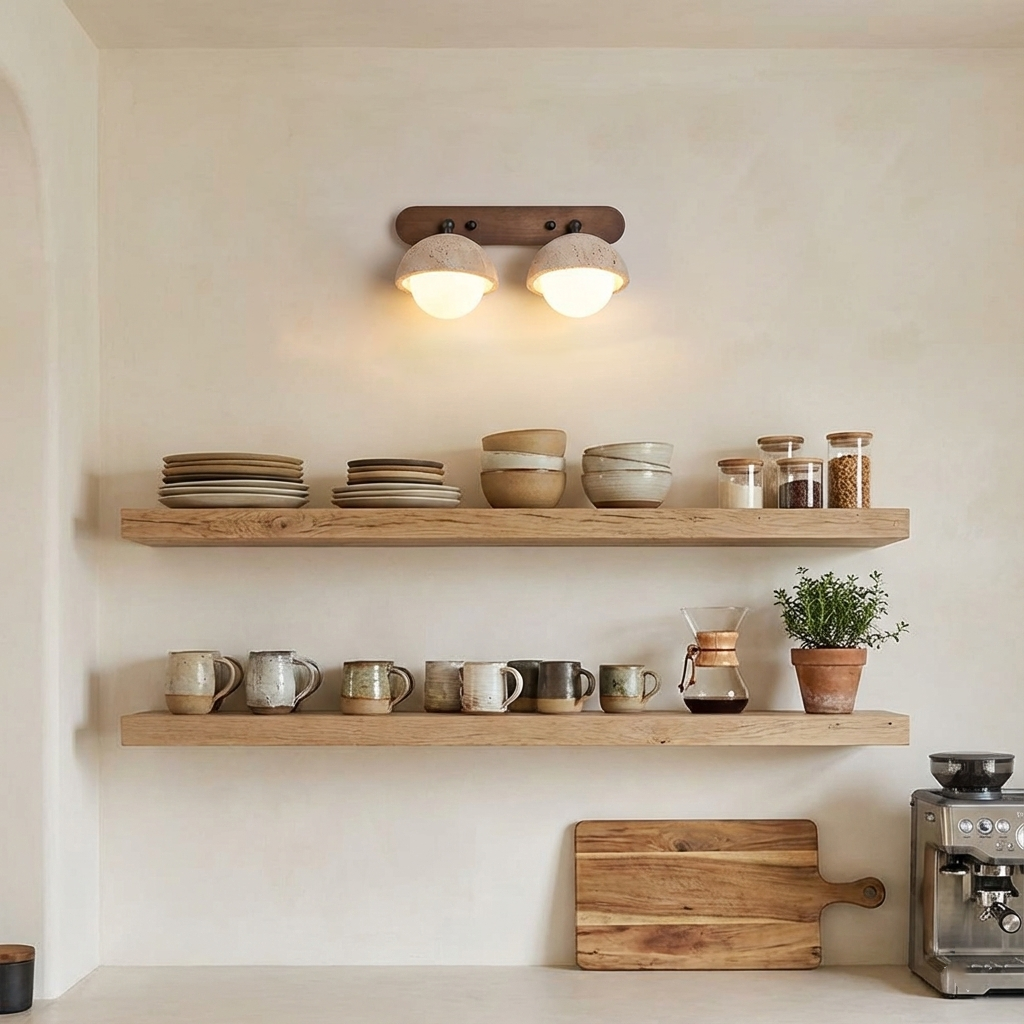 Sculpted from warm walnut wood and hand-finished travertine stone, the Zenora Globe Wall Lamp blends natural textures with minimalist geometry. The half-dome travertine shades cradle milky glass globes, emitting a soft, ambient glow perfect for bathroom vanities, bedside lighting, or hallway accents. Its linear wooden mount grounds the composition with quiet sophistication, making this piece as functional as it is sculptural.