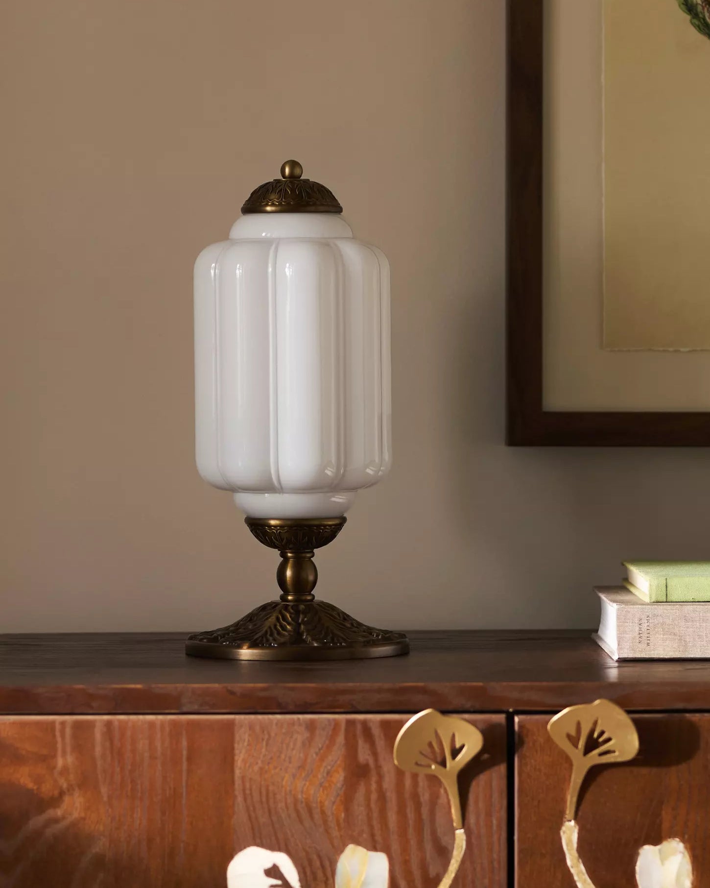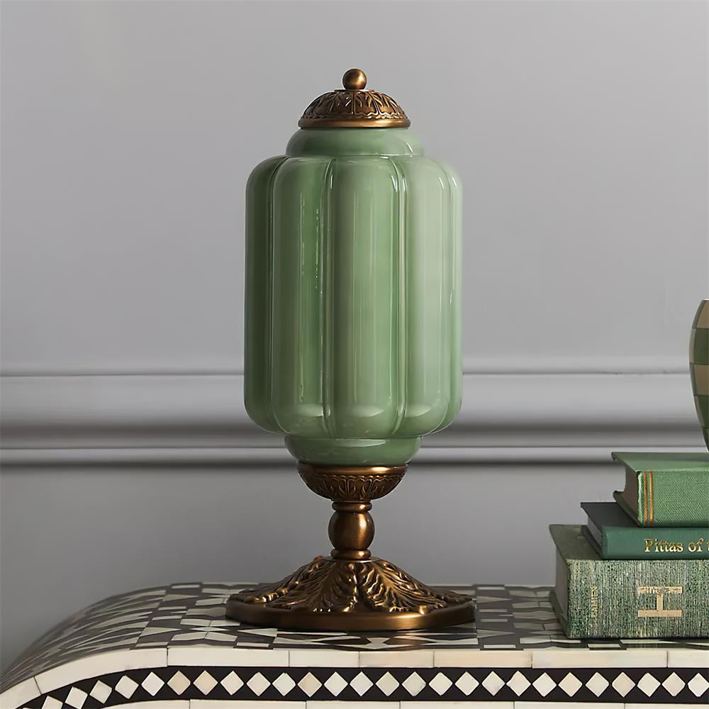 The Eloise Table Lamp exudes timeless elegance with its refined design, featuring a beautiful green glass body and ornate brass detailing. The sculptural shape and luxurious finishes create a striking focal point in any room, whether placed on a console, nightstand, or desk. The soft glow emitted by the lamp adds warmth and sophistication, enhancing its classic charm.
