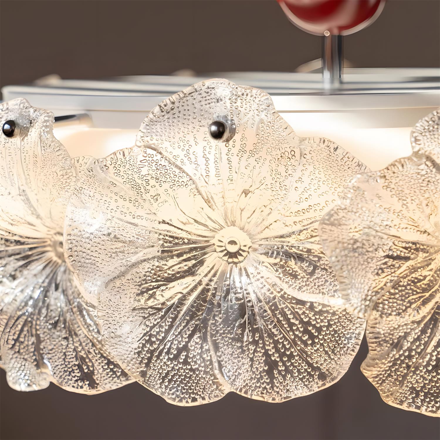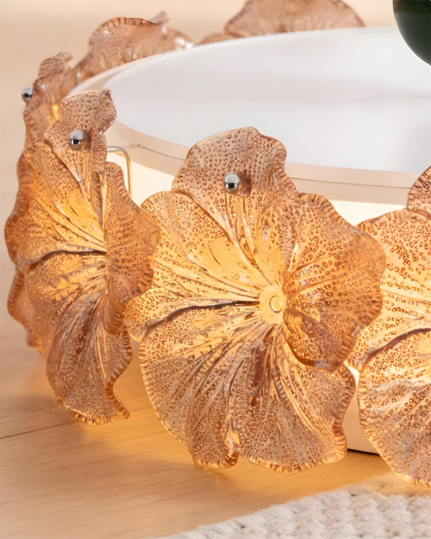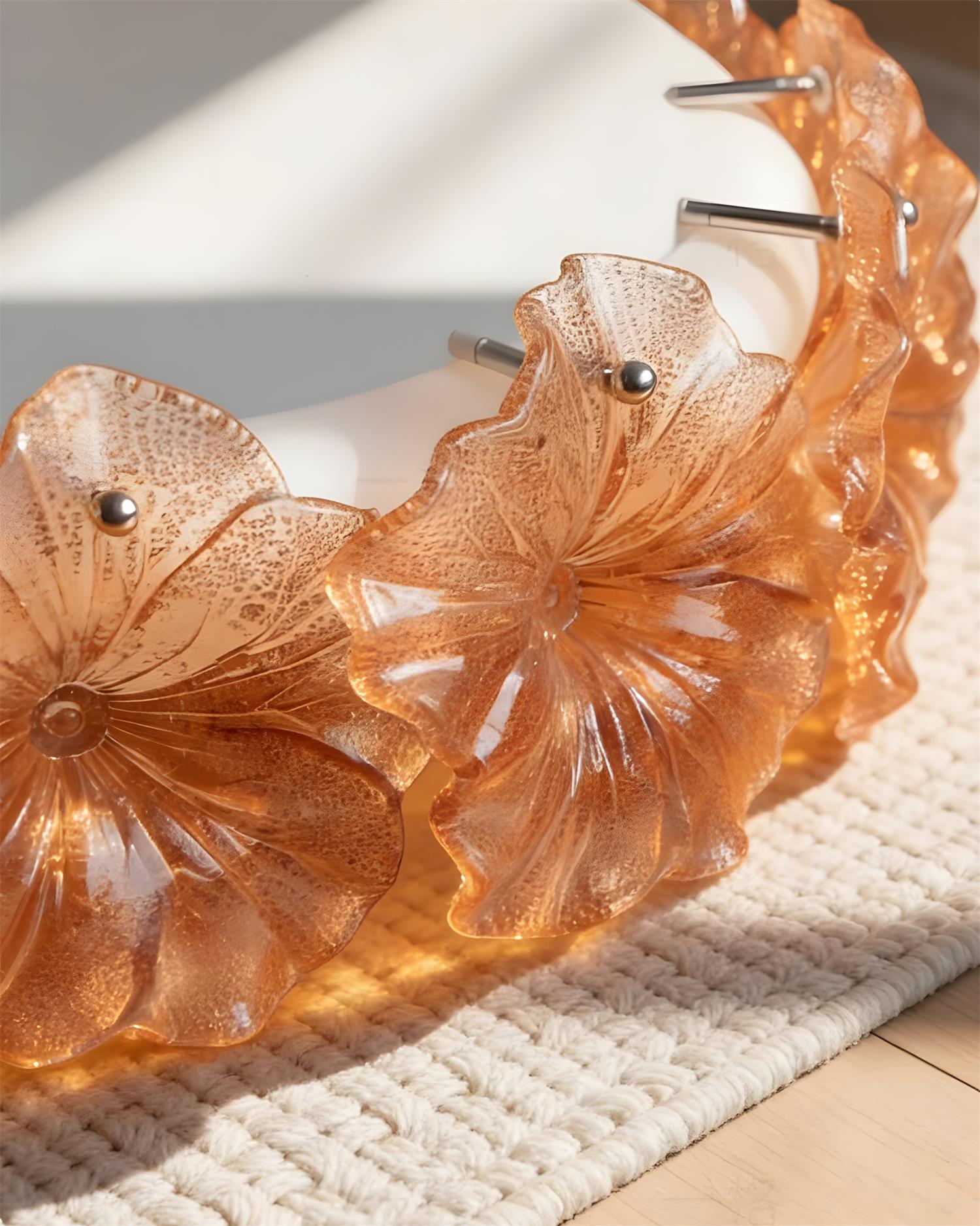 The Coralia Ceiling Lamp is inspired by organic forms found in nature, featuring delicately textured glass petals arranged in a continuous floral ring. Each translucent bloom softly diffuses light, creating a warm, layered glow that feels both decorative and atmospheric. Accented with subtle metal details and a sculptural central structure, Coralia balances romantic elegance with artistic craftsmanship—making it a striking statement for dining rooms.