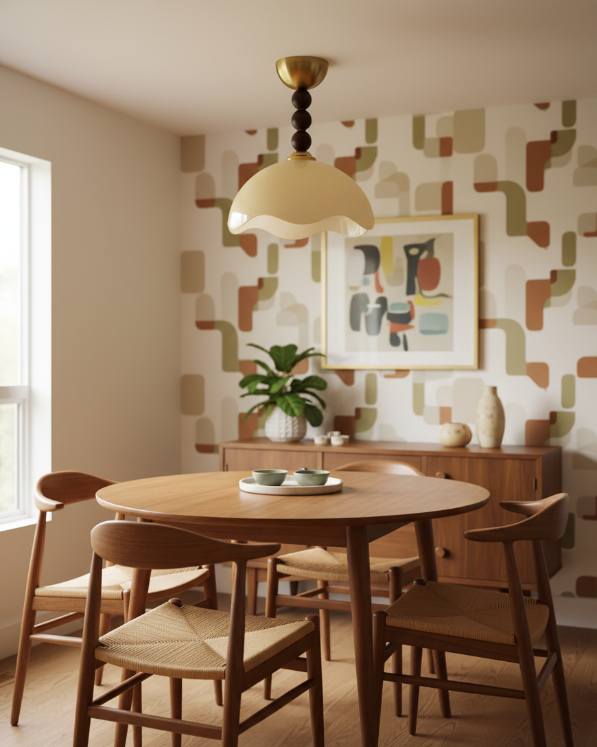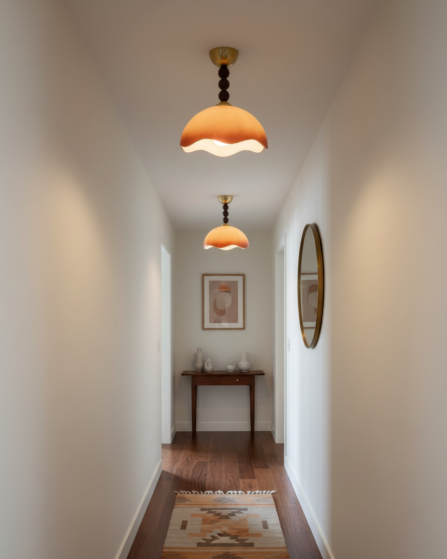 This Wave Coralia Ceiling Light  from Doco, named the 'Wave Coralia Ceiling Lamp,' artfully combines vintage charm with modern design. Its large, wave-like dome in a warm coral hue sets a comforting, ambient tone to any space. Below the dome, a series of dark wooden beads create a striking contrast, adding a touch of rustic refinement. Ideal for both contemporary and traditional interiors, this lamp offers both aesthetic versatility and timeless style, making it a superb choice for enhancing the ambience of your living room or dining area.