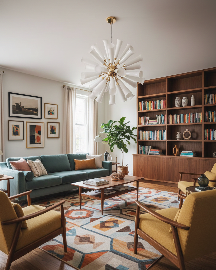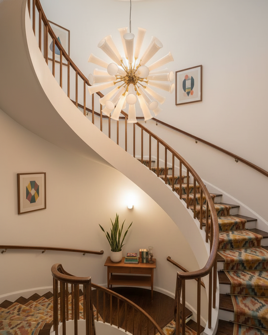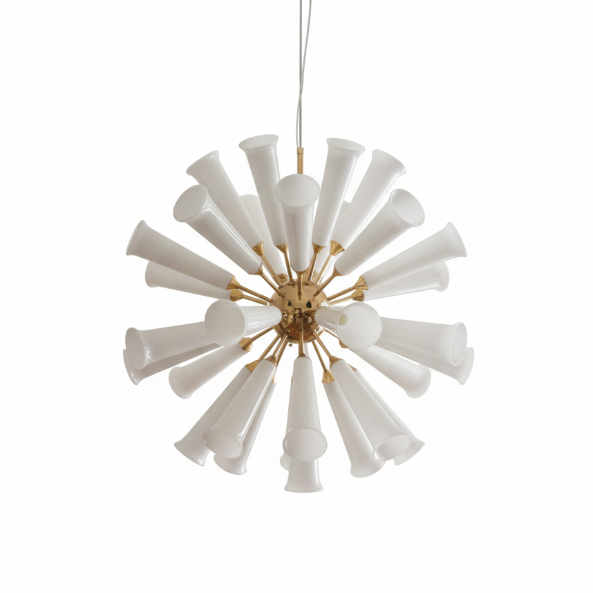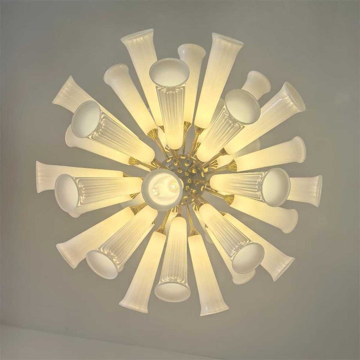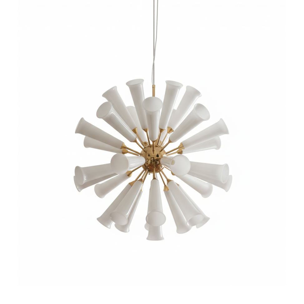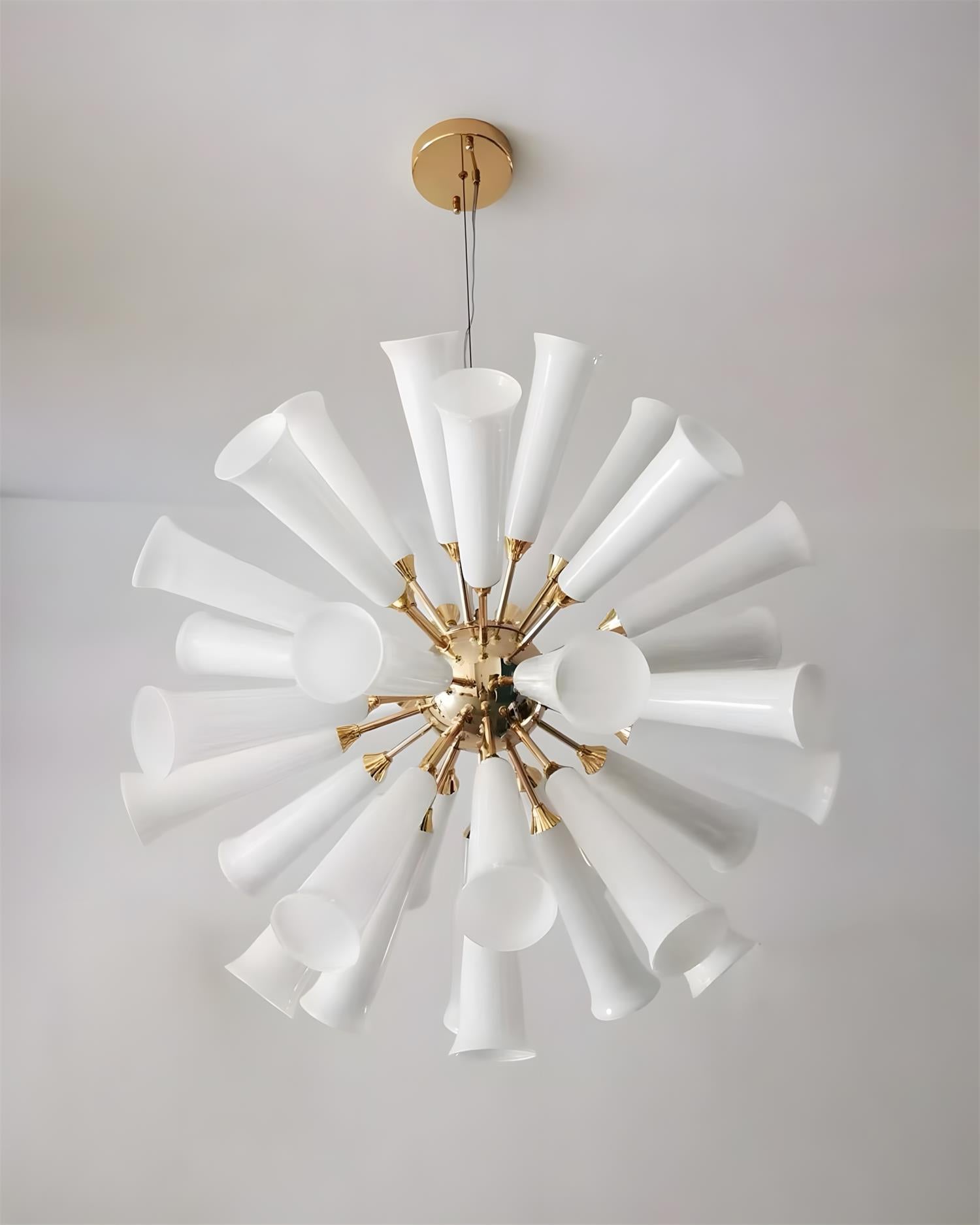 Solaria Bloom Chandelier unfolds like a radiant flower frozen at full bloom, with slender trumpet-shaped glass shades fanning outward in a perfectly balanced composition. Each frosted glass form softly diffuses light, creating a luminous halo that feels airy yet sculptural. Anchored by warm metal detailing at the core, the design blends mid-century clarity with a contemporary sense of movement and rhythm.
