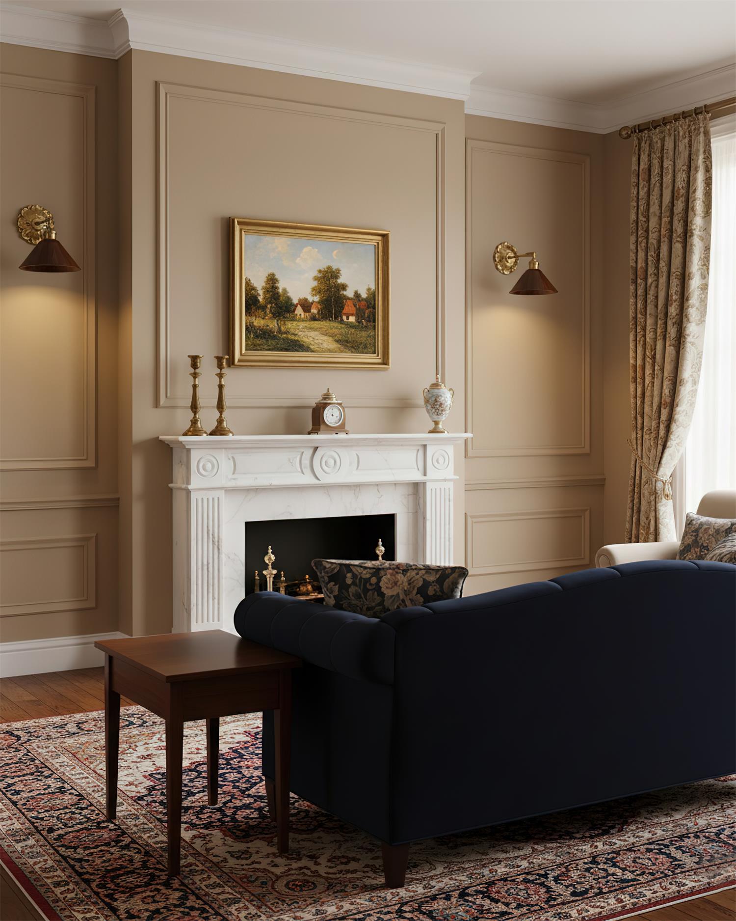 The Anthemion Wall Lamp is a refined harmony of classical elegance and modern craftsmanship. Its sculpted brass backplate, inspired by antique floral motifs, anchors the design with a sense of heritage, while the rich wooden shade—available in drum, dome, and cone silhouettes—adds warmth and texture. The Brass inner finish enhances the light’s glow, creating a luxurious yet inviting ambiance.