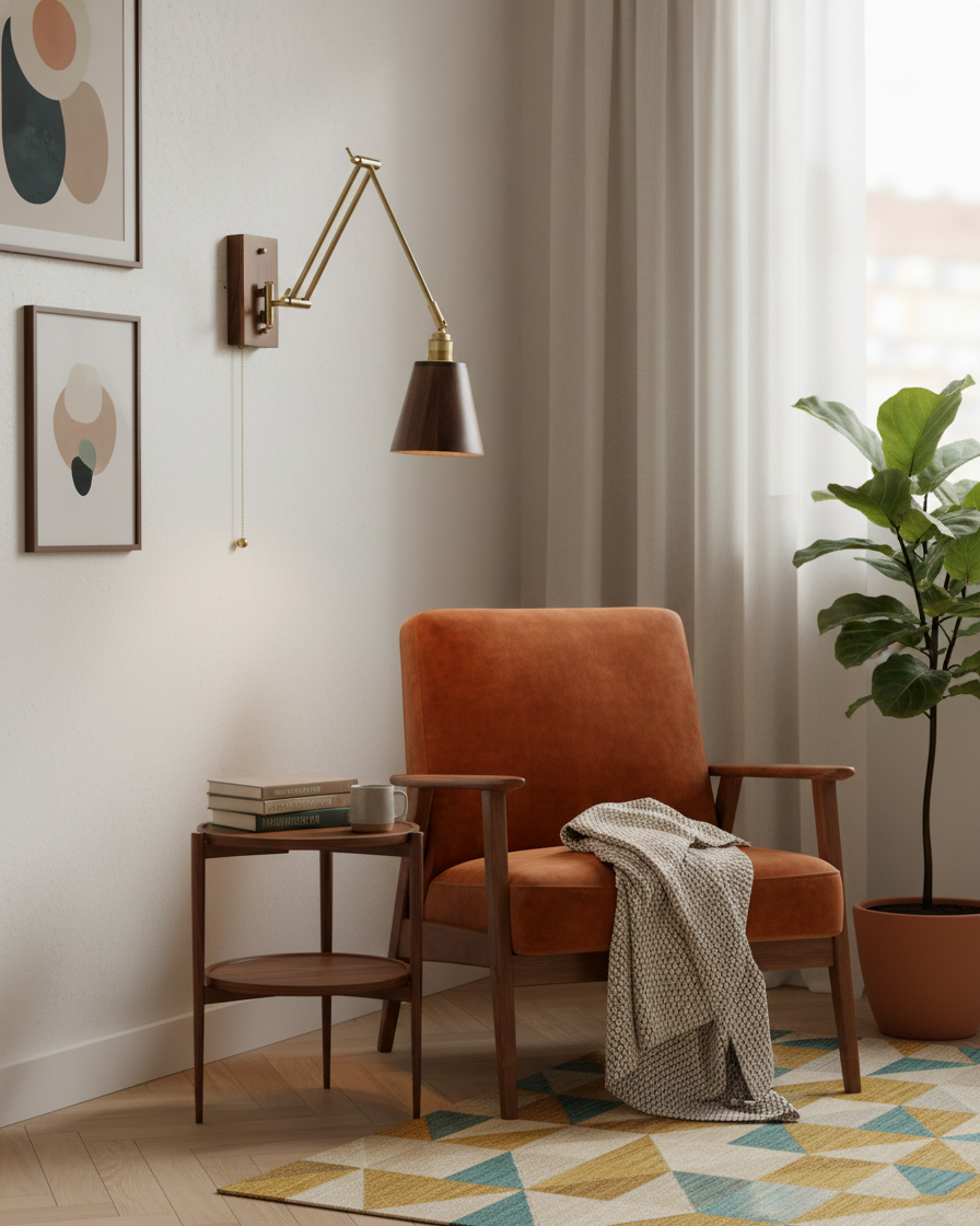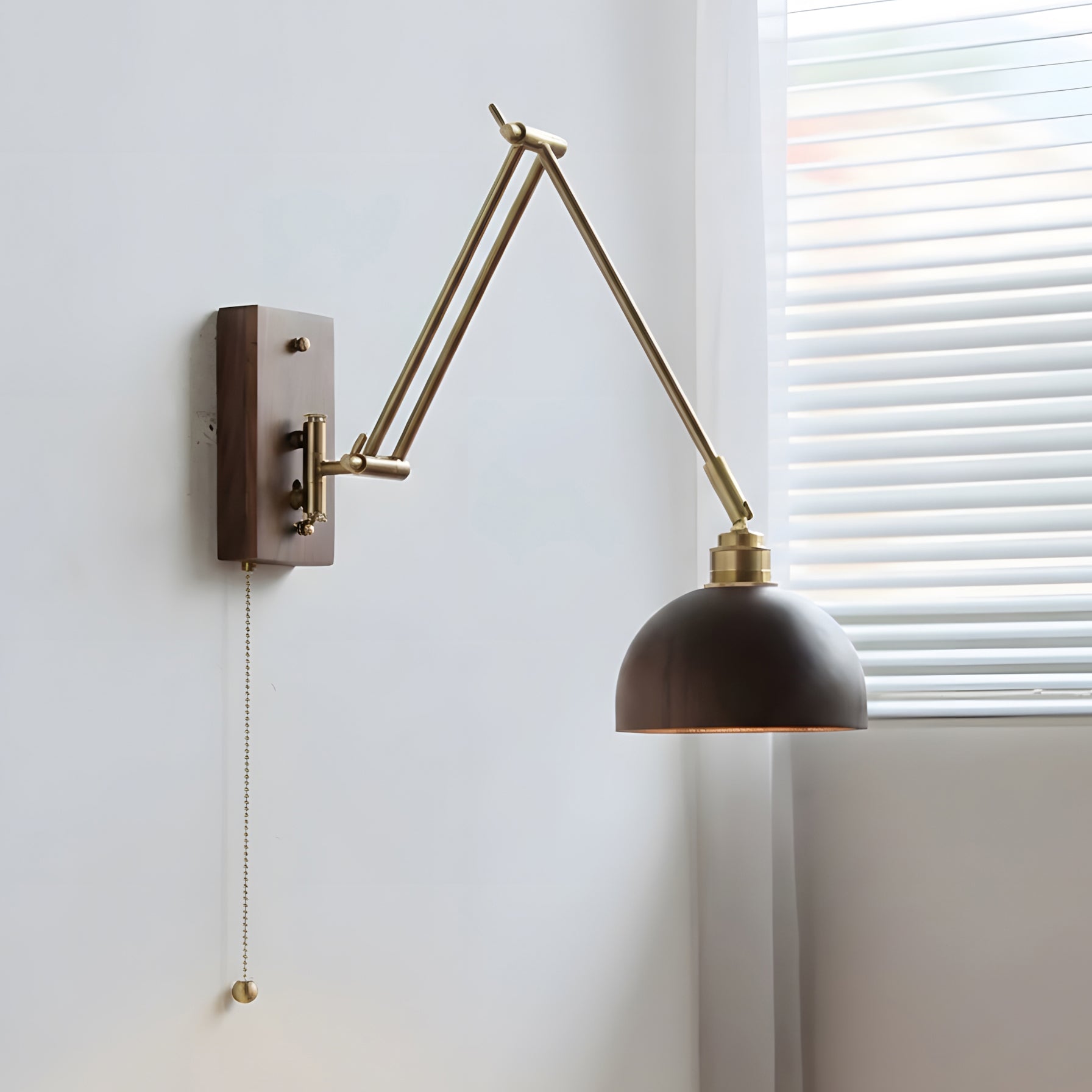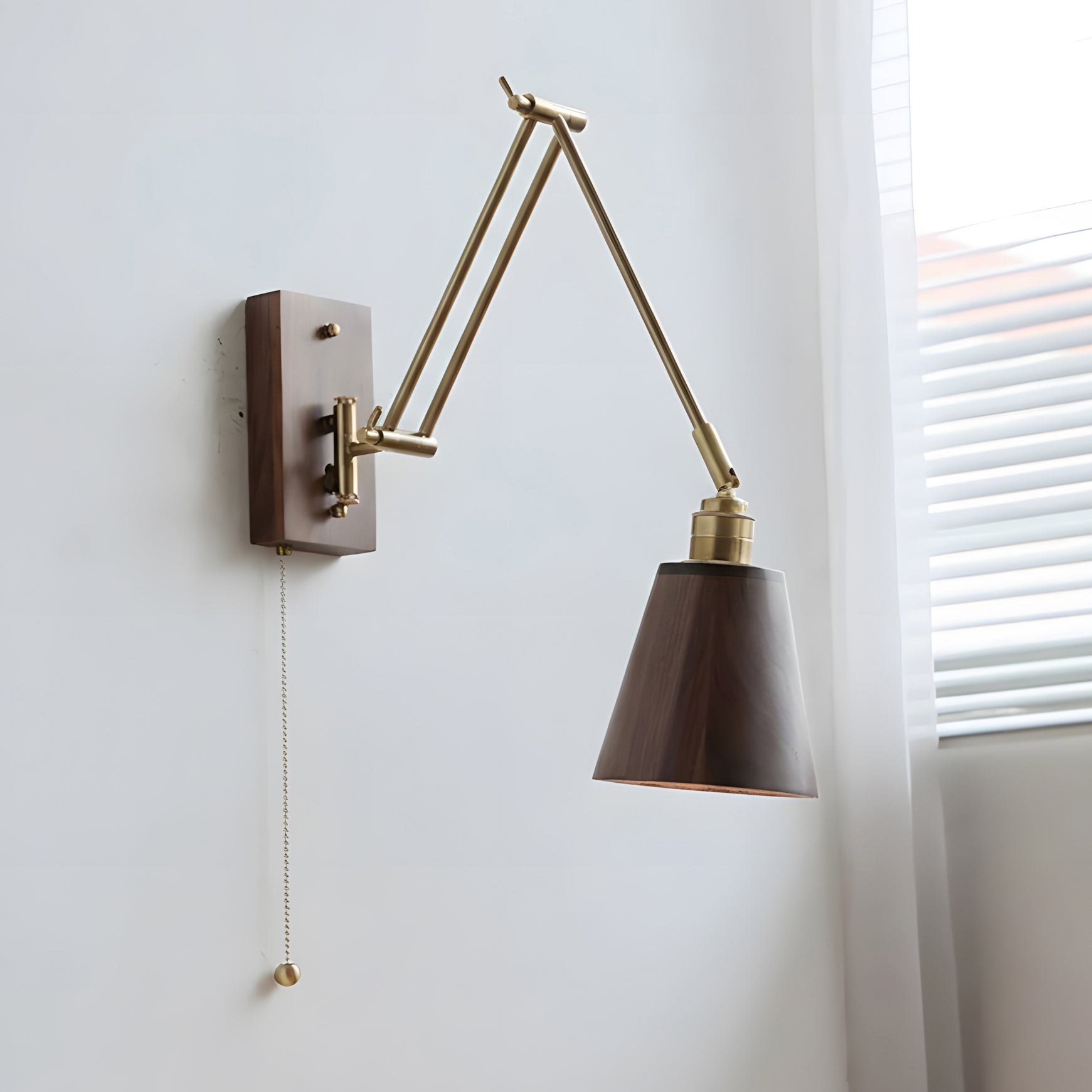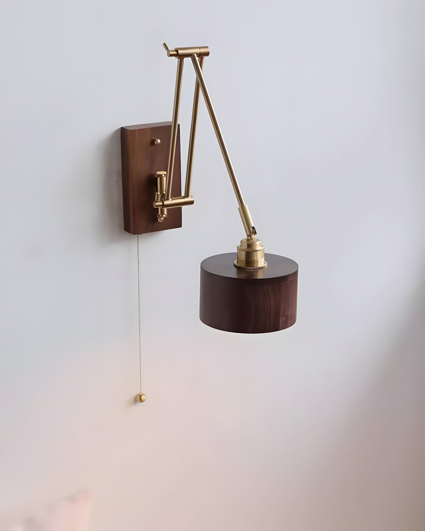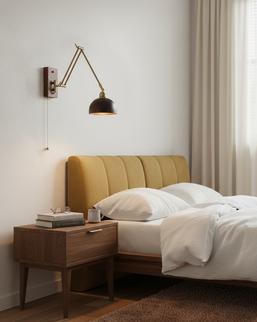Marlow Adjustable Wall Lamp blends mid-century restraint with modern functionality, designed for spaces that value both form and flexibility. Its articulated brass arms create a balanced, architectural silhouette, allowing the light to extend, retract, and pivot with ease. Paired with a rich wood wall mount and a softly contoured wooden shade, Marlow casts a warm, focused glow that feels intentional rather than decorative.