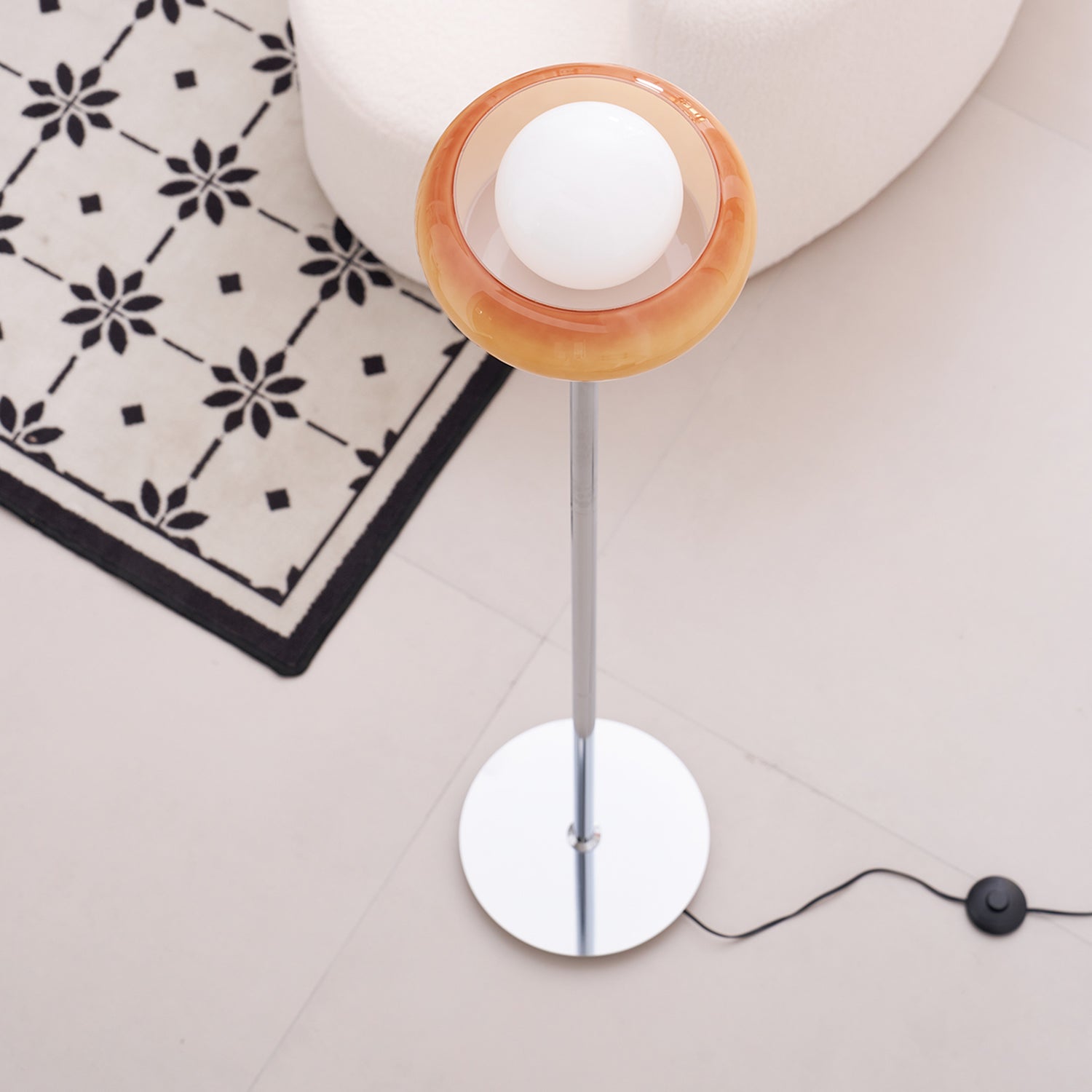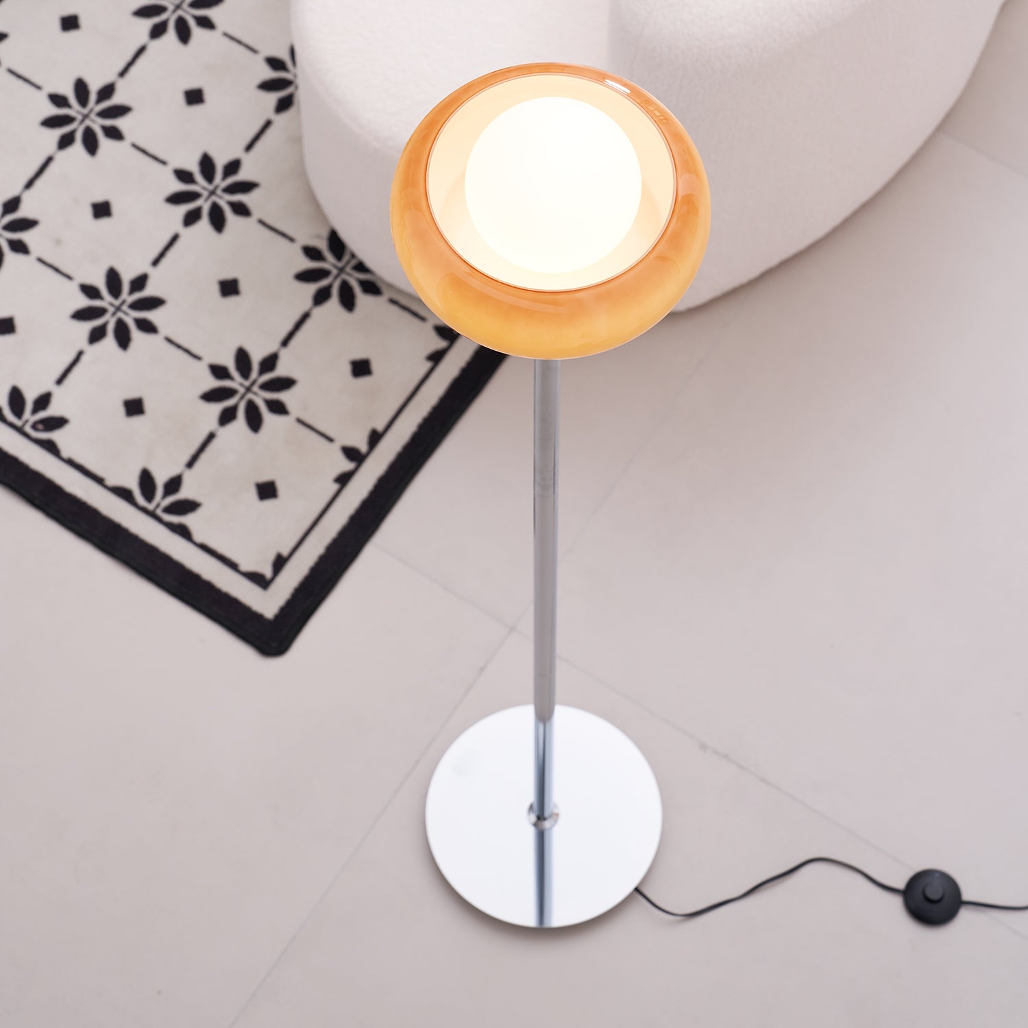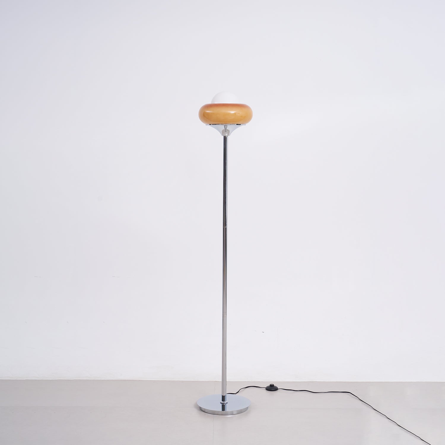 Guzzini Floor Lamp is the perfect combination of art and function. Its elegant, space-age design features a chic chrome lamp body, light brown plexiglass globe that cast a beautiful light that's perfect for any living area. With its stunning vintage condition, this lamp is the ultimate statement piece that will add both style and function to your home.