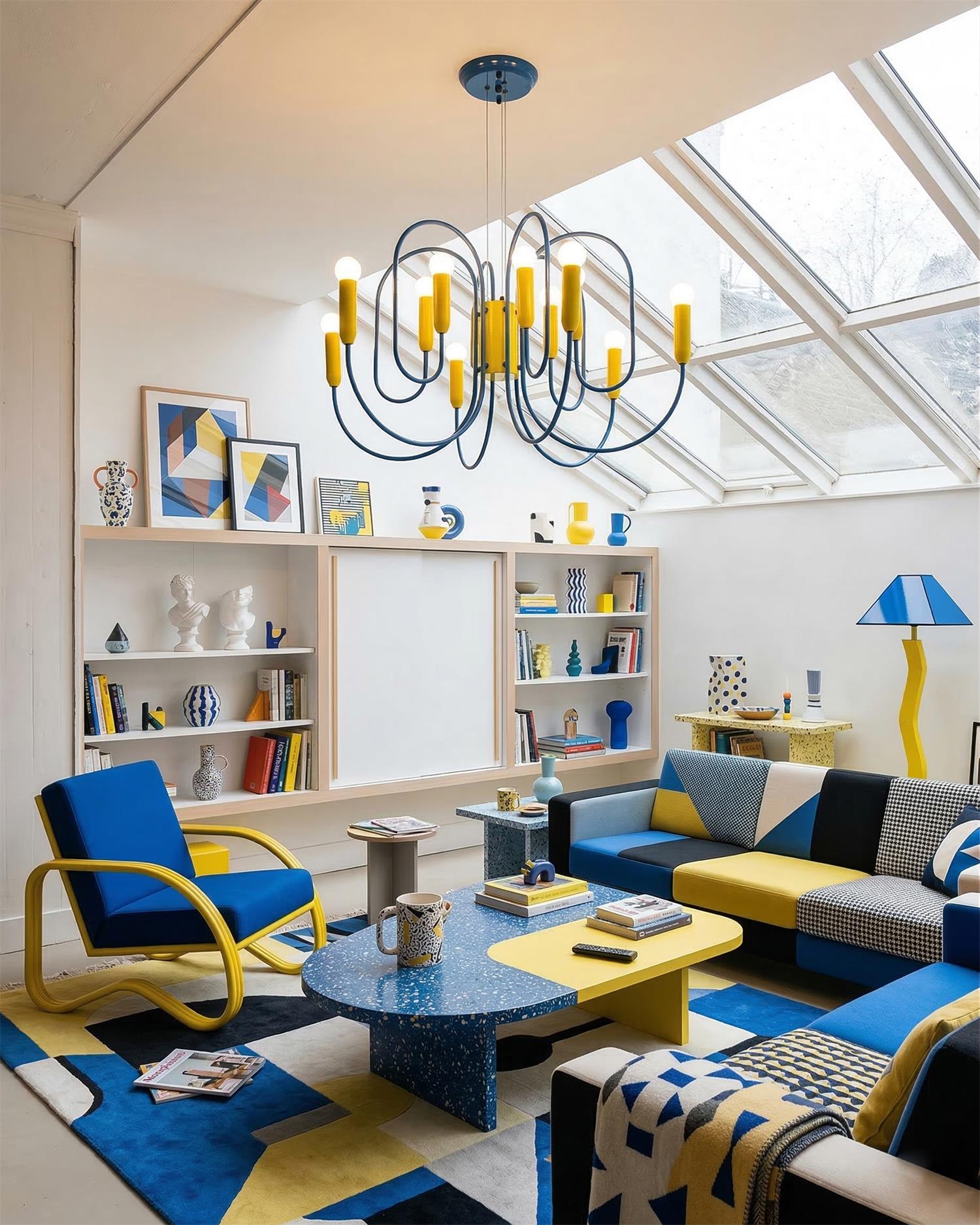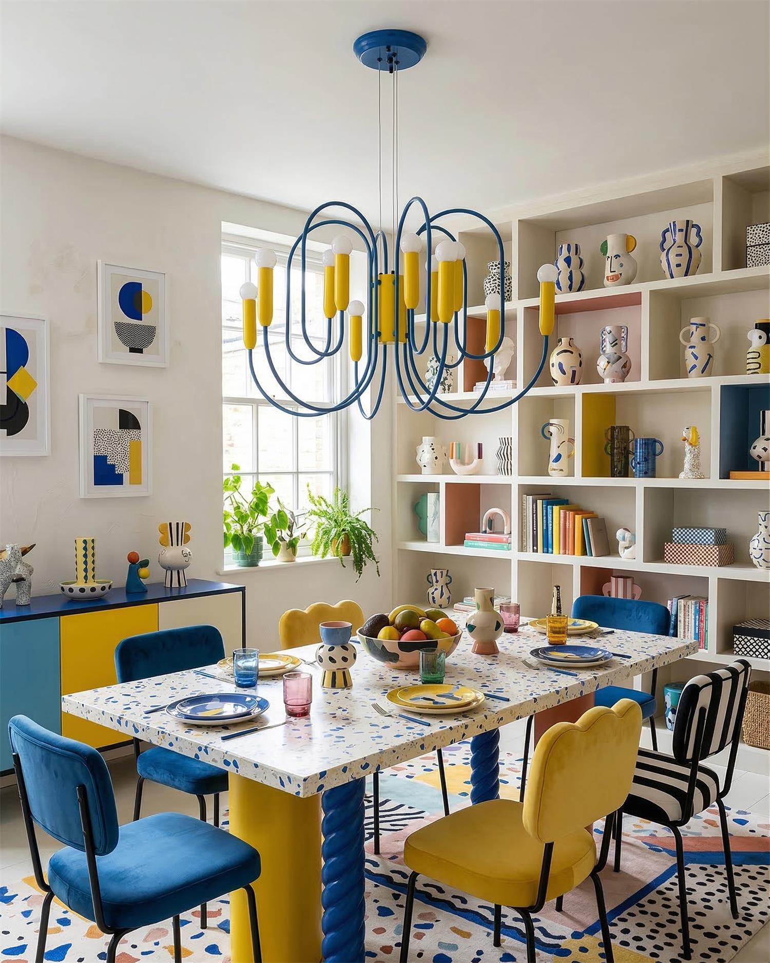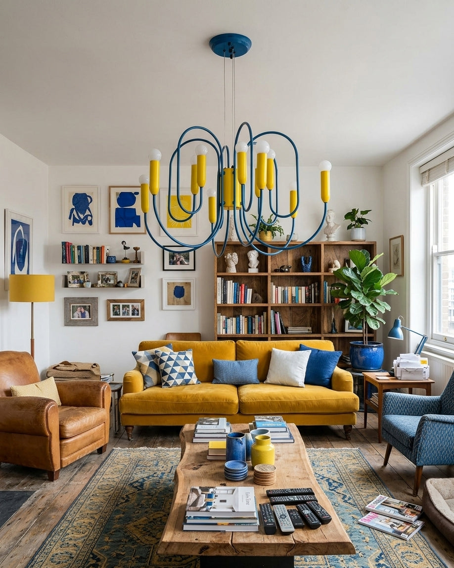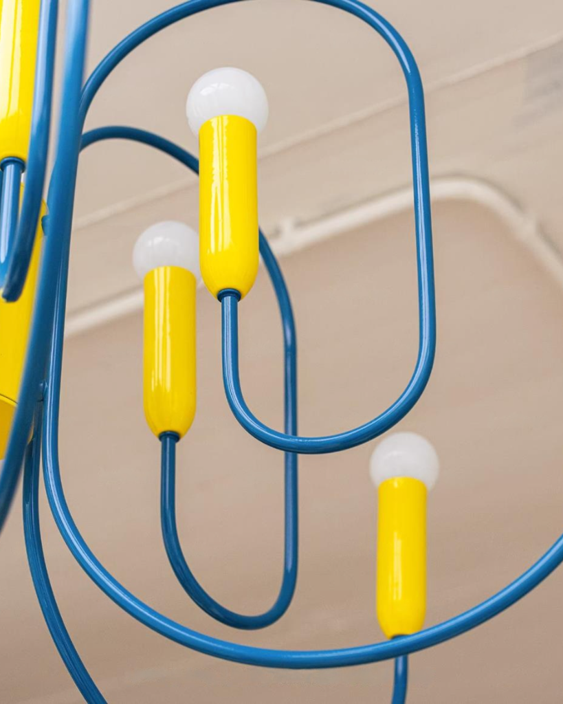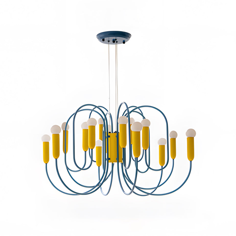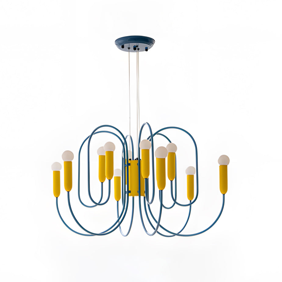The Solvico Chandelier makes a bold sculptural statement through its rhythmic network of looping blue metal arms and vibrant yellow cylindrical accents, creating a design that feels playful, graphic, and unmistakably contemporary. Topped with softly rounded white diffusers, each light point adds a gentle visual softness that balances the chandelier’s energetic geometry, while the striking color contrast brings a fresh, art-driven character to the piece.