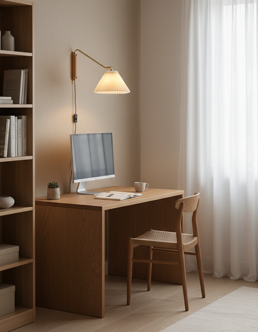 The Dorset Wall Lamp by Docos, a perfect fusion of understated elegance and functional design. Its delicately pleated shade casts a warm, inviting glow, while the brass-finished arm and wooden base offer a sleek, modern touch. The adjustable arm allows you to customize the lighting angle, making it as practical as it is stylish.