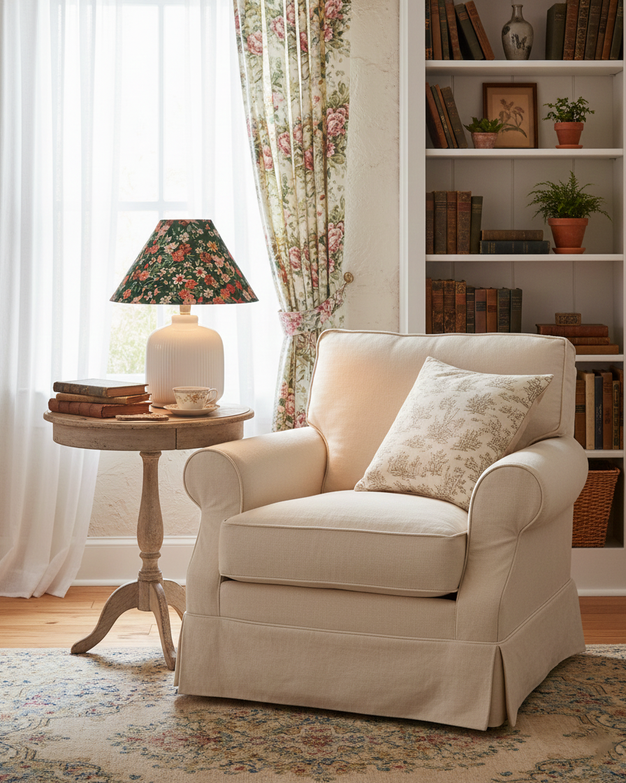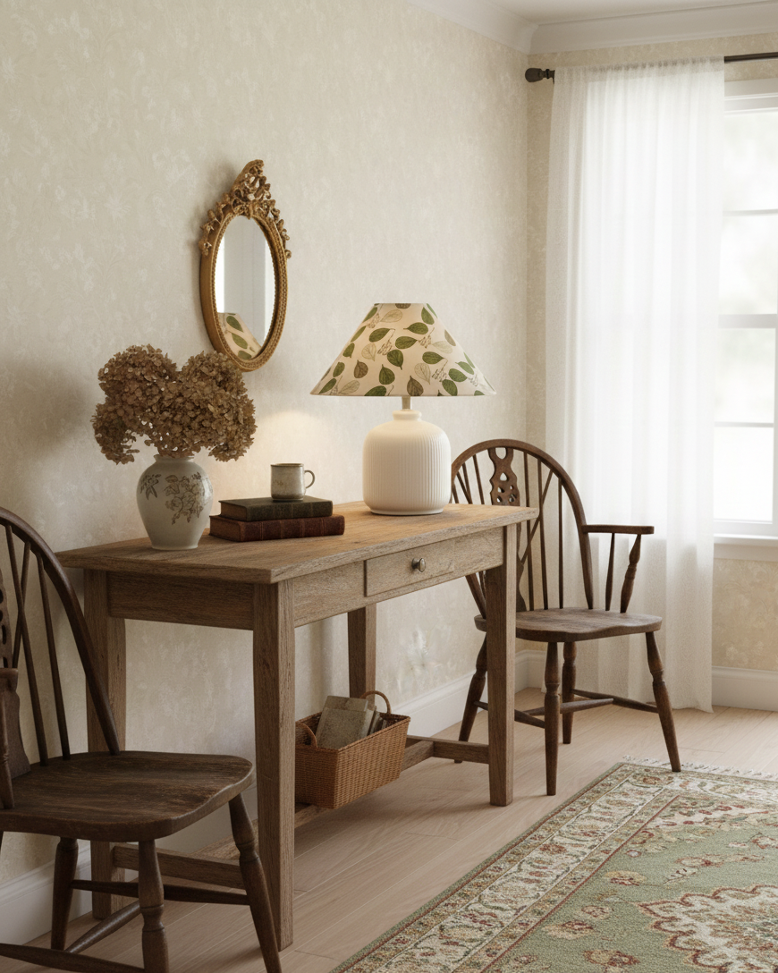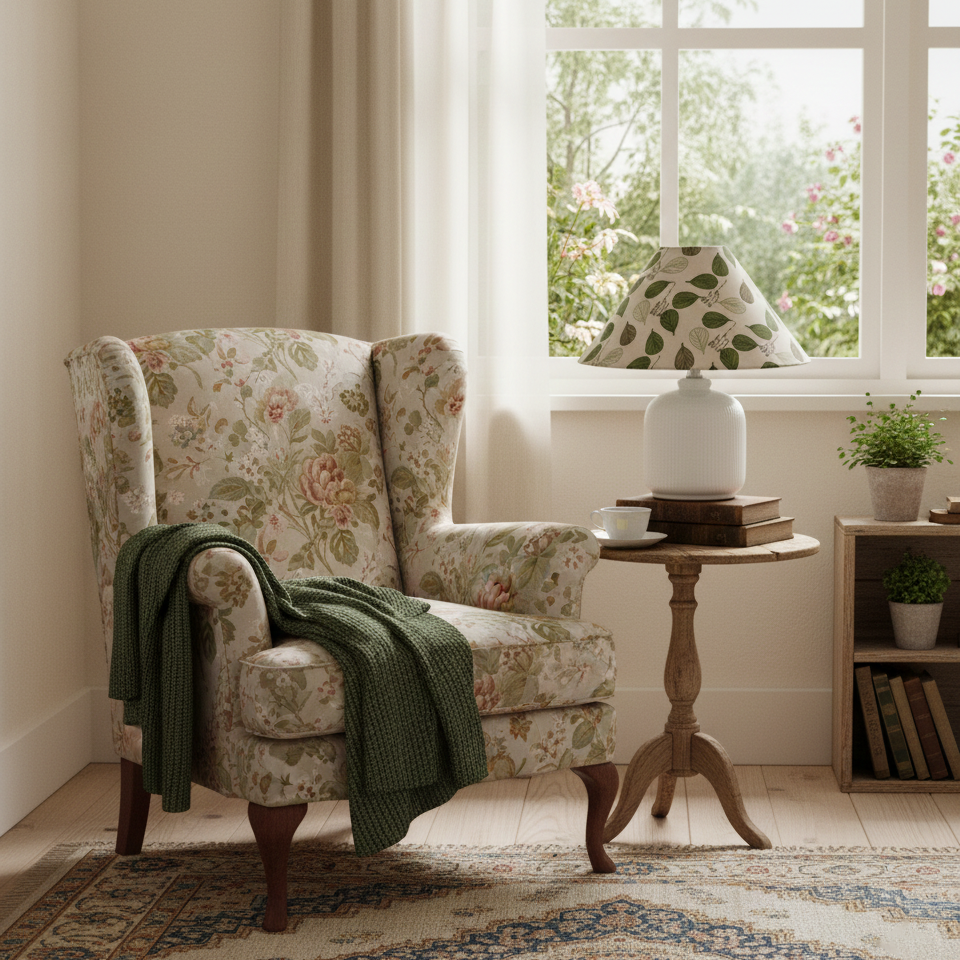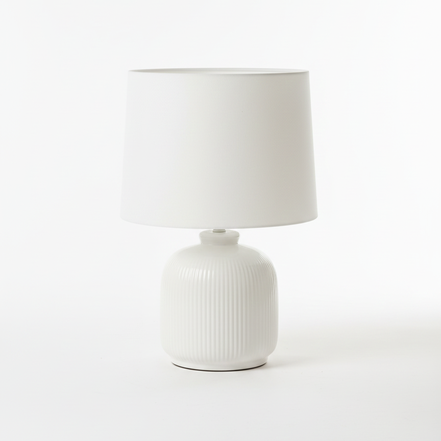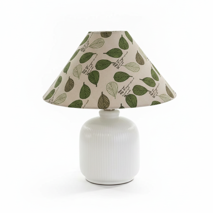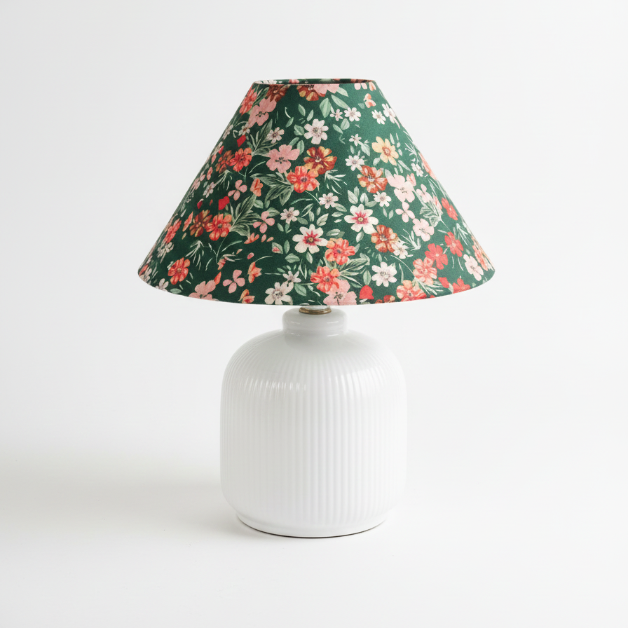Evergreen Floral Table Lamp blends classic charm with a fresh, botanical spirit. A crisp white, softly ribbed ceramic base provides a calm and sculptural foundation, while the floral fabric shade brings the piece to life with layered blossoms set against a deep green backdrop. When illuminated, the patterned shade filters light gently, casting a warm, inviting glow that feels both nostalgic and lively.