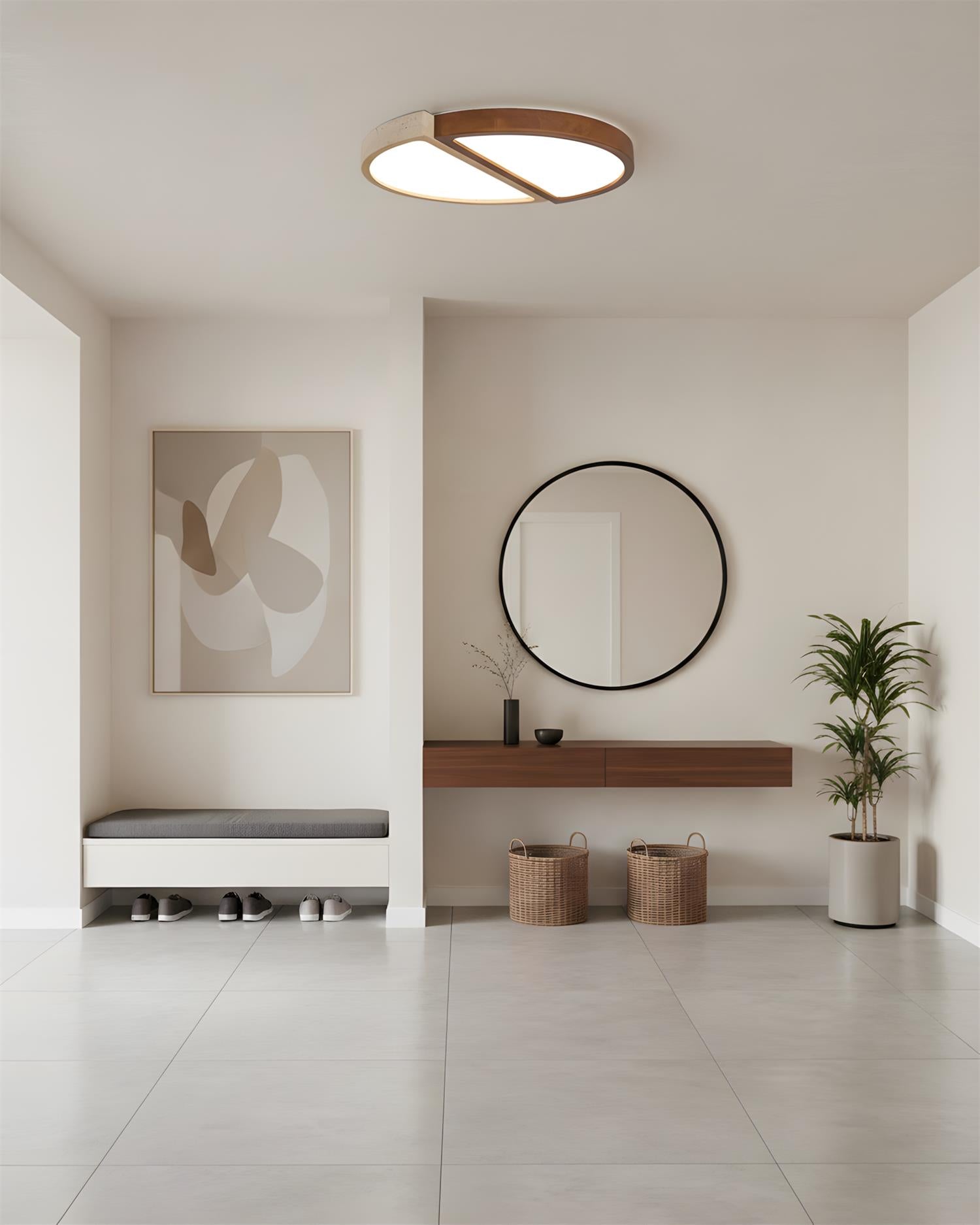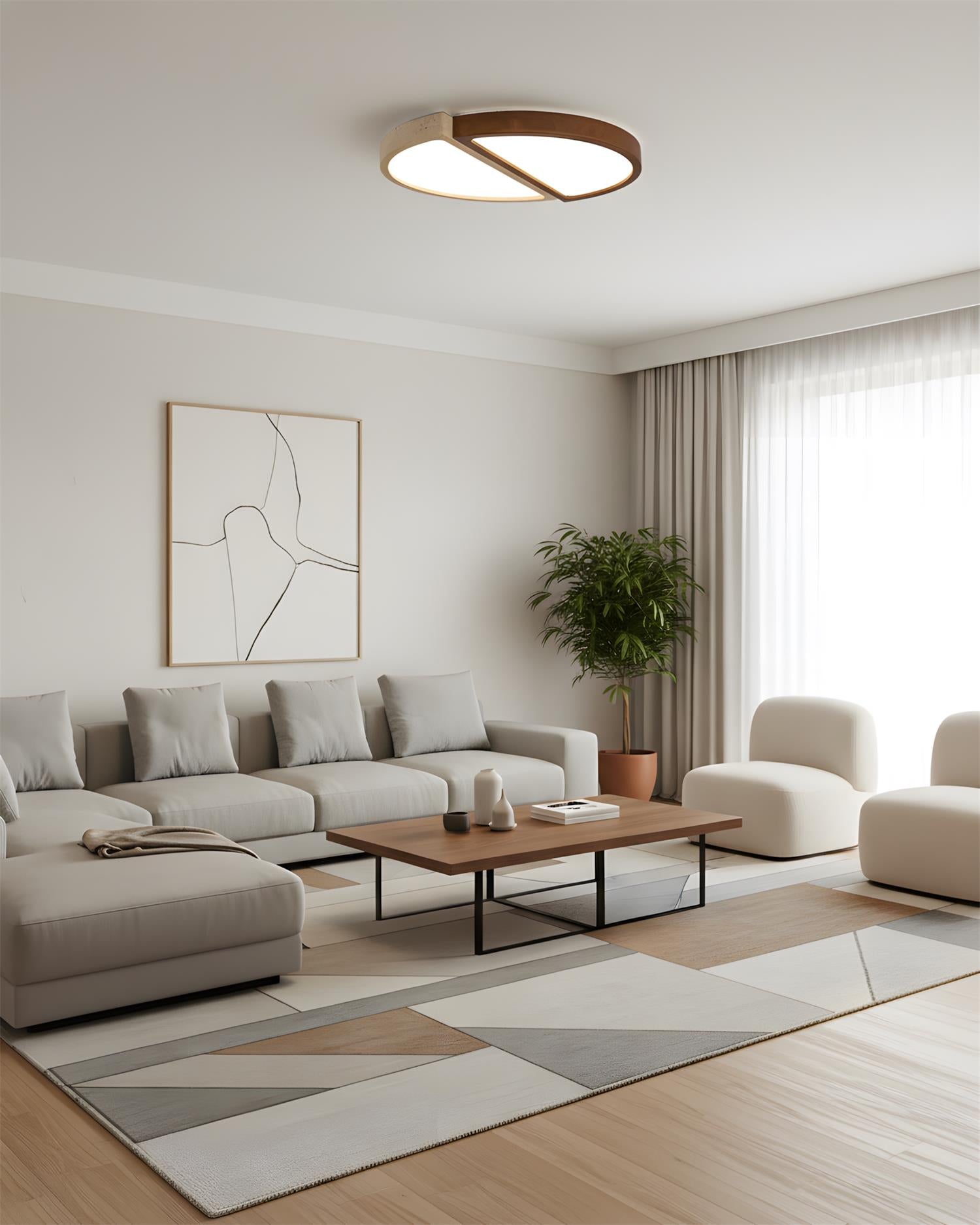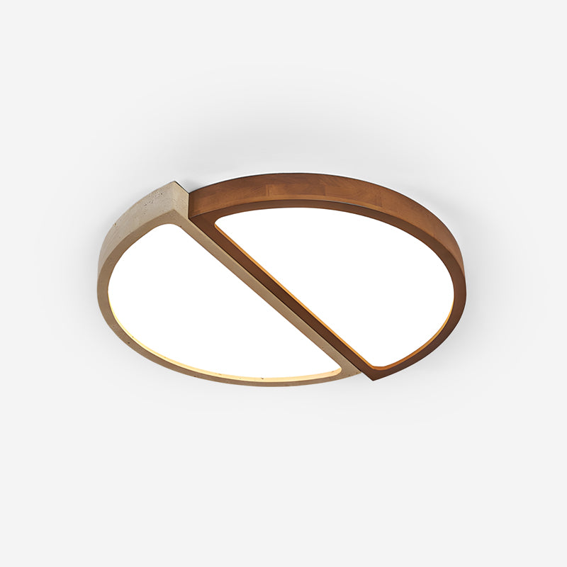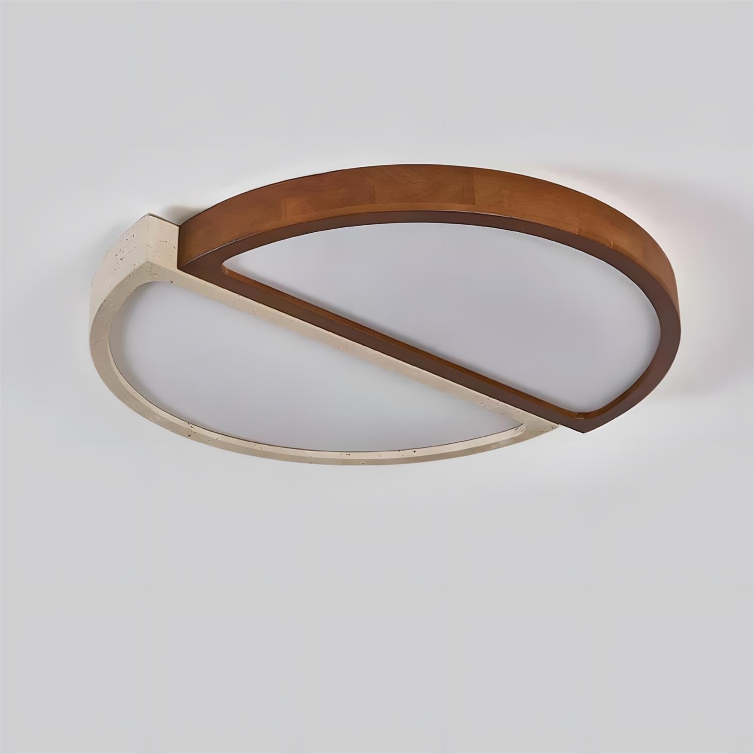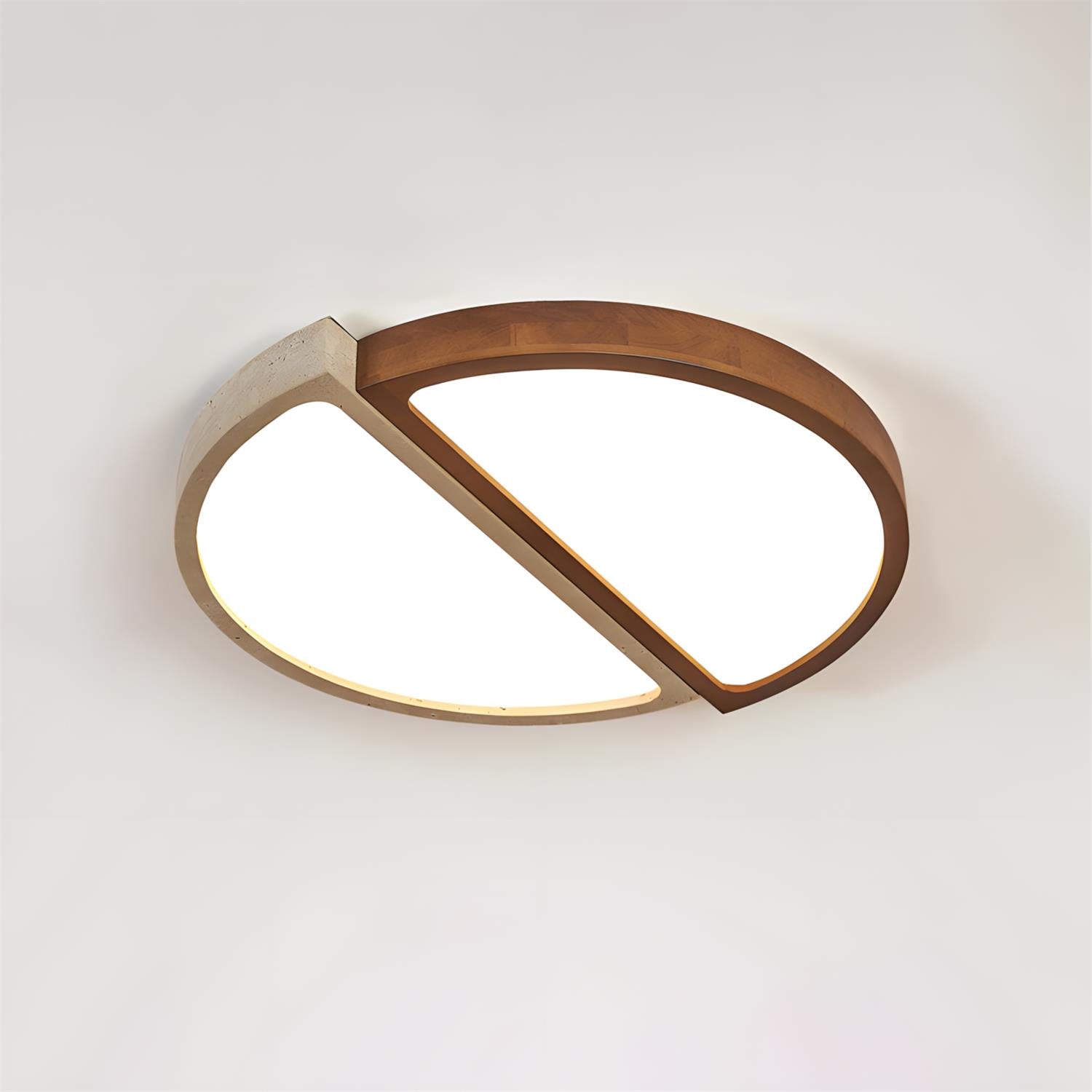 Alpine Duo Ceiling Lamp is a study in balance and contrast, where geometry meets natural texture. Two overlapping arcs—one in warm wood grain, the other in a stone-inspired finish—create a quiet dialogue between softness and structure. The integrated light surfaces emit an even, gentle glow that feels both architectural and inviting, defining the ceiling without overwhelming the space.