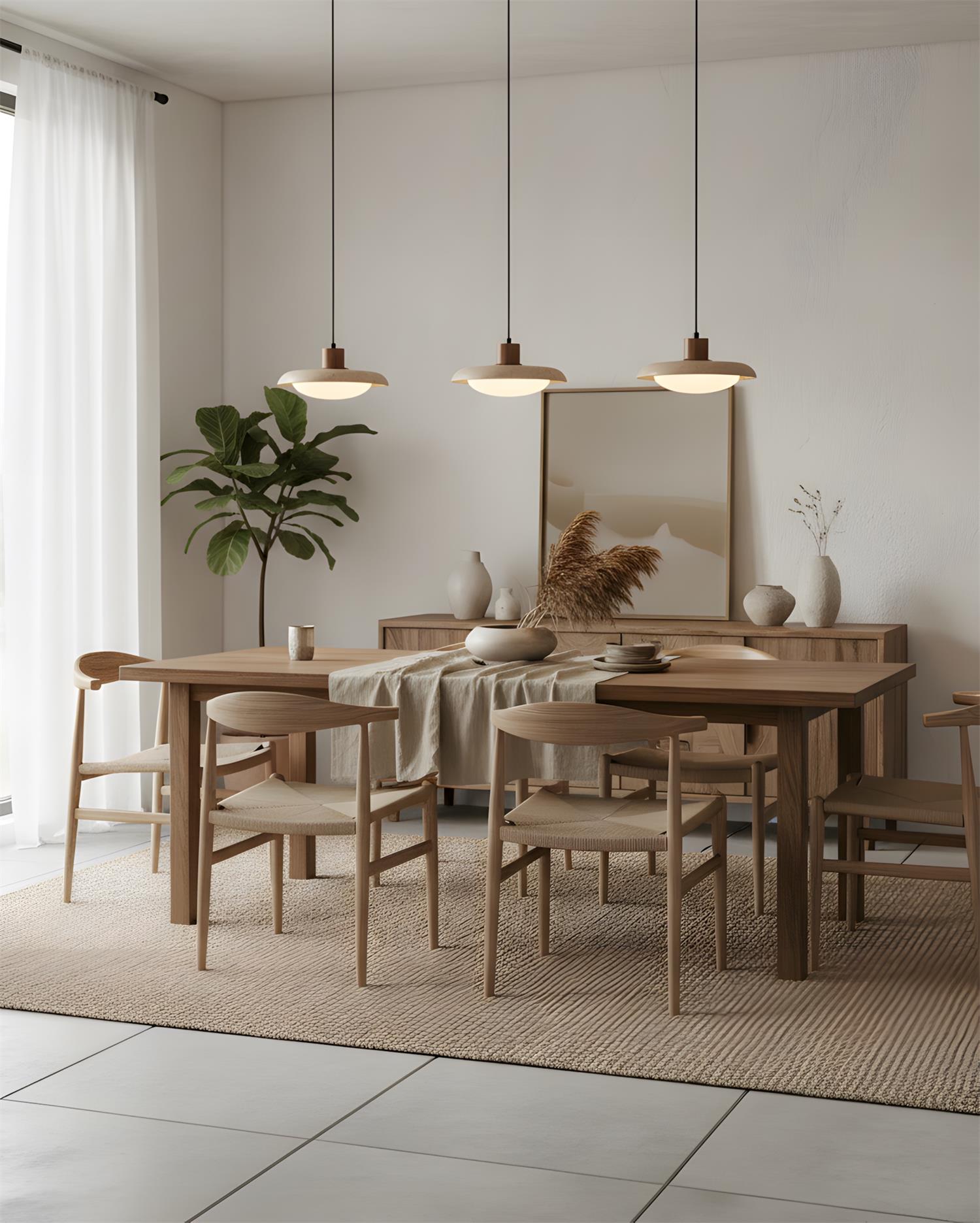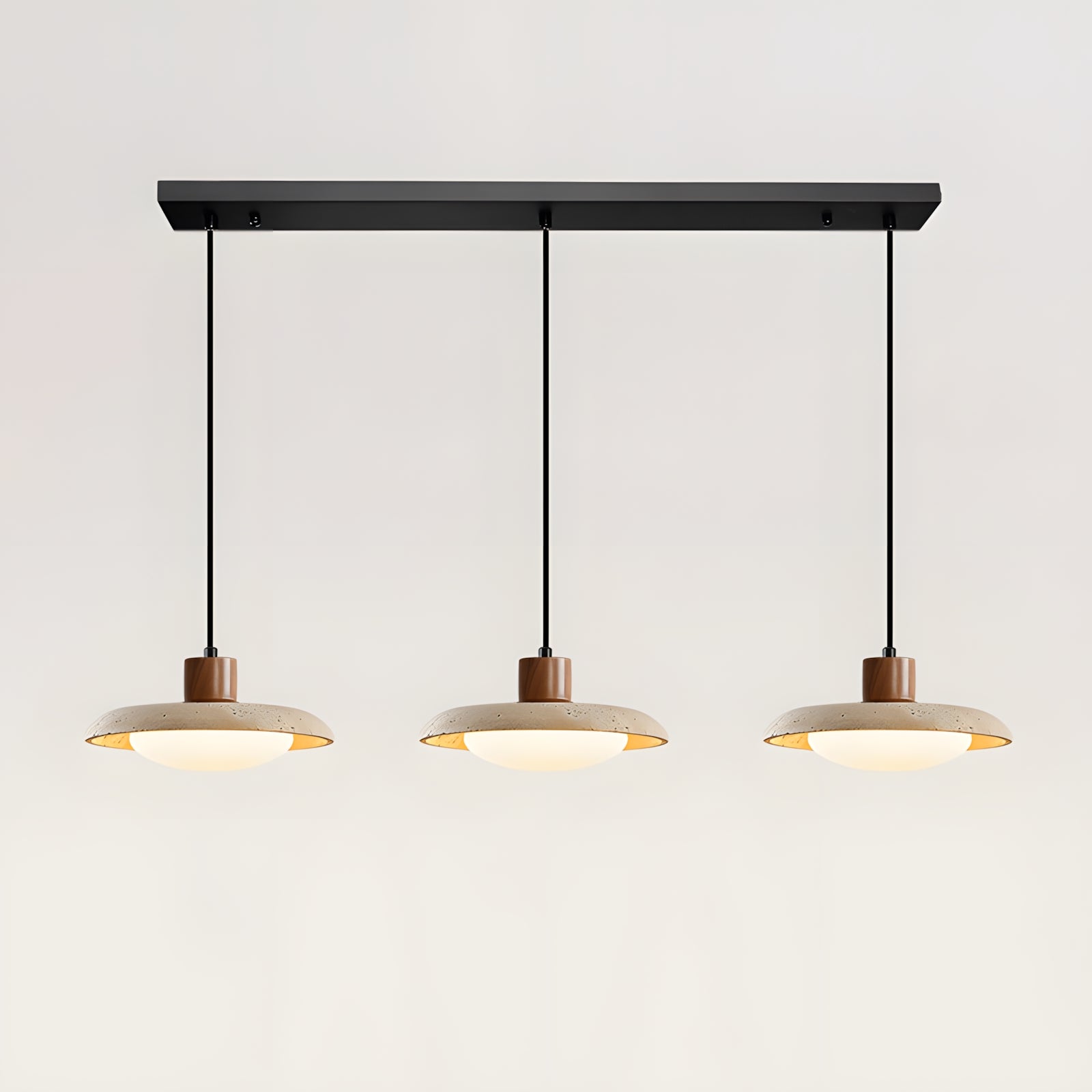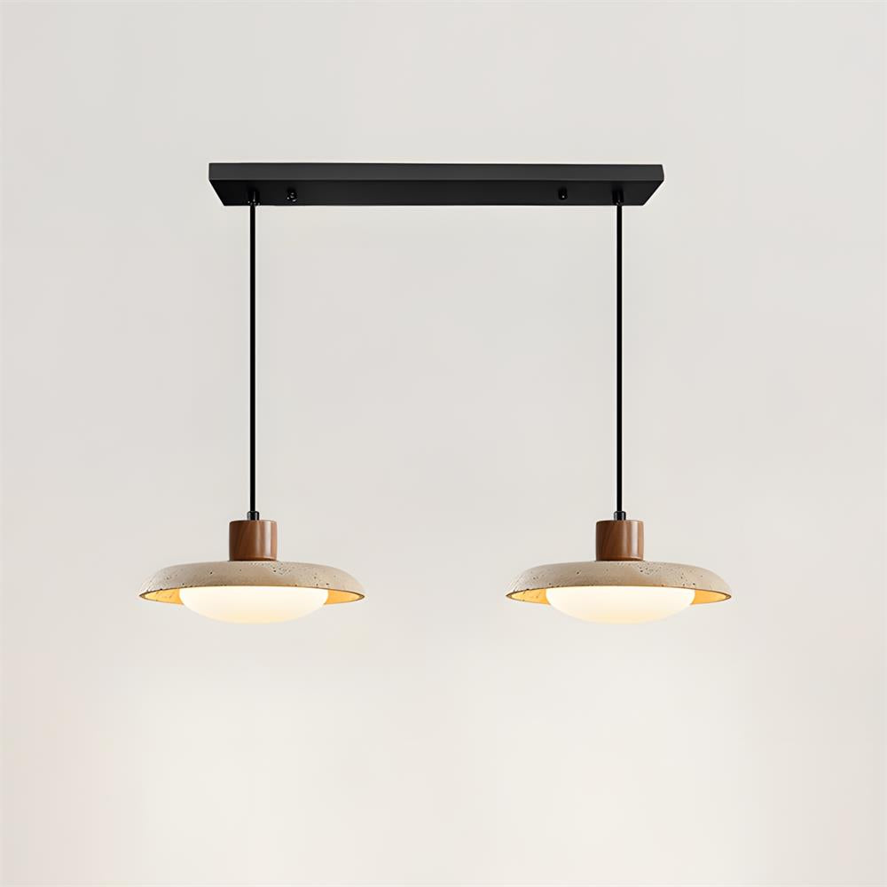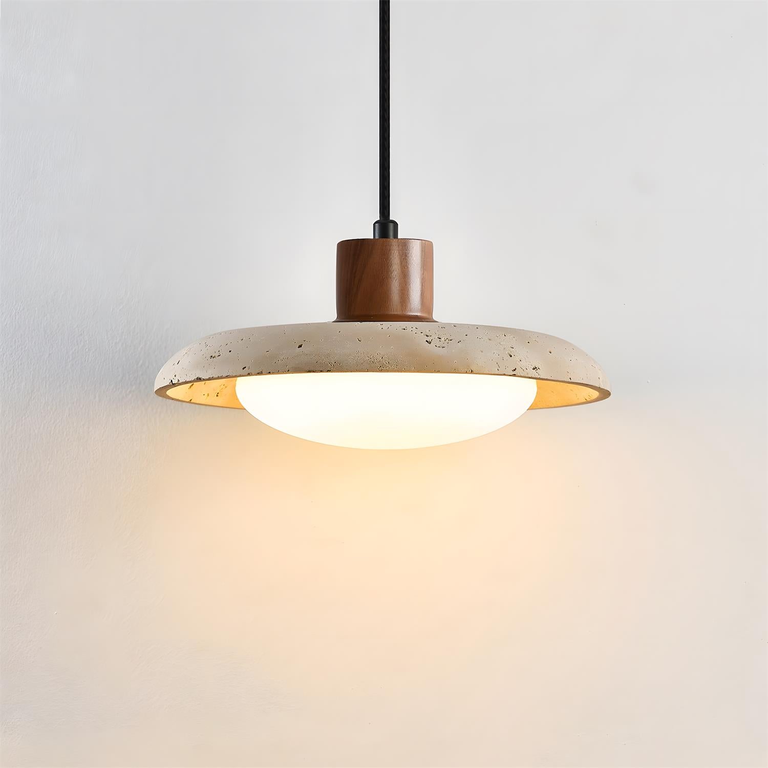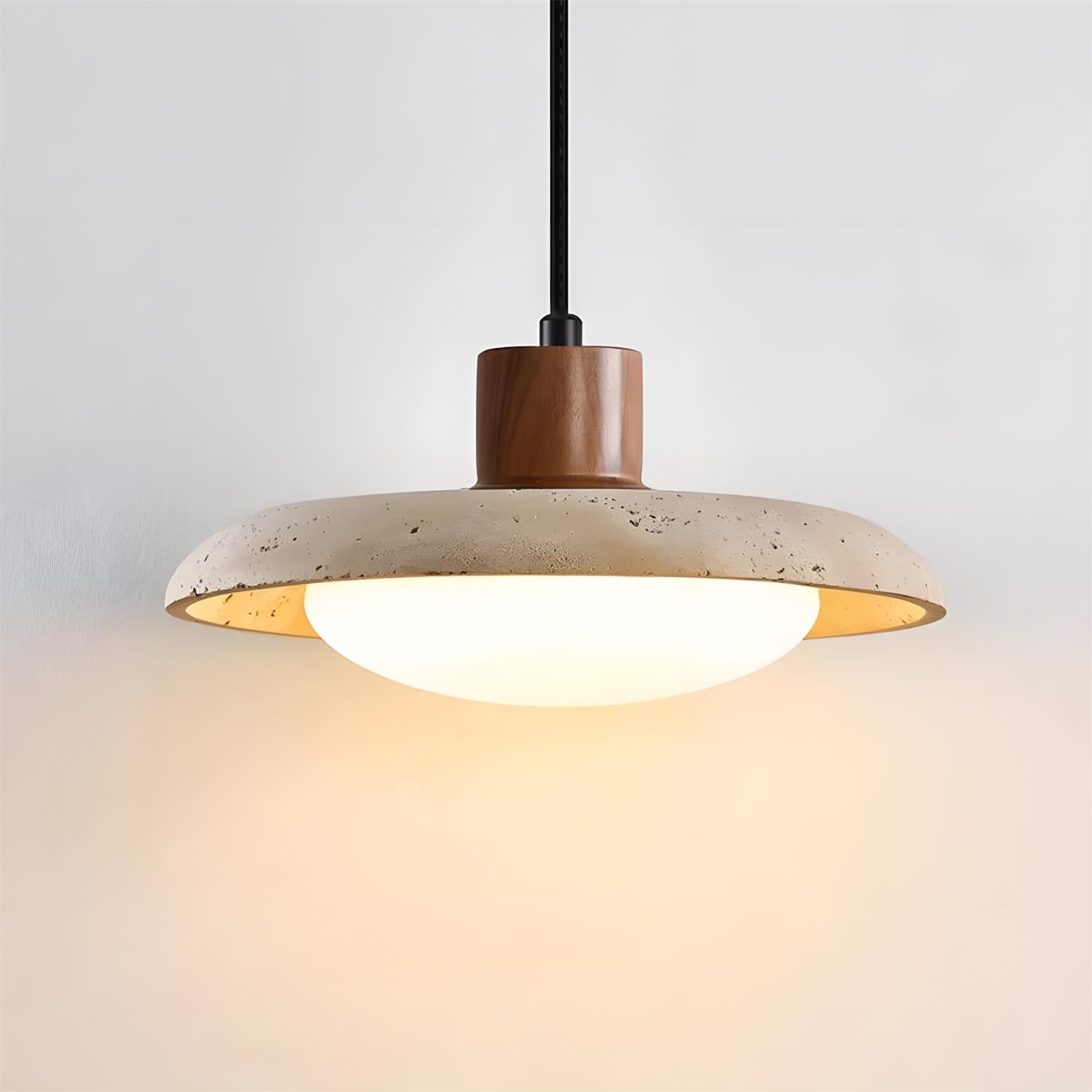 Brimwood Pendant Lamp balances natural texture with refined simplicity. A broad, gently rounded stone-like shade forms a calm horizontal profile, paired with a warm wooden collar that adds an organic contrast. Beneath, a softly diffused globe casts an even, comfortable glow, creating a layered play of light and material. The design feels grounded yet light, drawing inspiration from mid-century forms and contemporary minimalism.