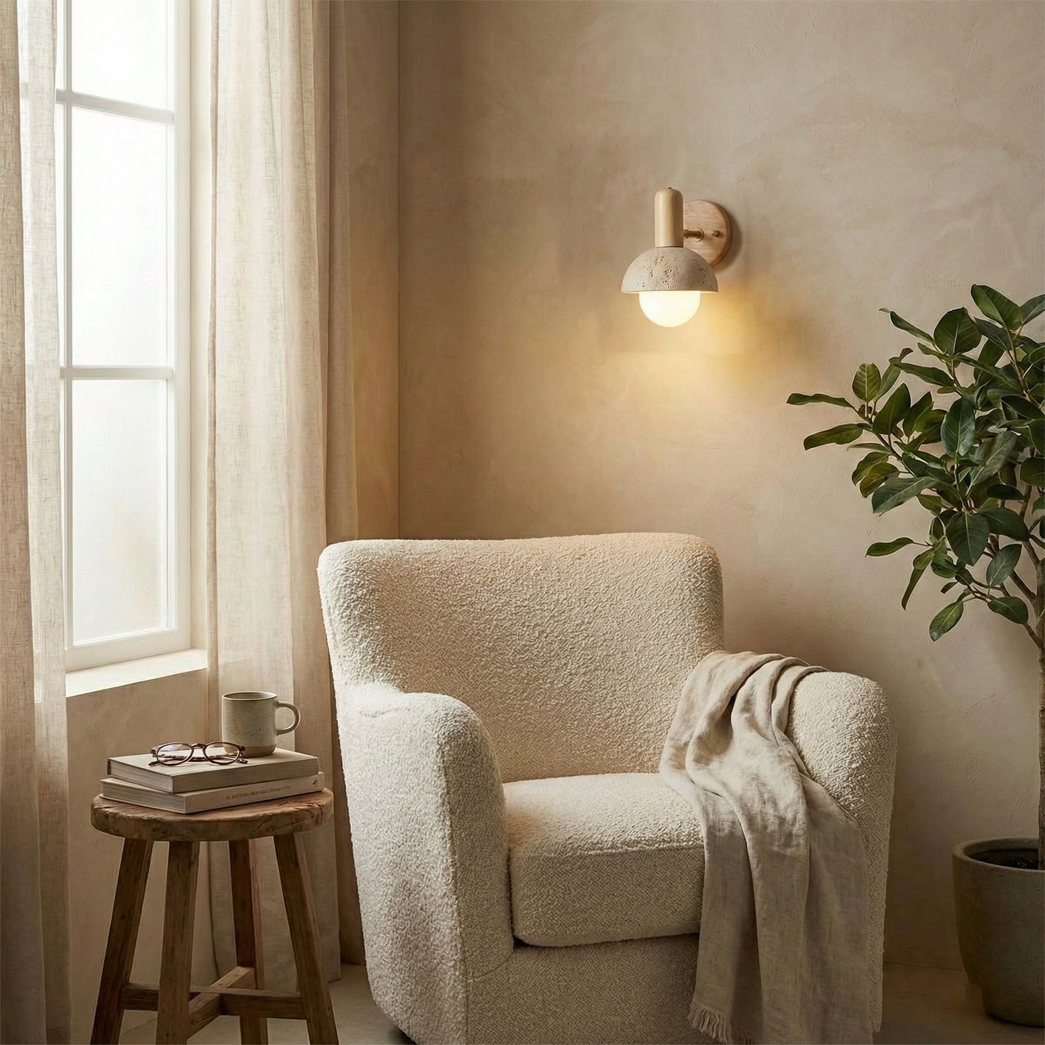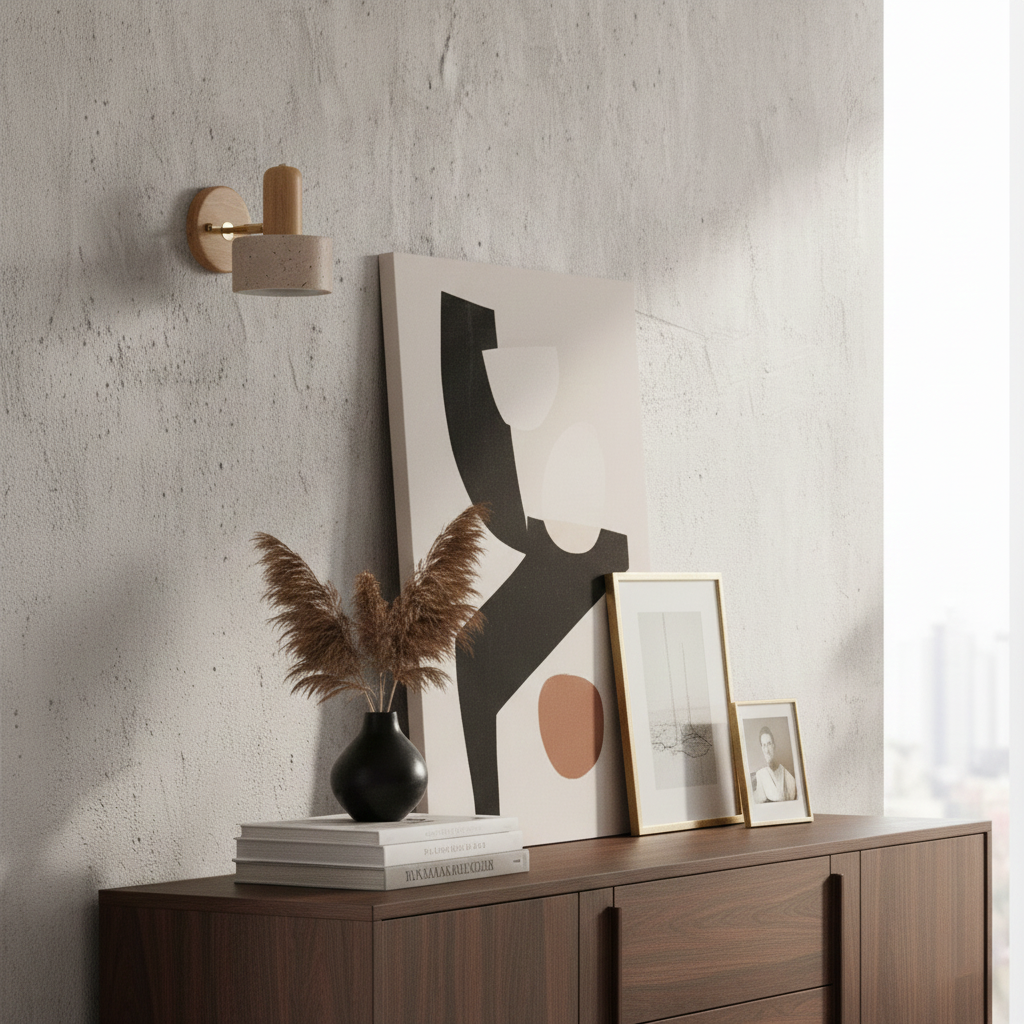 The Brunite Wall Lamp celebrates the sculptural beauty of natural travertine and solid wood. With a minimalist dome or cylindrical travertine shade, each piece highlights the stone's raw pores and subtle tonal variations, exuding a quiet, grounded elegance. The rounded wood fixture—available in warm walnut or blonde oak tones—adds a tactile warmth, creating a balanced composition of texture and tone.