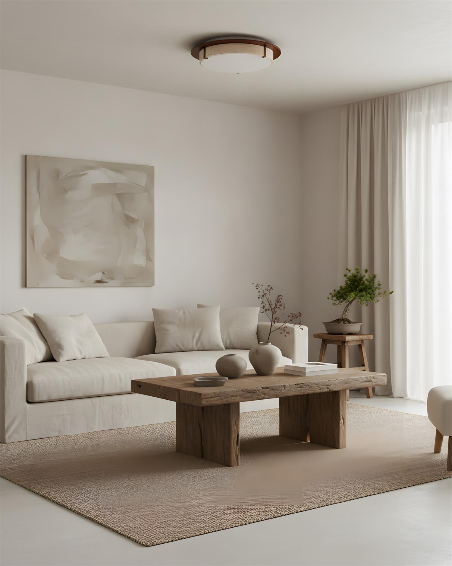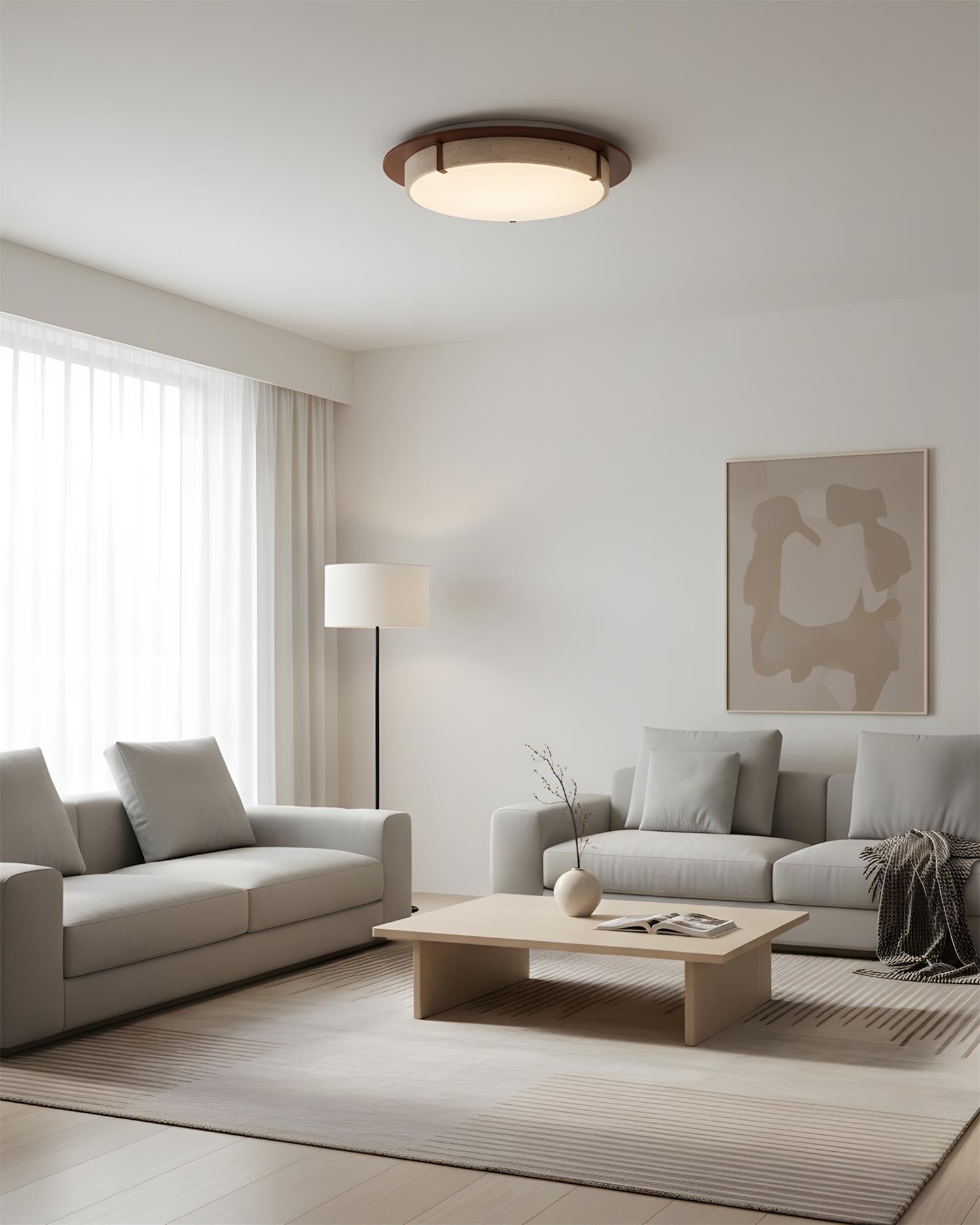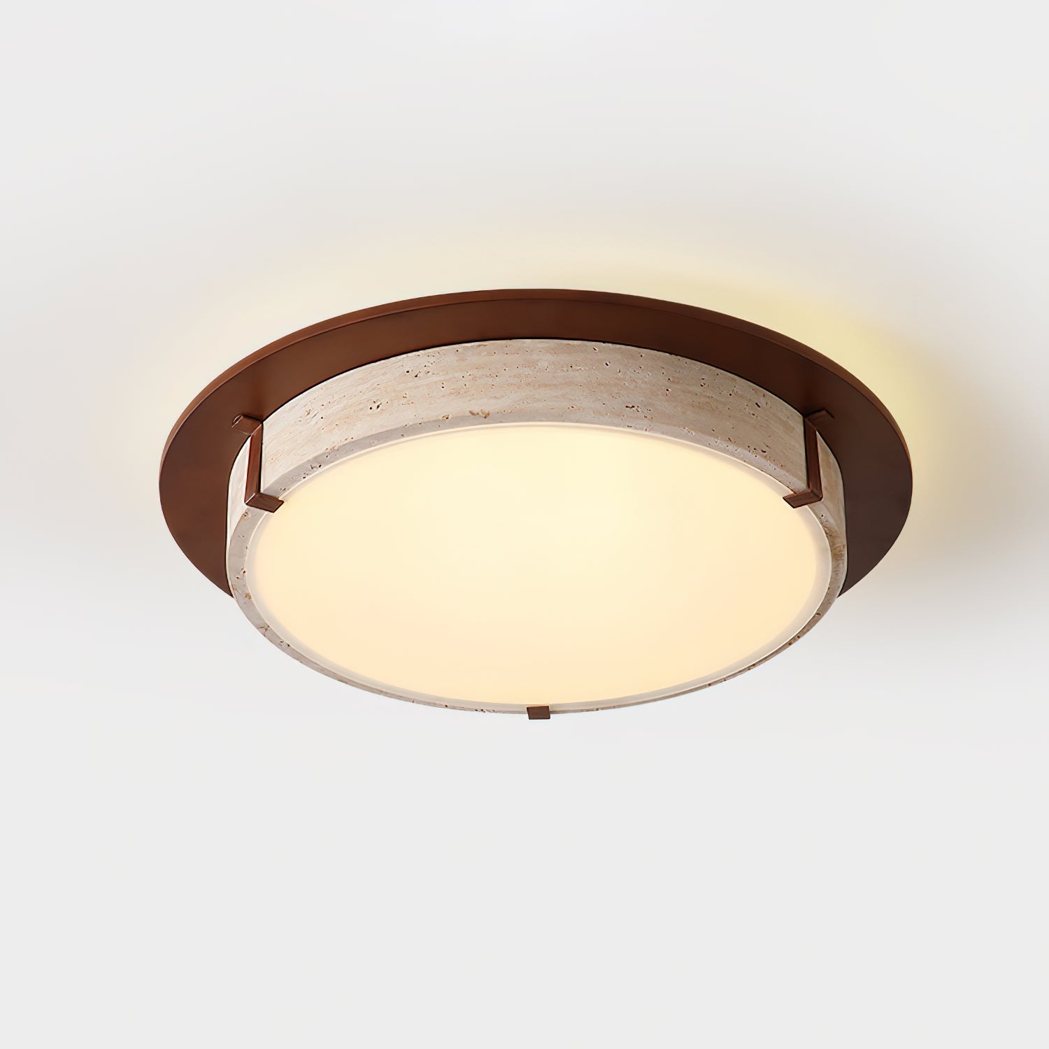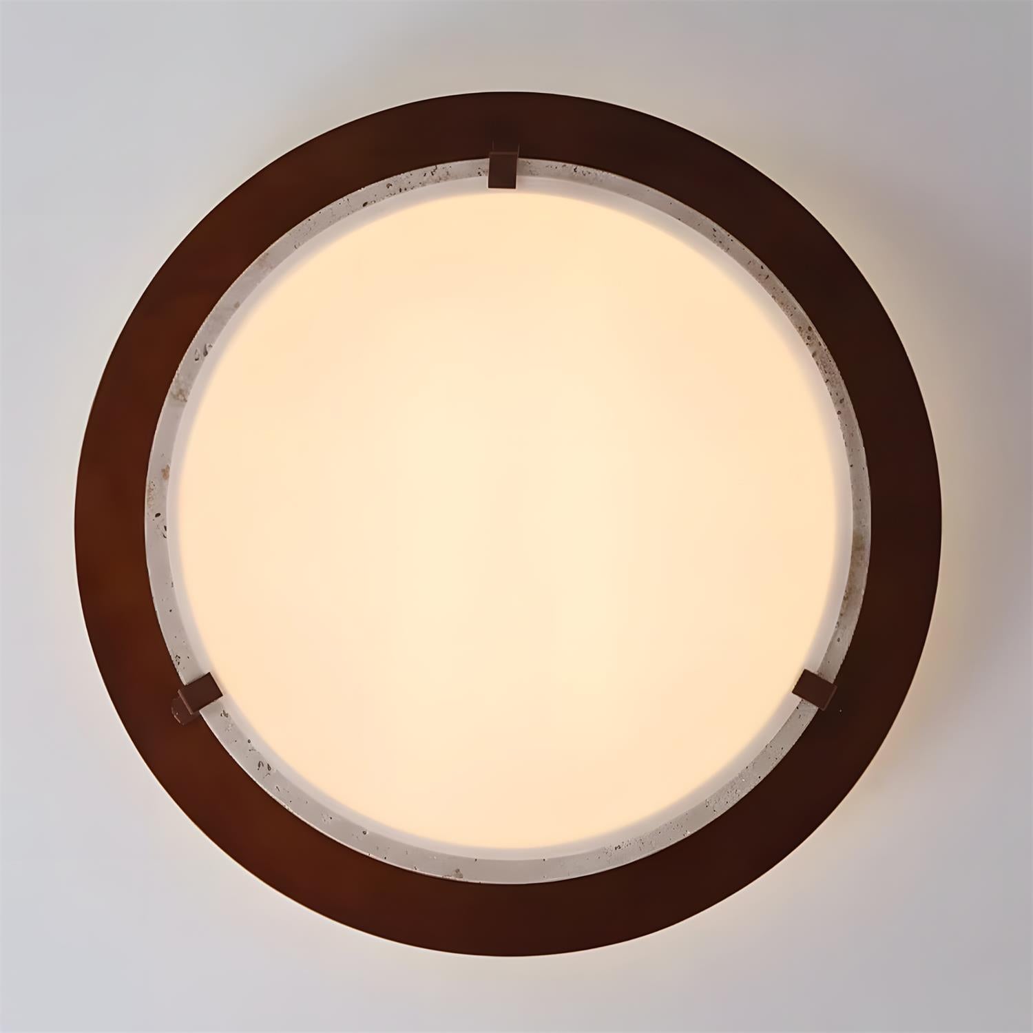 Cantera Ring Ceiling Lamp captures a quiet architectural elegance through its balanced circular form and refined material contrast. The warm ring frame gently embraces a travertine band, allowing the natural stone’s subtle pores and variations to become part of the design. Soft, even light diffuses downward, creating a calm ambient glow that feels grounded and understated.