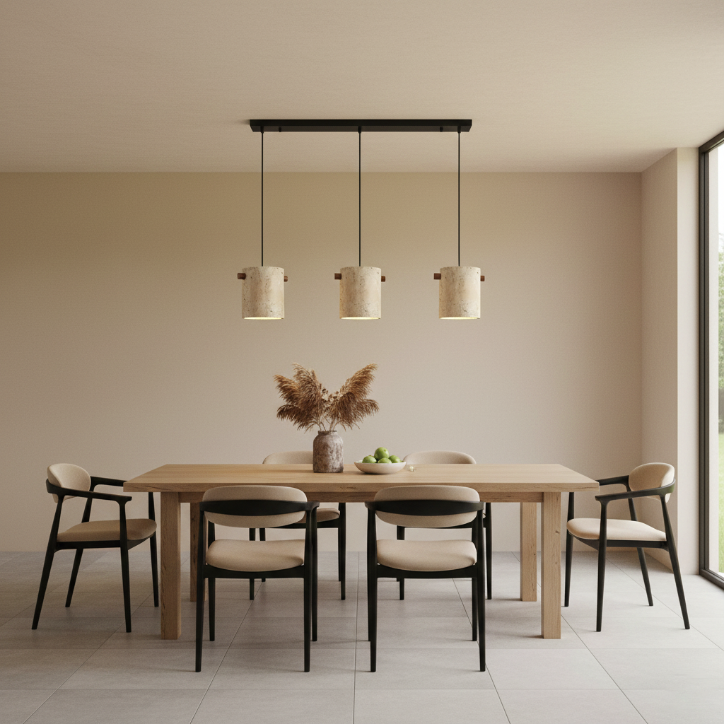 The Cibone Pendant Lamp celebrates the beauty of raw materials with a refined, architectural sensibility. Its cylindrical travertine shade, subtly textured and naturally toned, is punctuated by horizontal wooden accents that add both structural interest and warmth. Suspended by a minimalist black cord, this pendant strikes a perfect balance between rustic texture and modern restraint. Quietly bold, it’s a piece that speaks in clean lines and timeless materials.